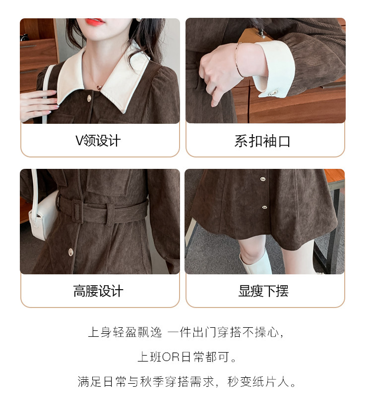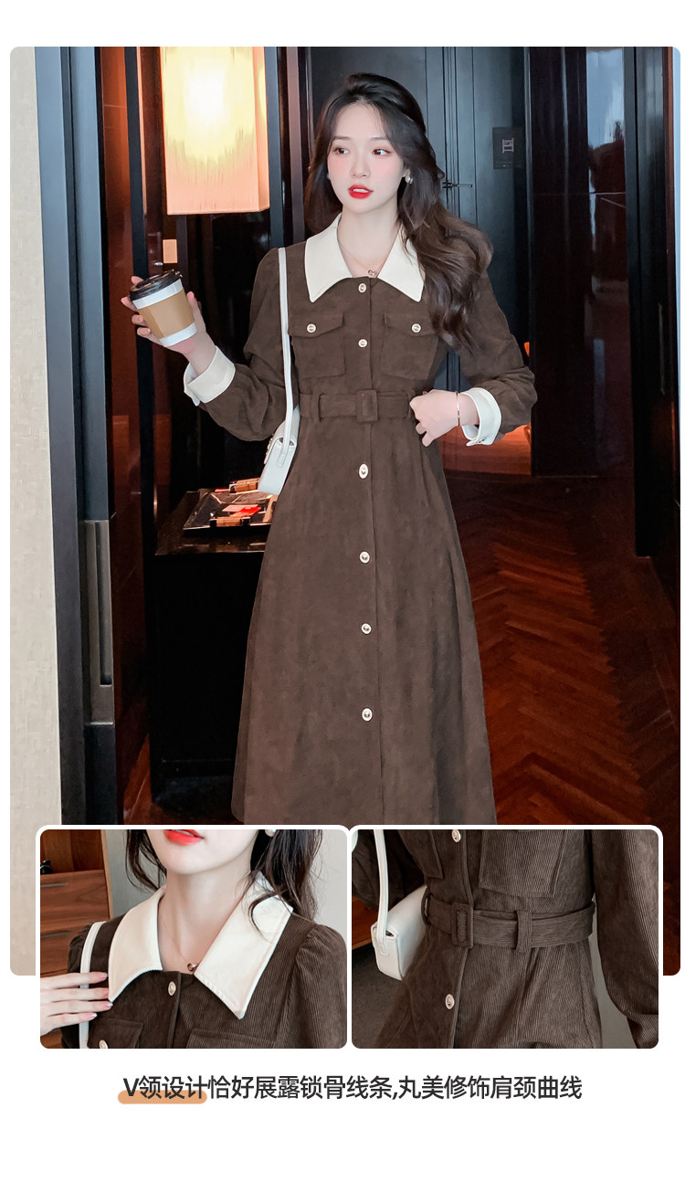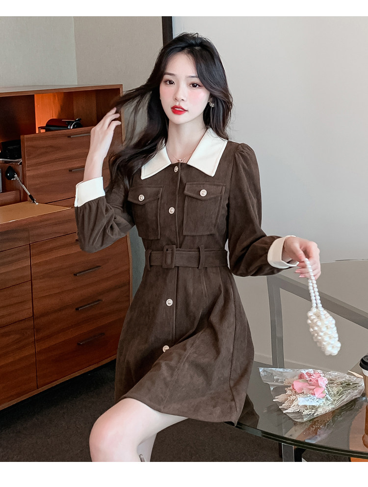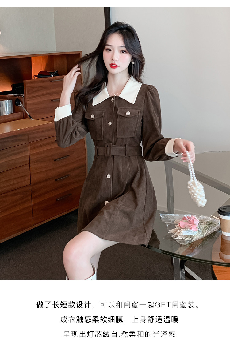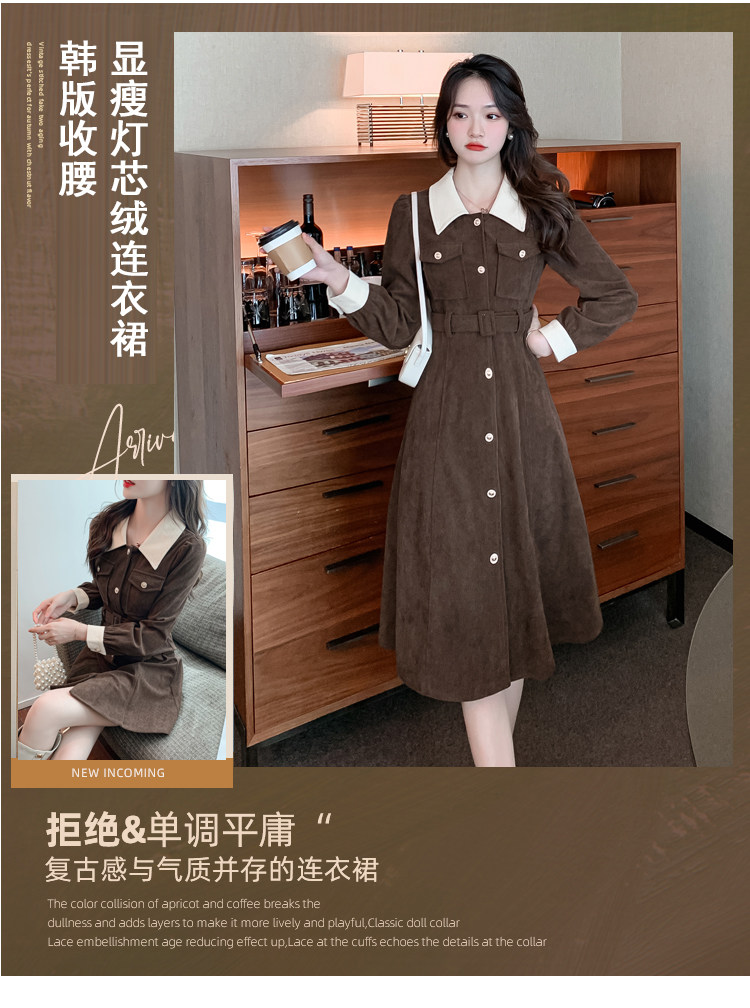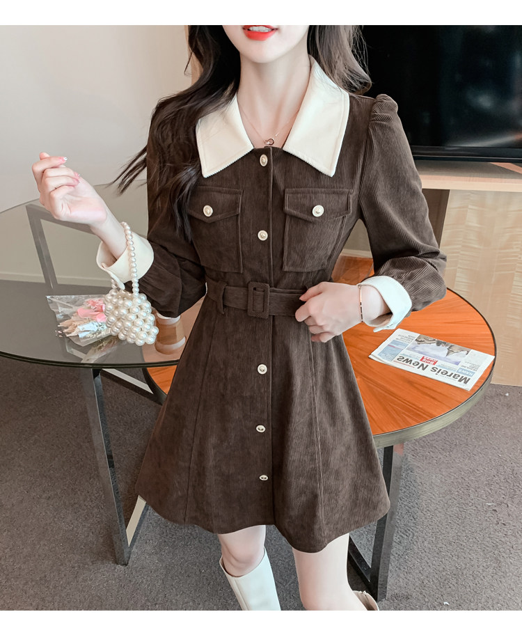 RM25858#实拍法式连衣裙女2023秋冬韩版收腰显瘦灯芯绒气质撞色裙子女潮