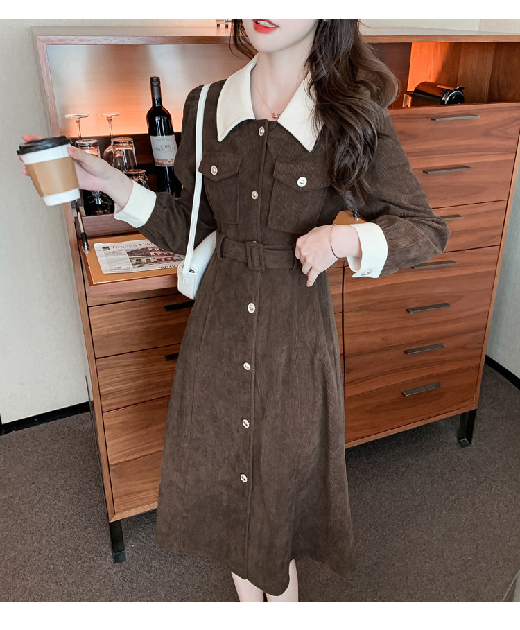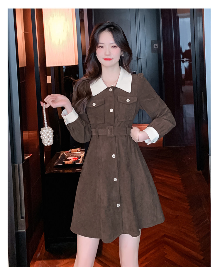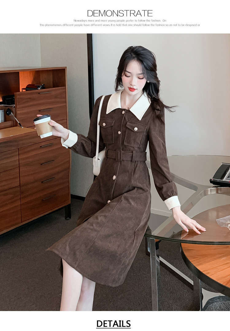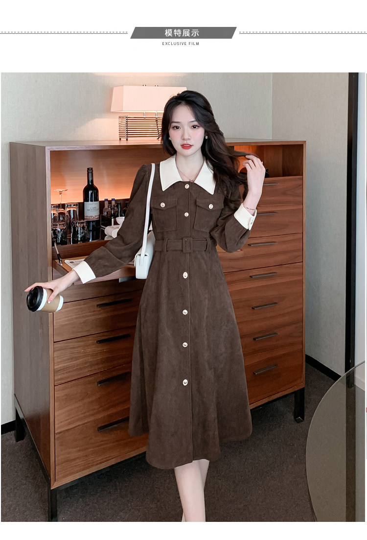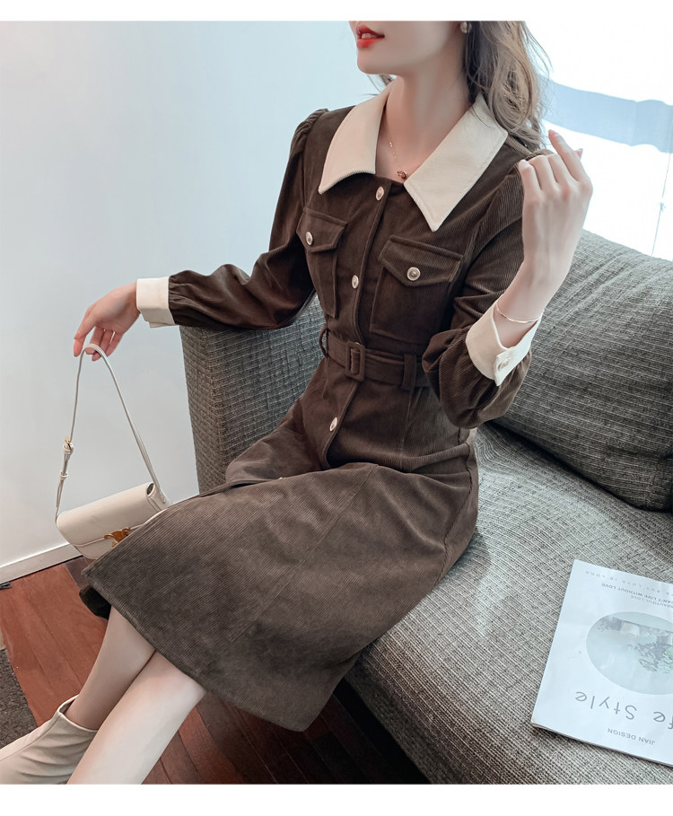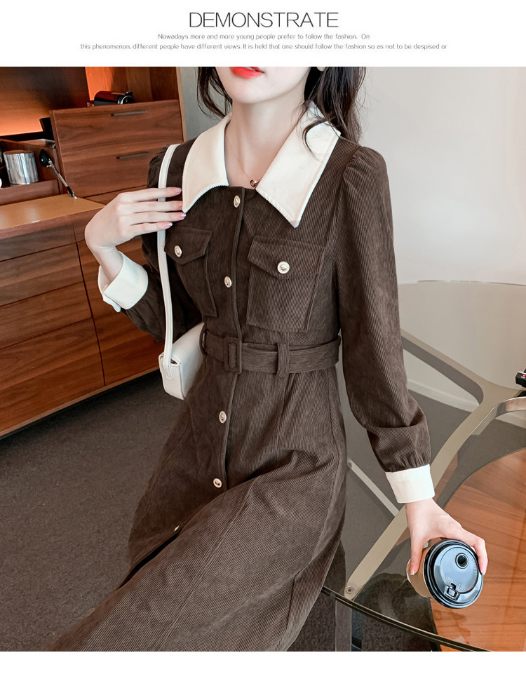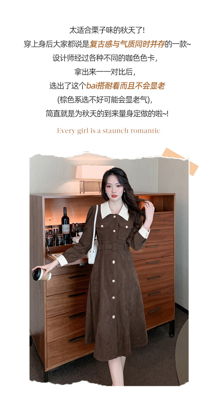RM25858#实拍法式连衣裙女2023秋冬韩版收腰显瘦灯芯绒气质撞色裙子女潮