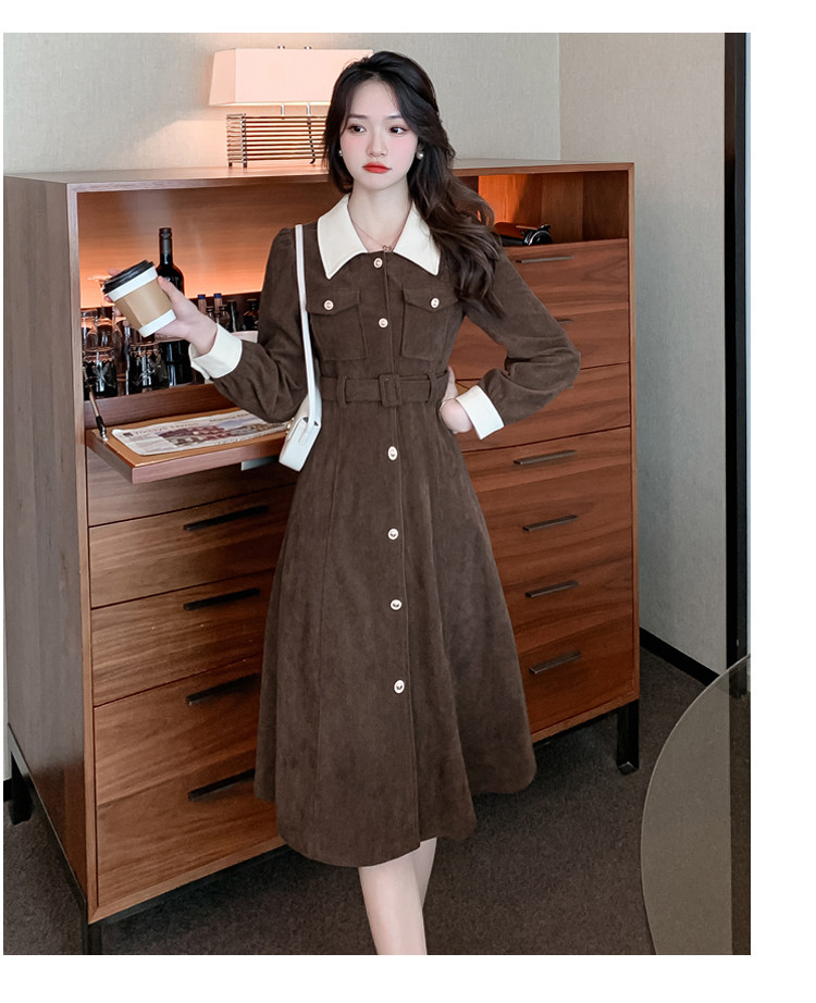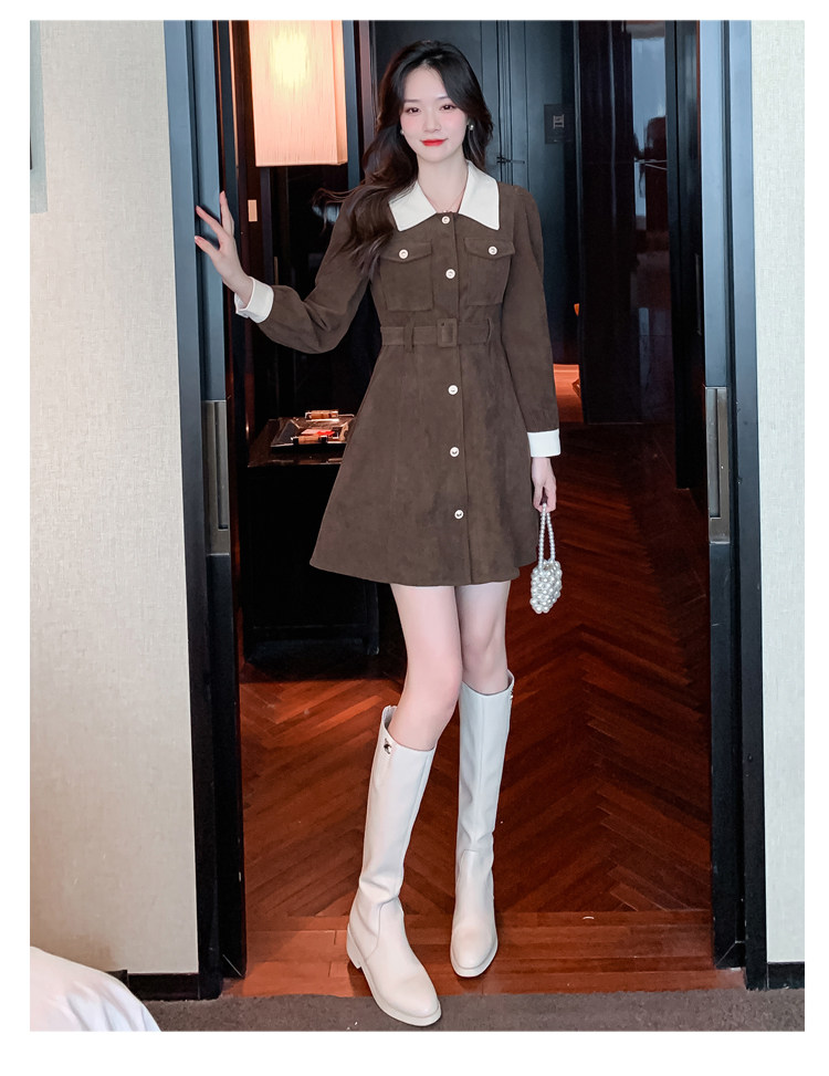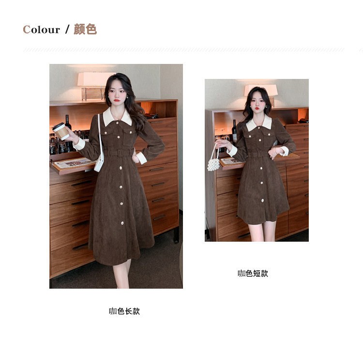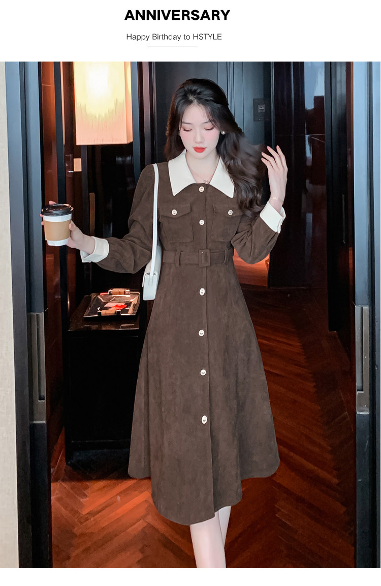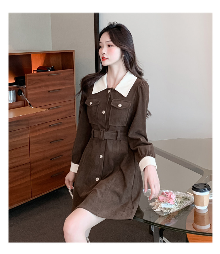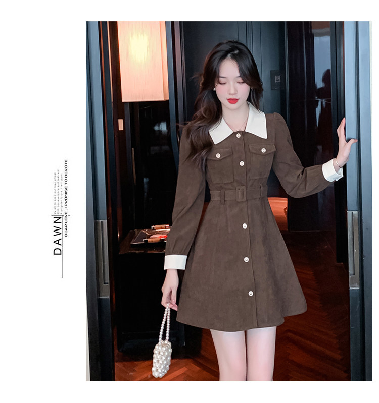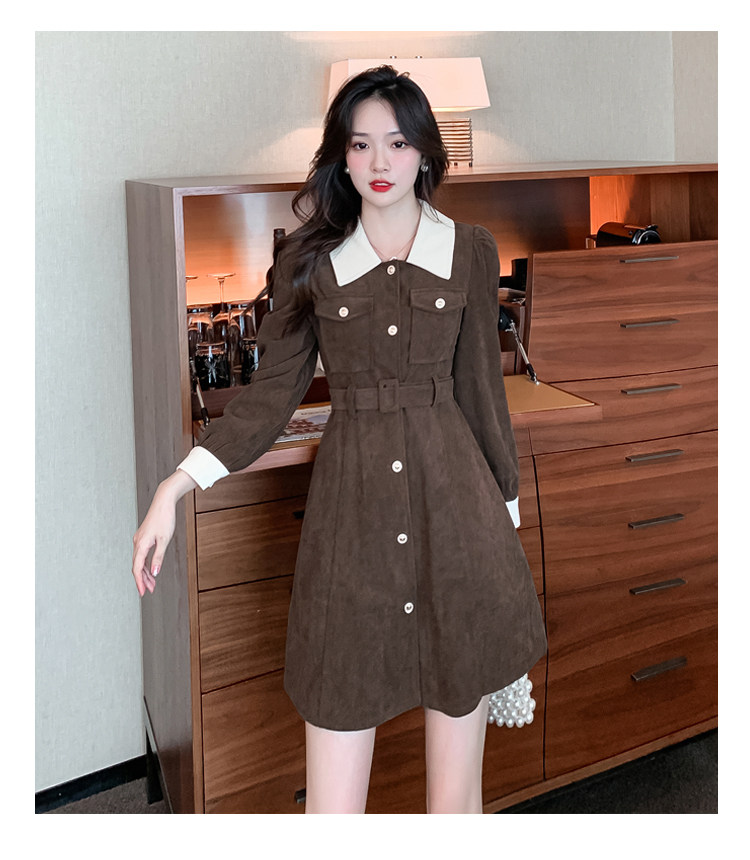 RM25858#实拍法式连衣裙女2023秋冬韩版收腰显瘦灯芯绒气质撞色裙子女潮