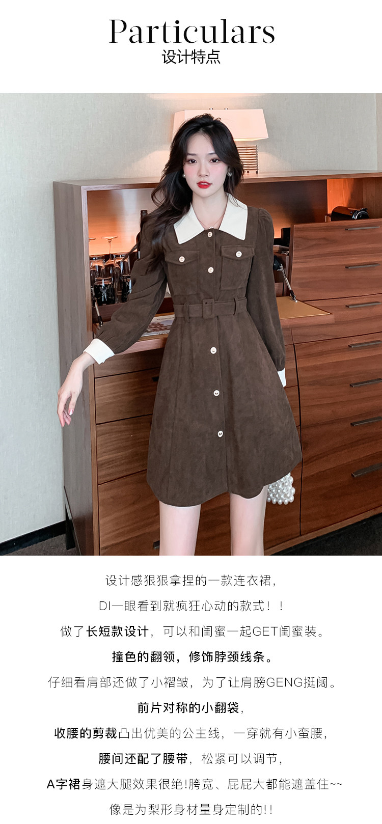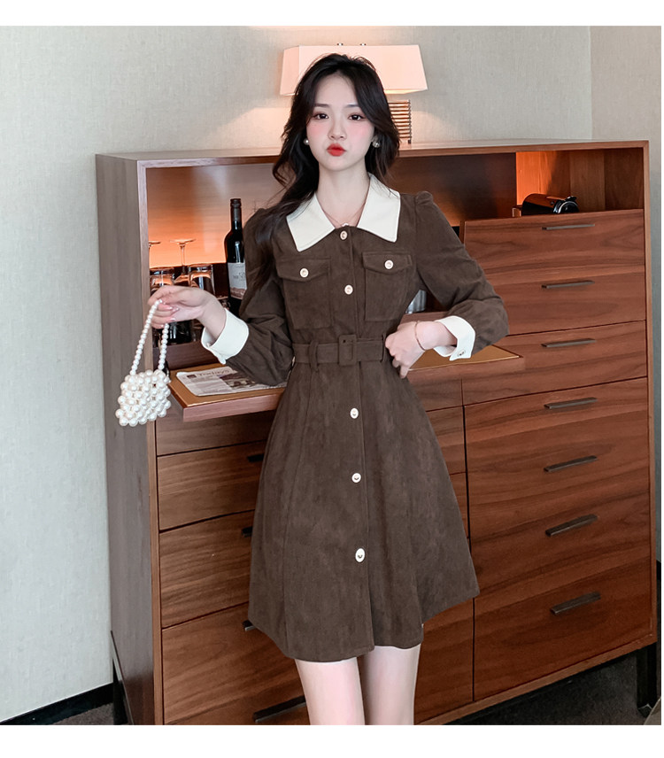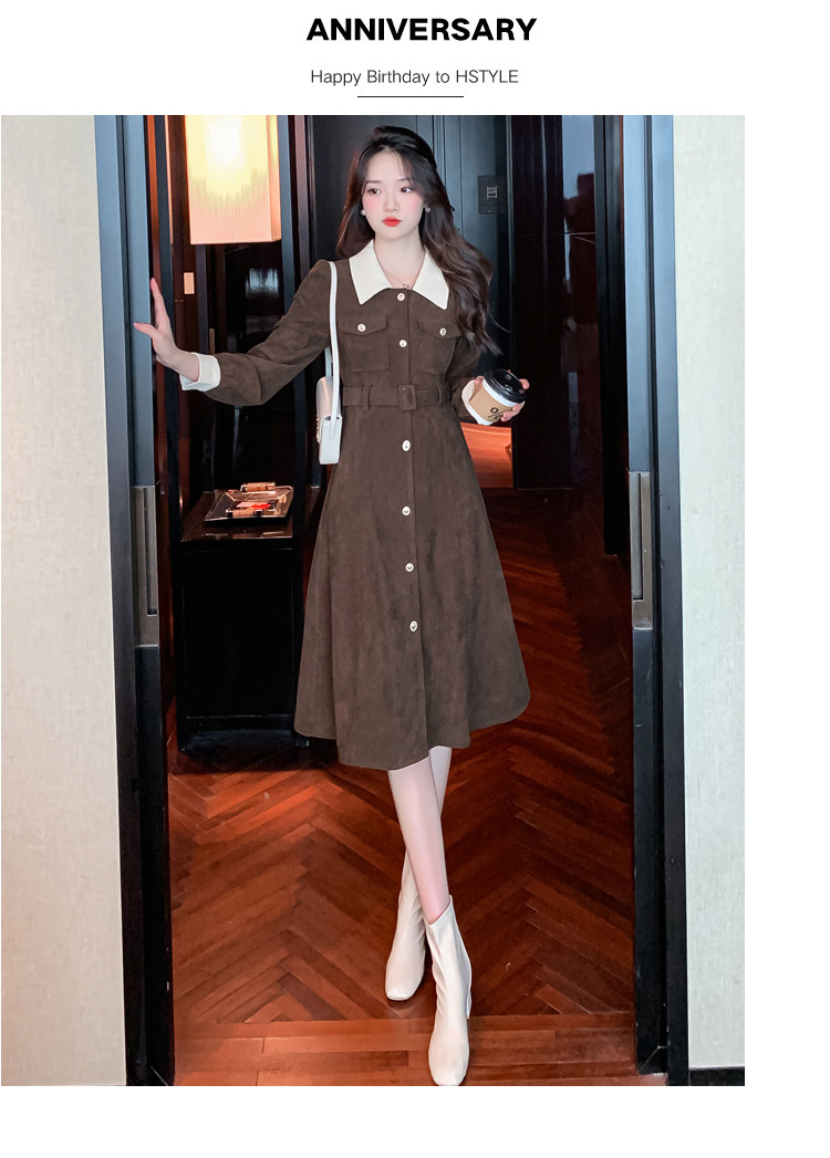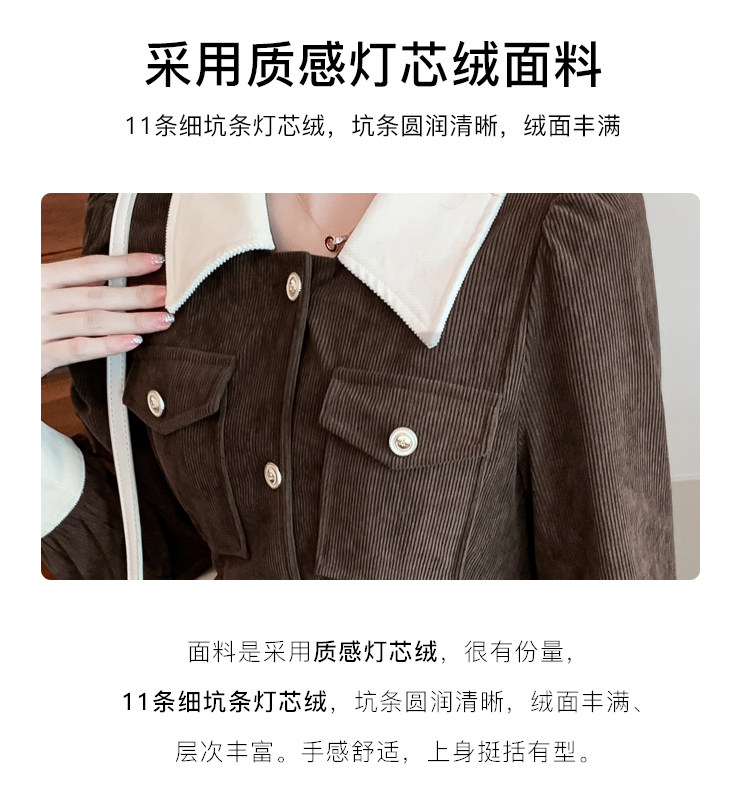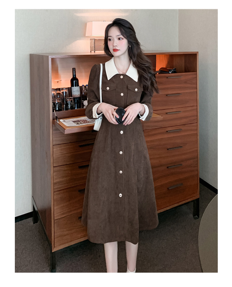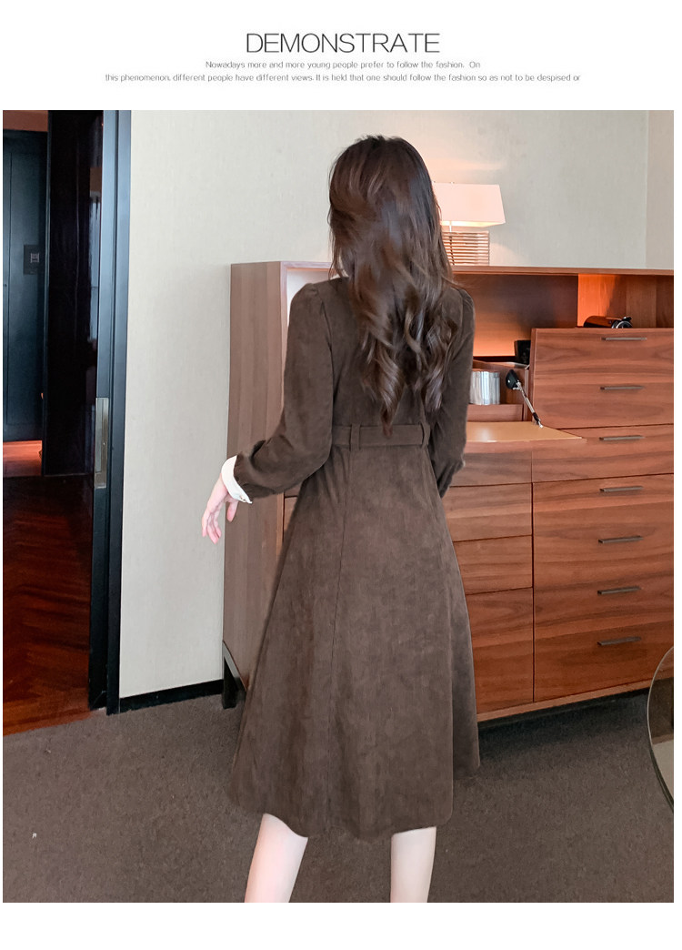 RM25858#实拍法式连衣裙女2023秋冬韩版收腰显瘦灯芯绒气质撞色裙子女潮
