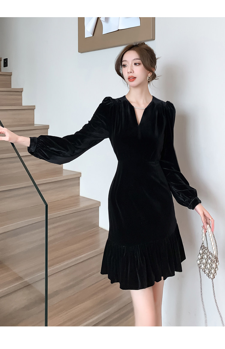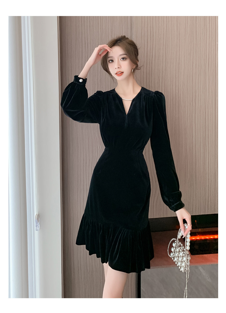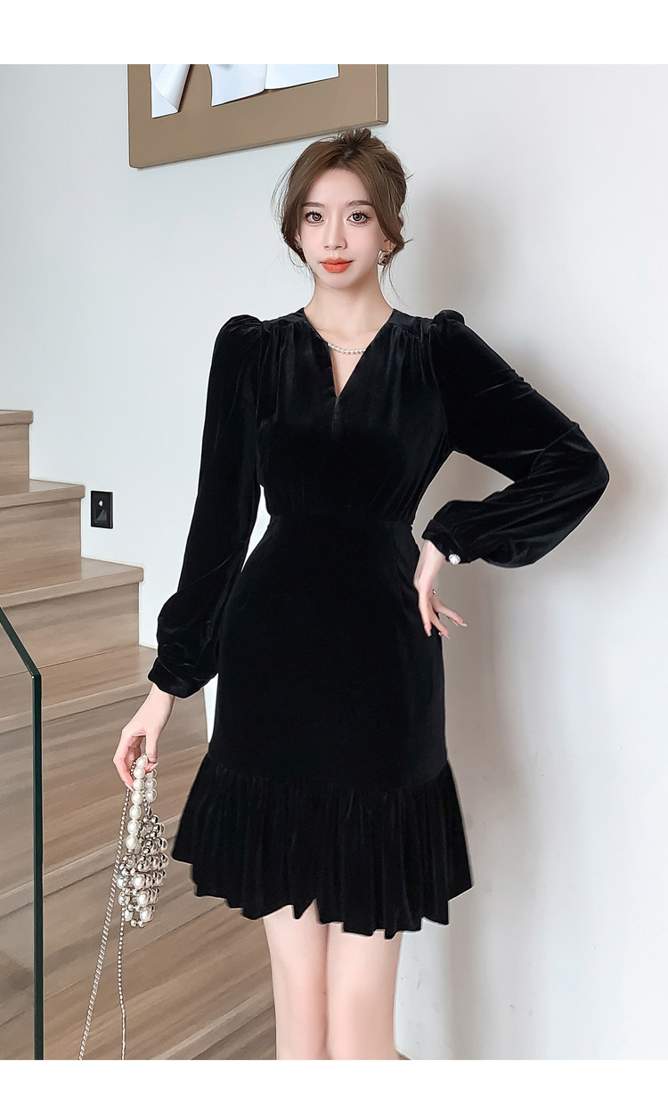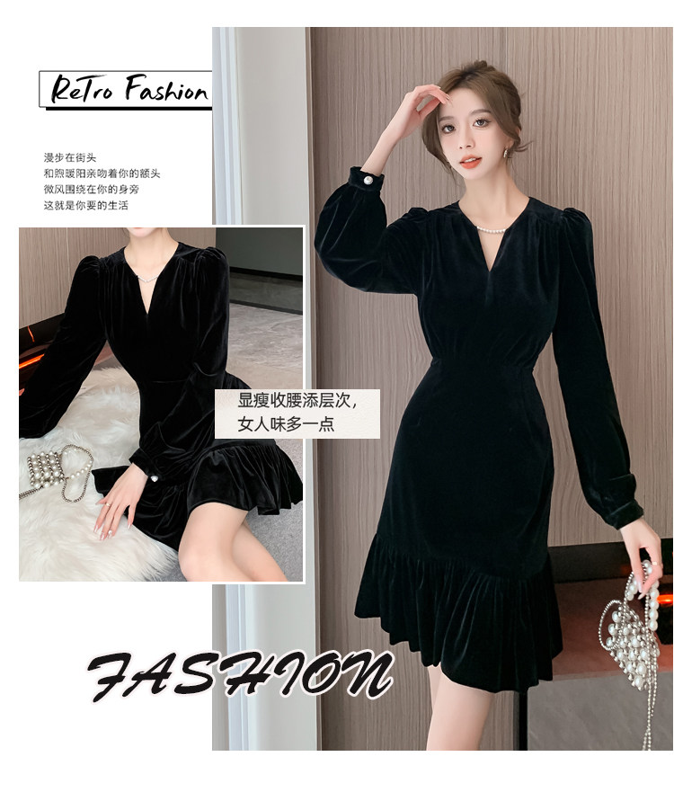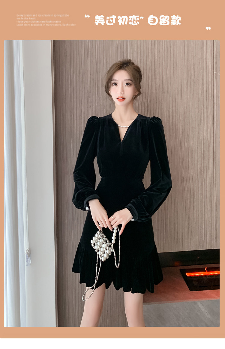 RM25859#秋冬新款高级显瘦小黑裙丝绒连衣裙