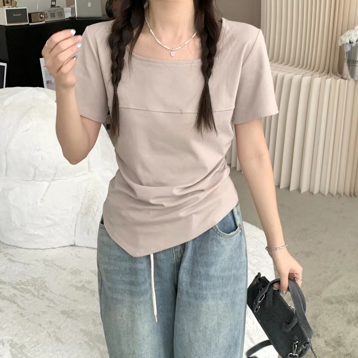 RM13076#丝巾短袖洋气小衫上衣2023夏季新款女T恤简约气质优雅衬衫