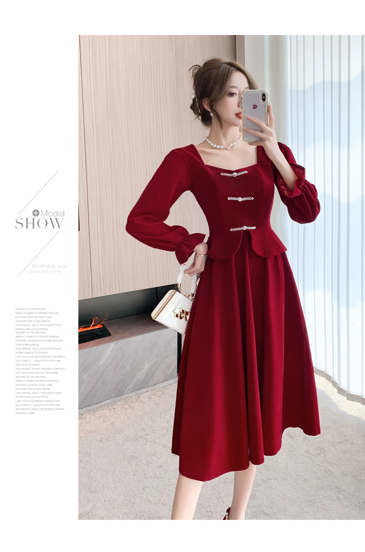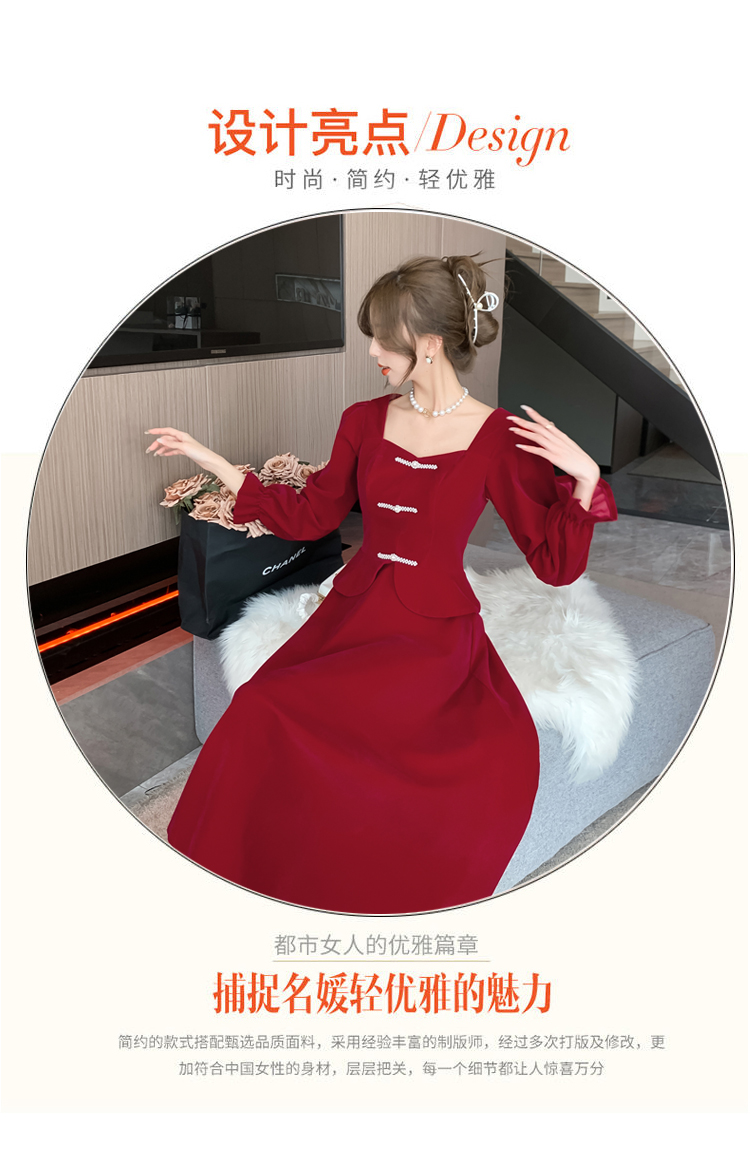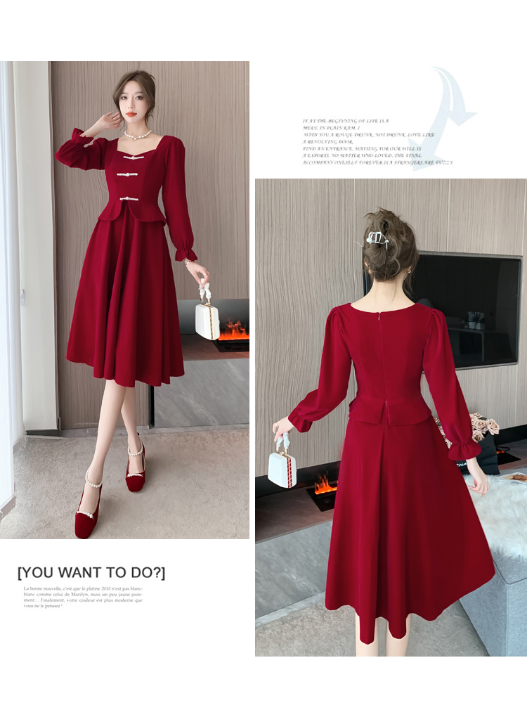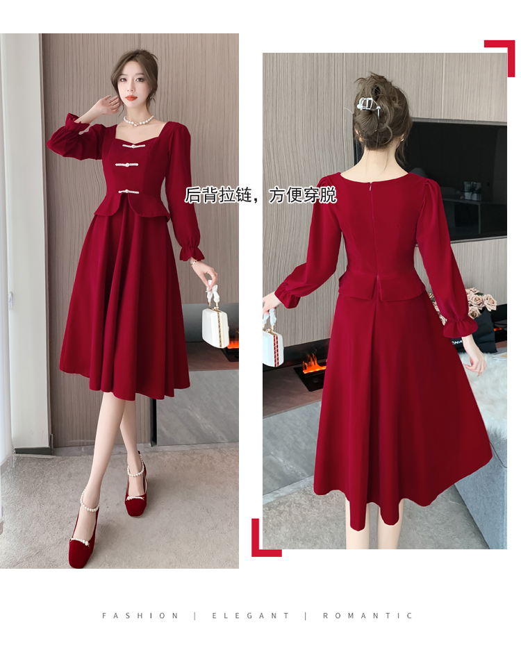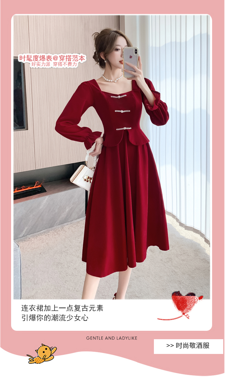 RM25873#丝绒敬酒服新娘2023秋冬季长袖订婚连衣裙小个子回门礼服裙酒红色