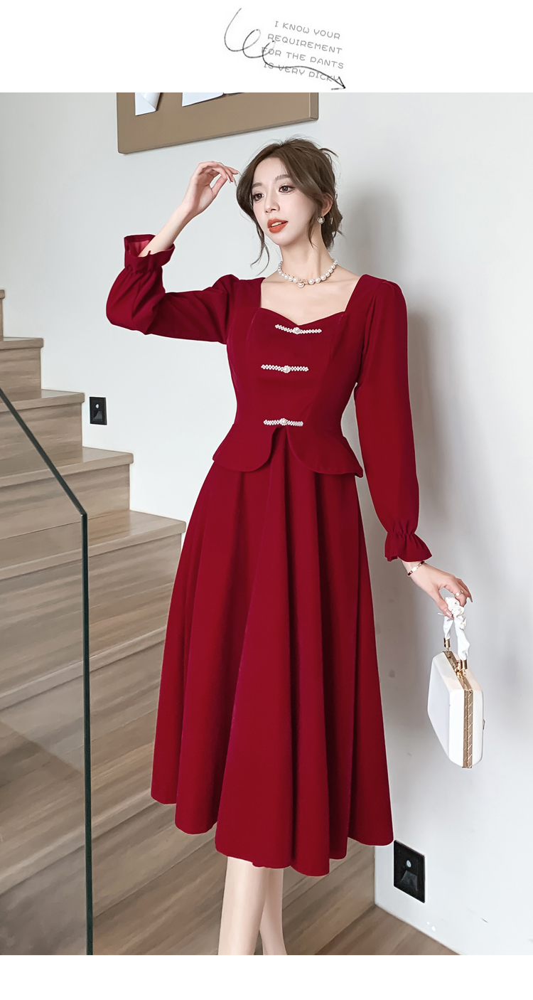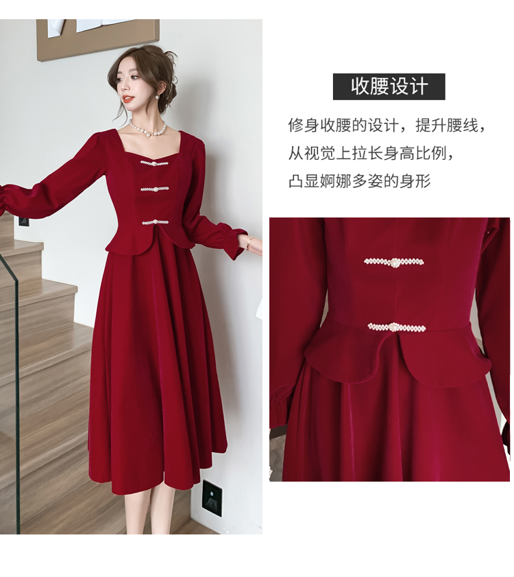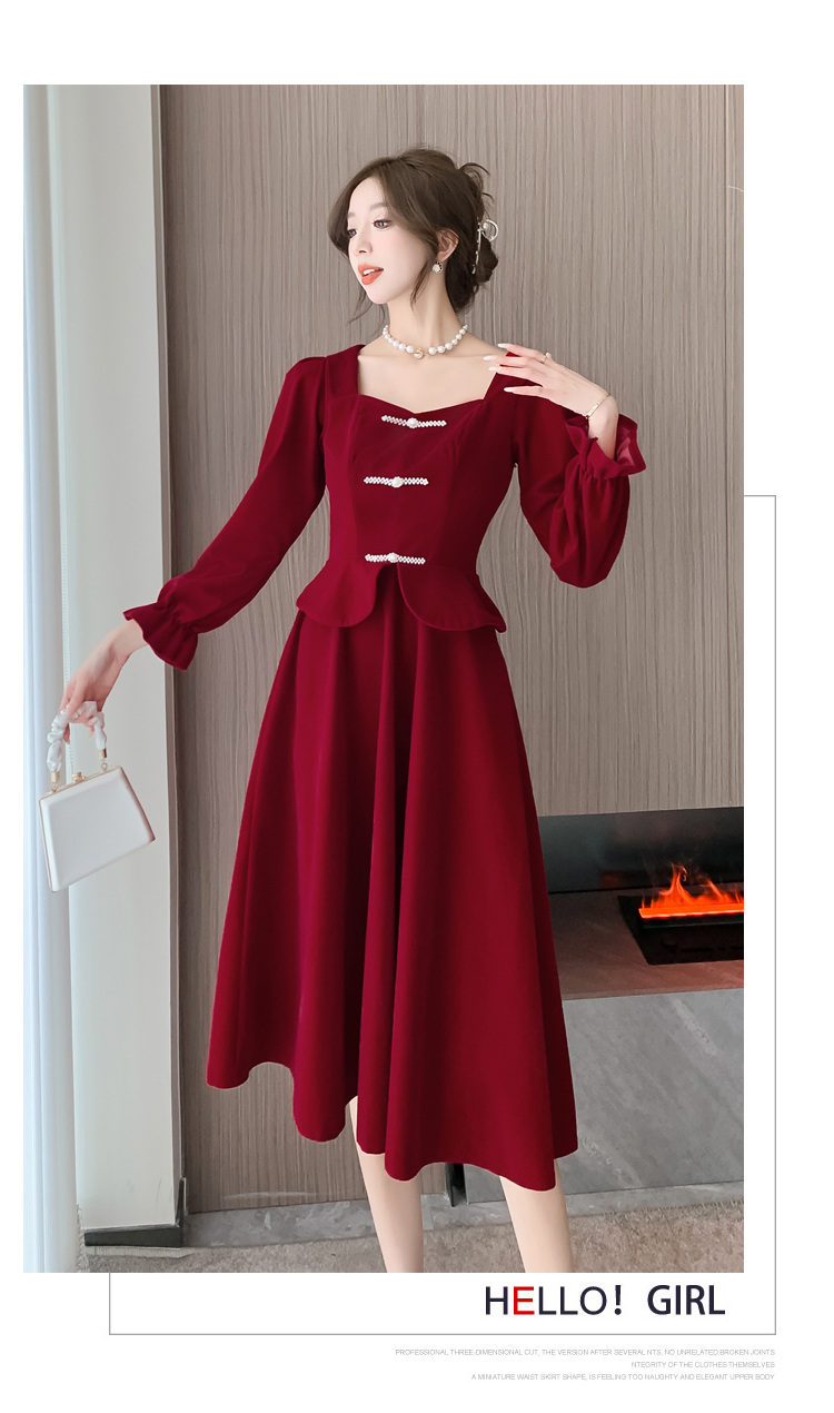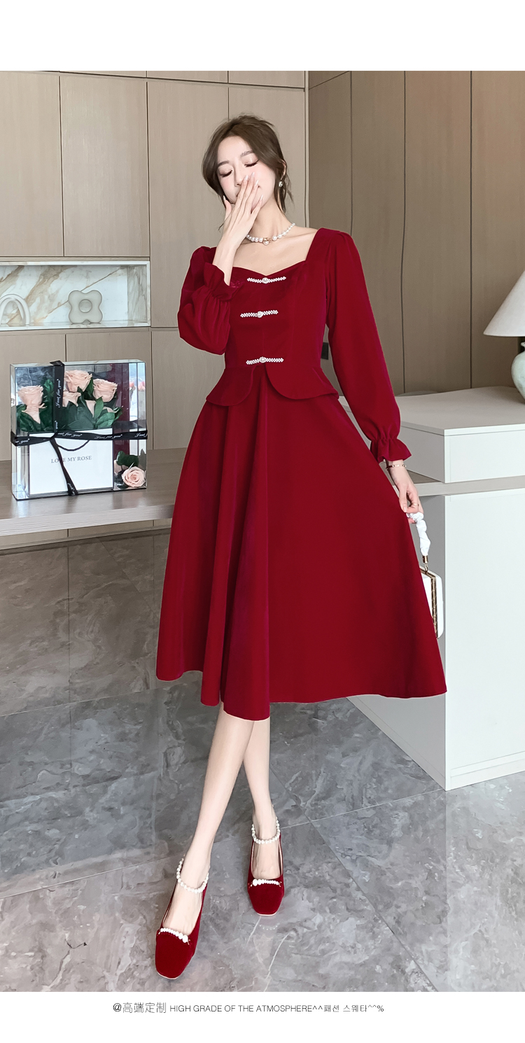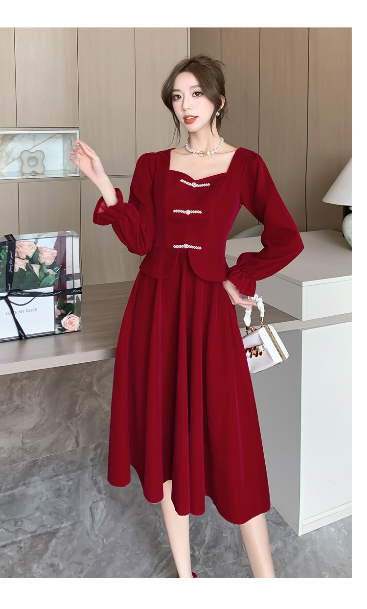RM25873#丝绒敬酒服新娘2023秋冬季长袖订婚连衣裙小个子回门礼服裙酒红色