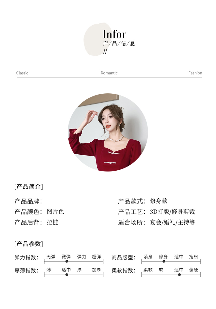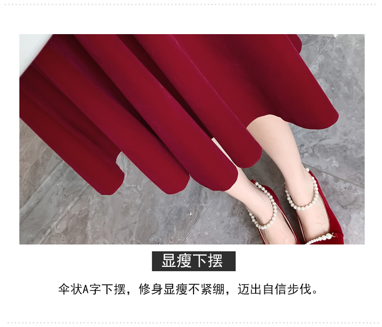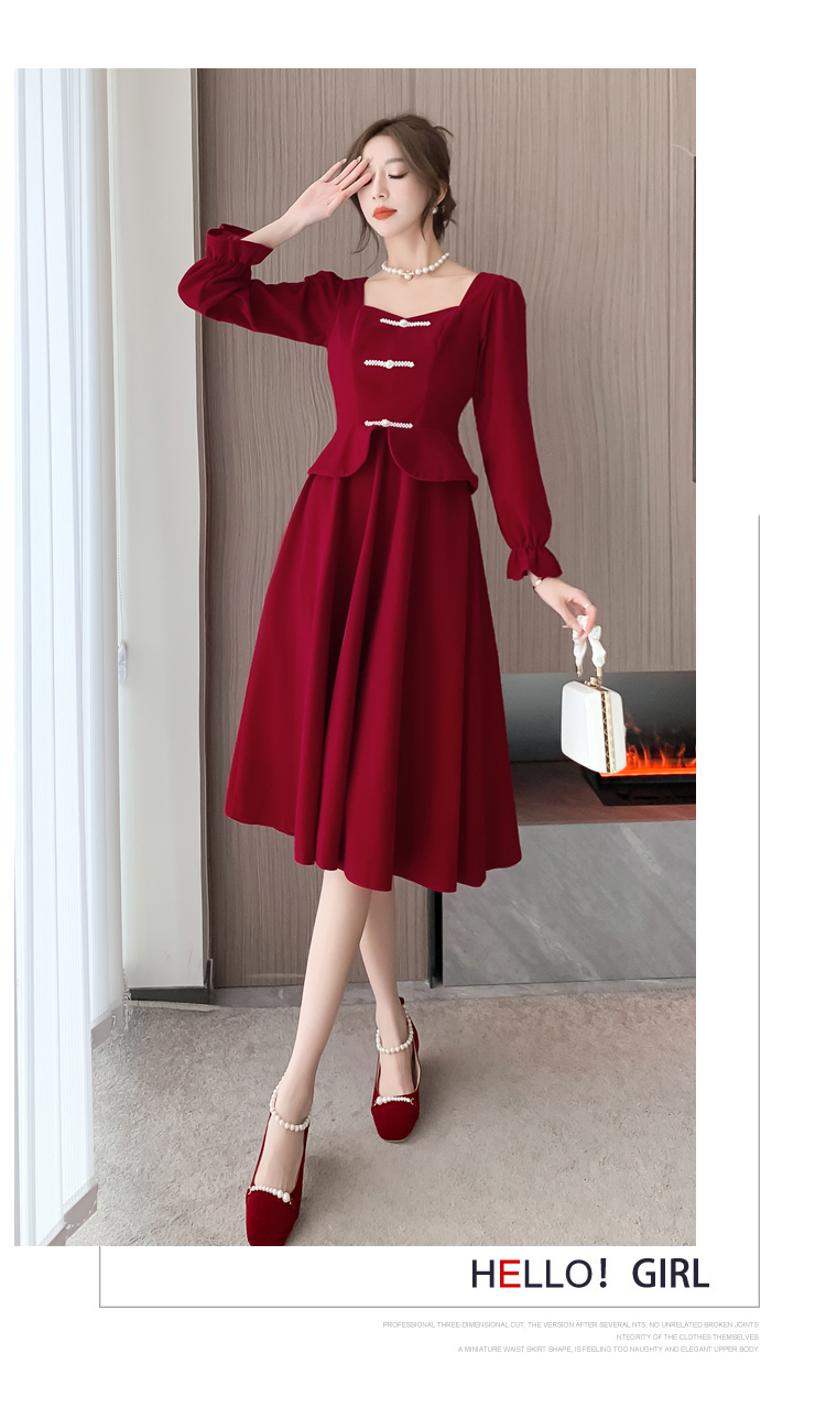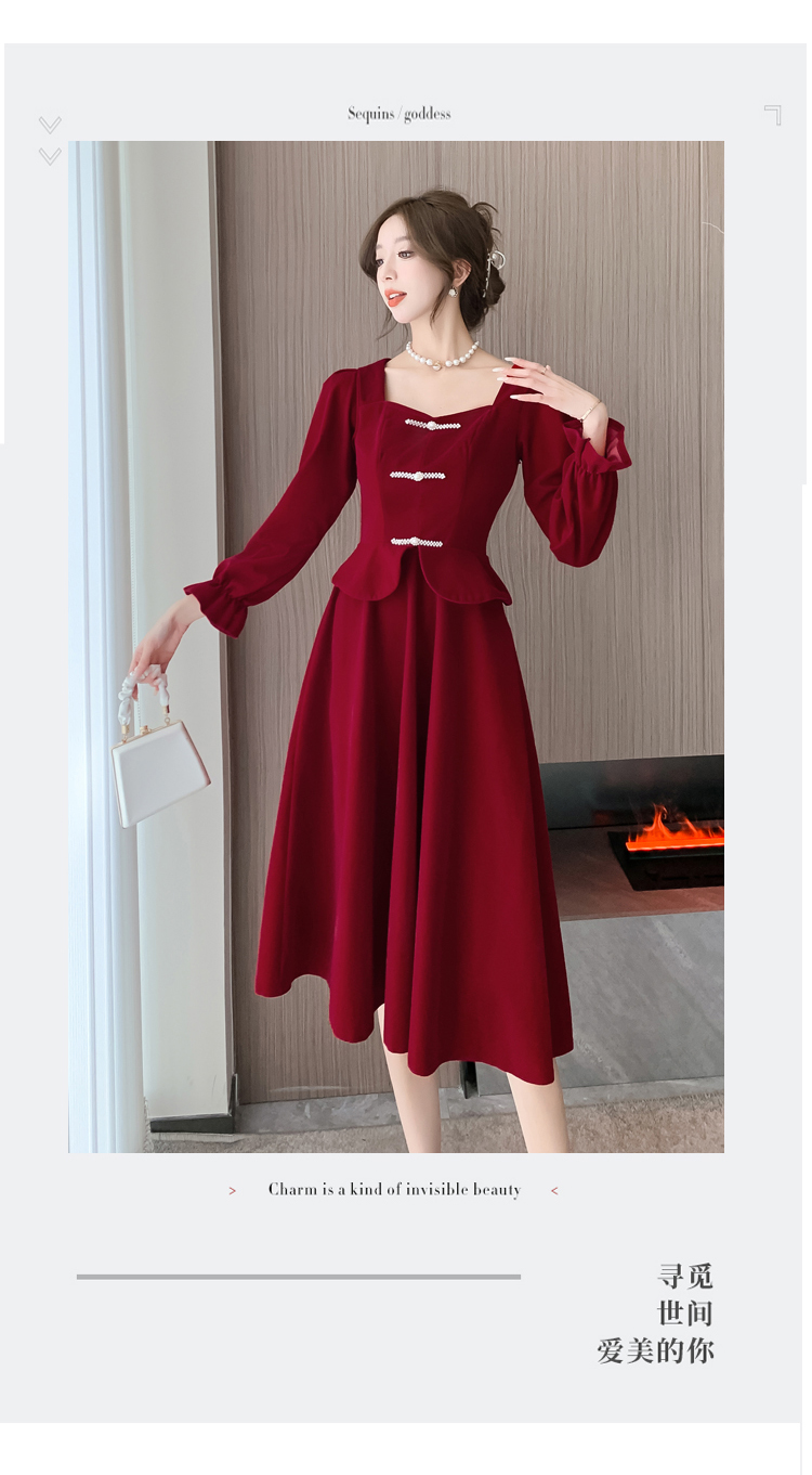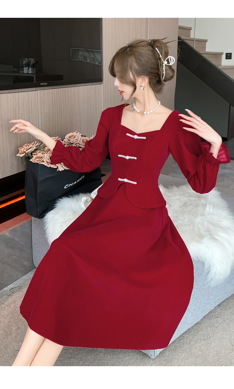 RM25873#丝绒敬酒服新娘2023秋冬季长袖订婚连衣裙小个子回门礼服裙酒红色