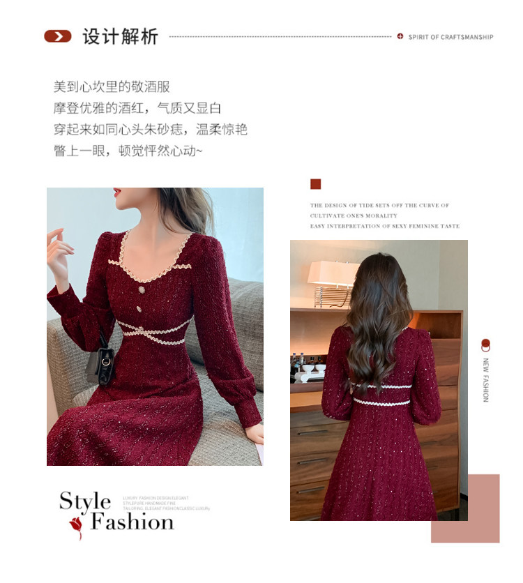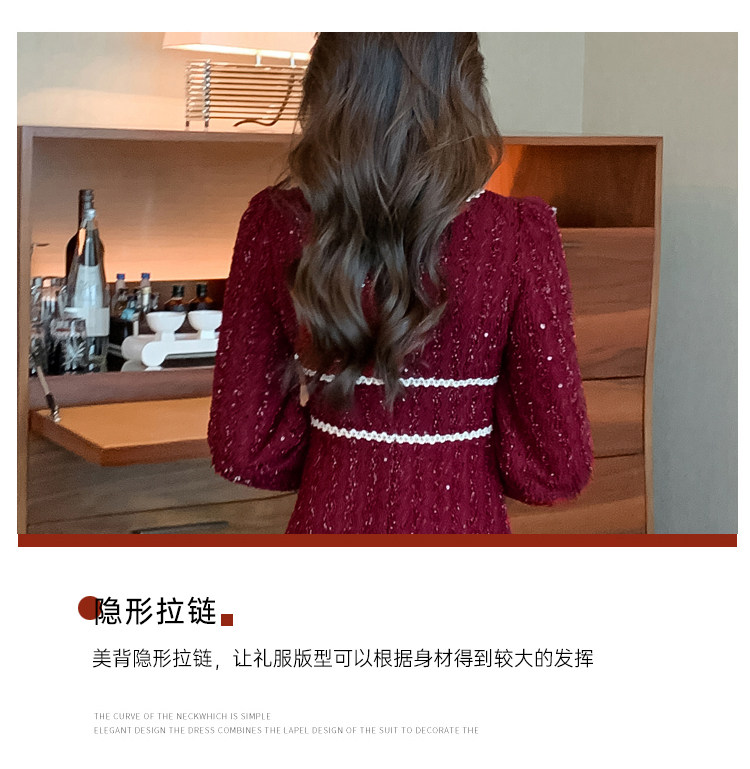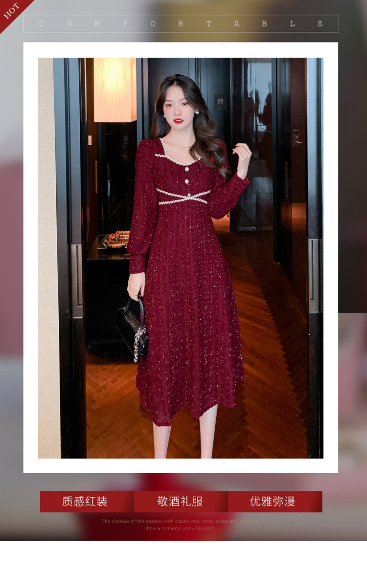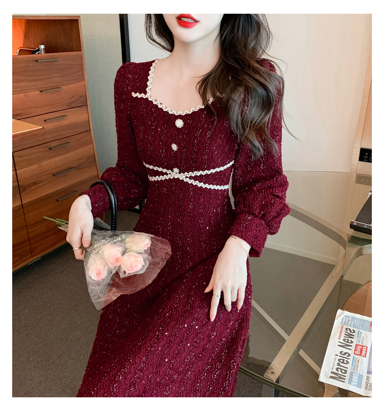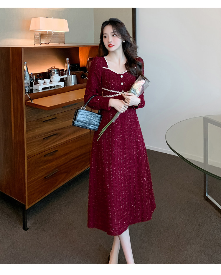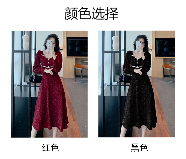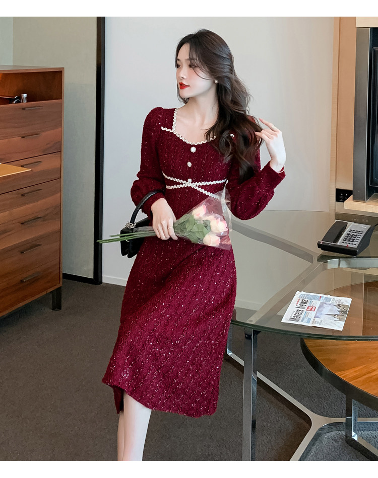 RM25888#红色小香风连衣裙女2023年秋冬新款法式喜庆显瘦方领长裙
