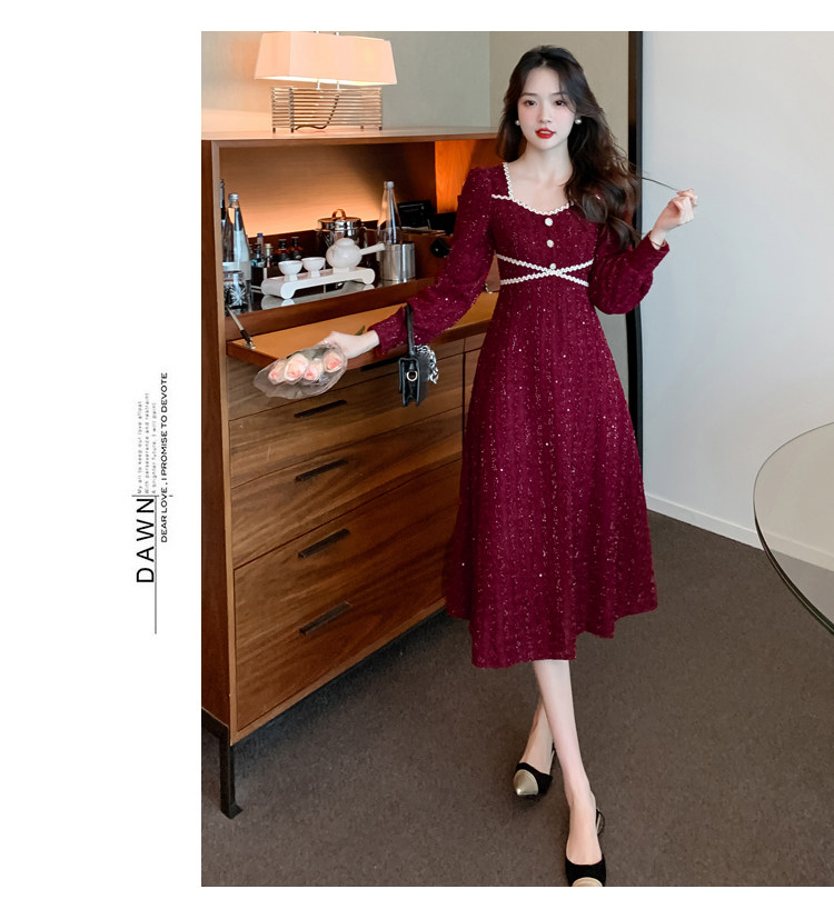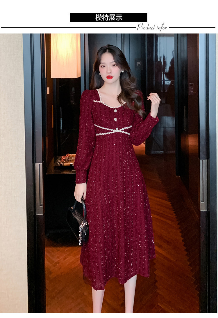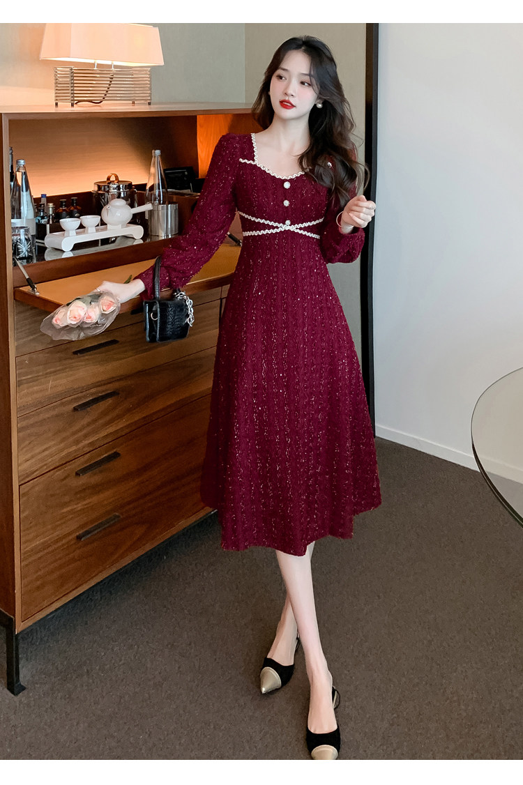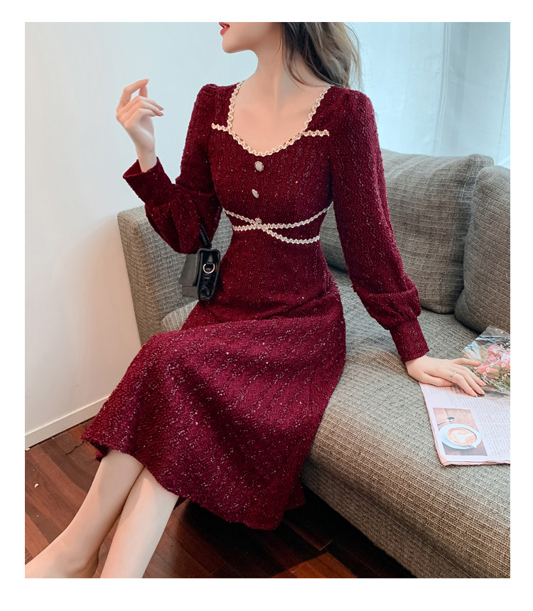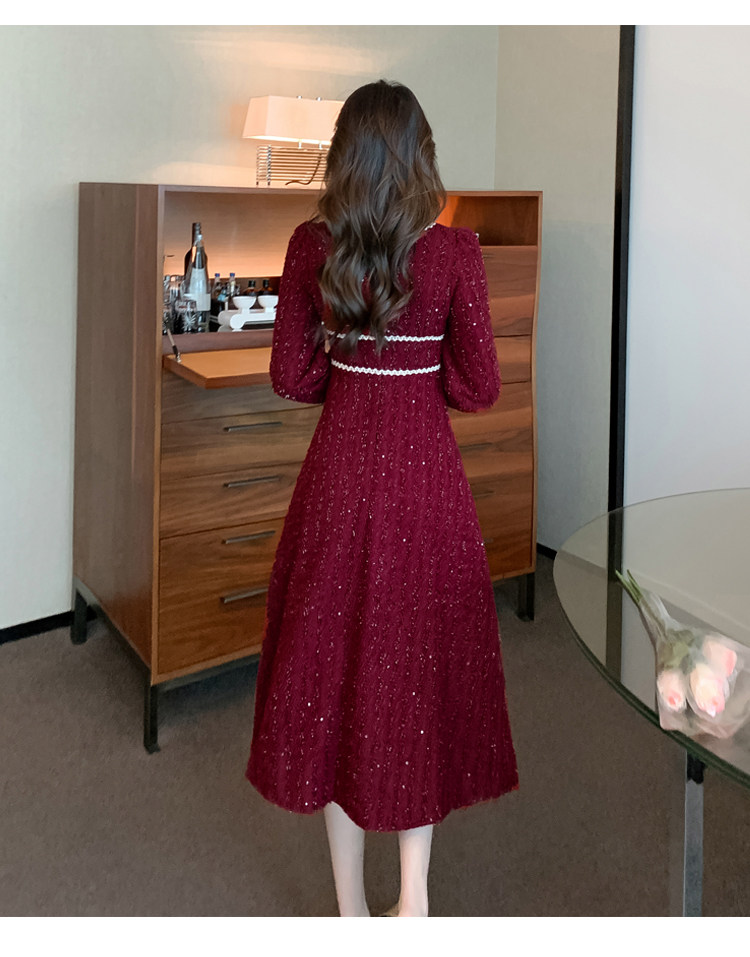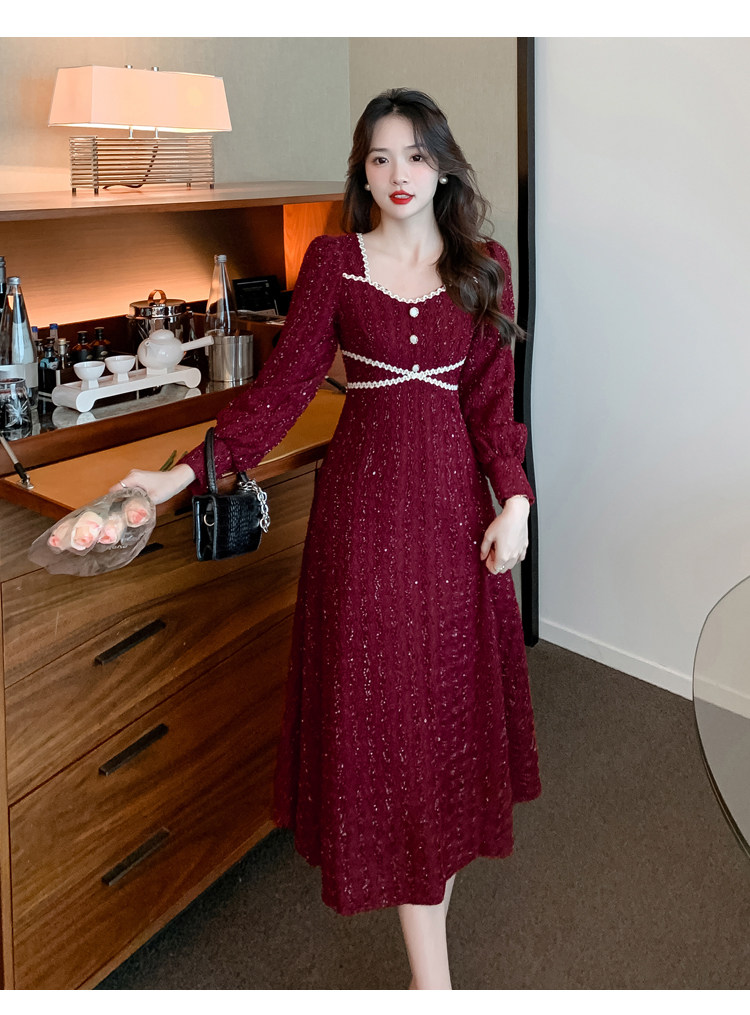 RM25888#红色小香风连衣裙女2023年秋冬新款法式喜庆显瘦方领长裙