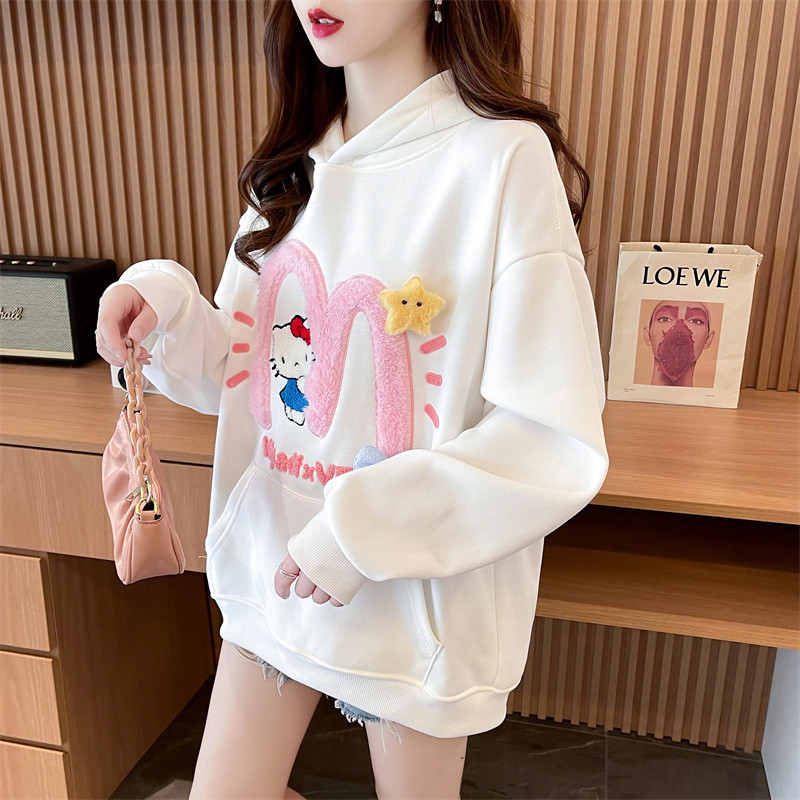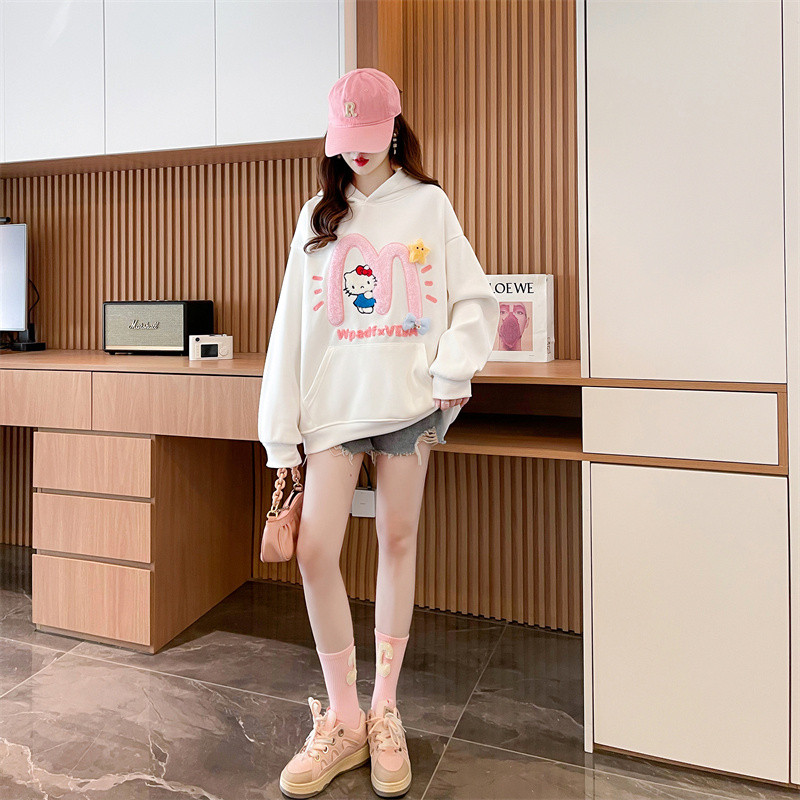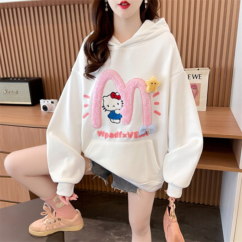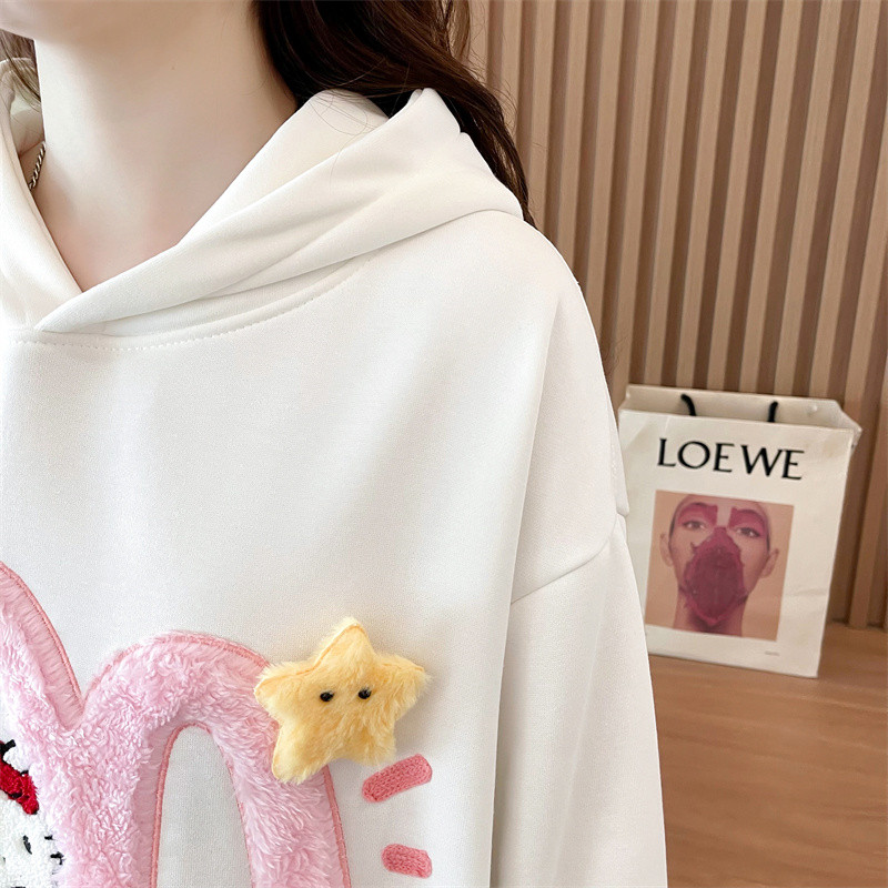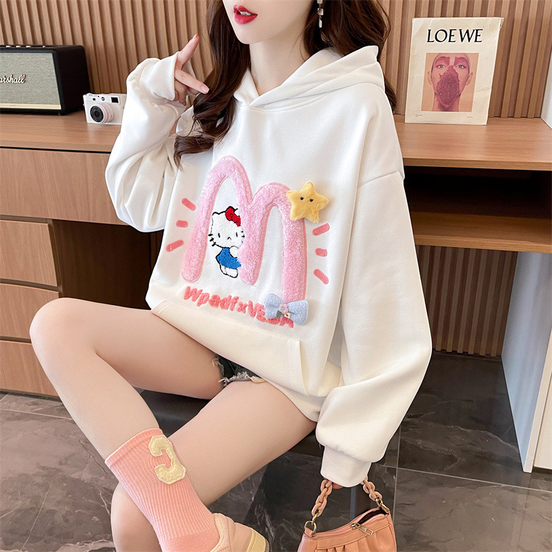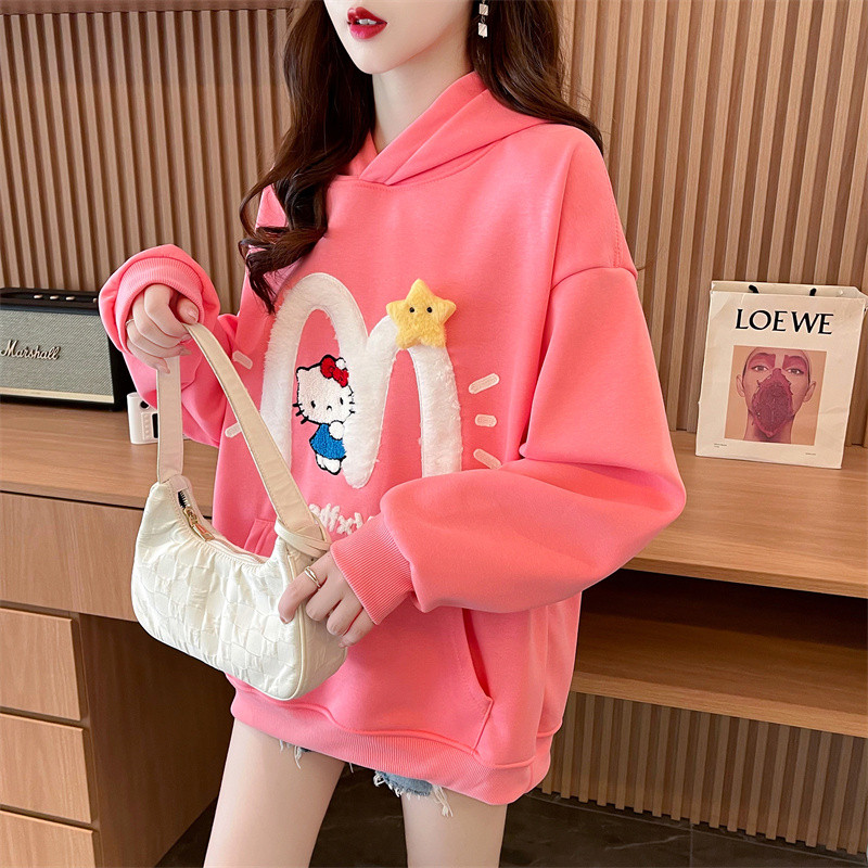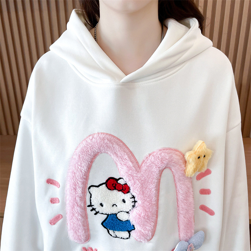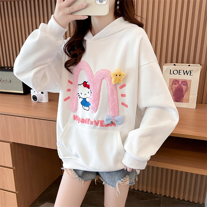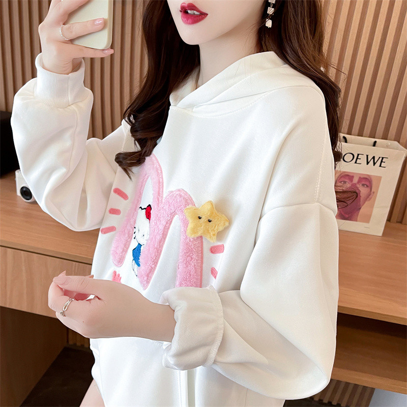 RM25923#纯棉面复合牛奶丝 HelloKitty毛绒刺绣连帽薄款卫衣女秋冬季