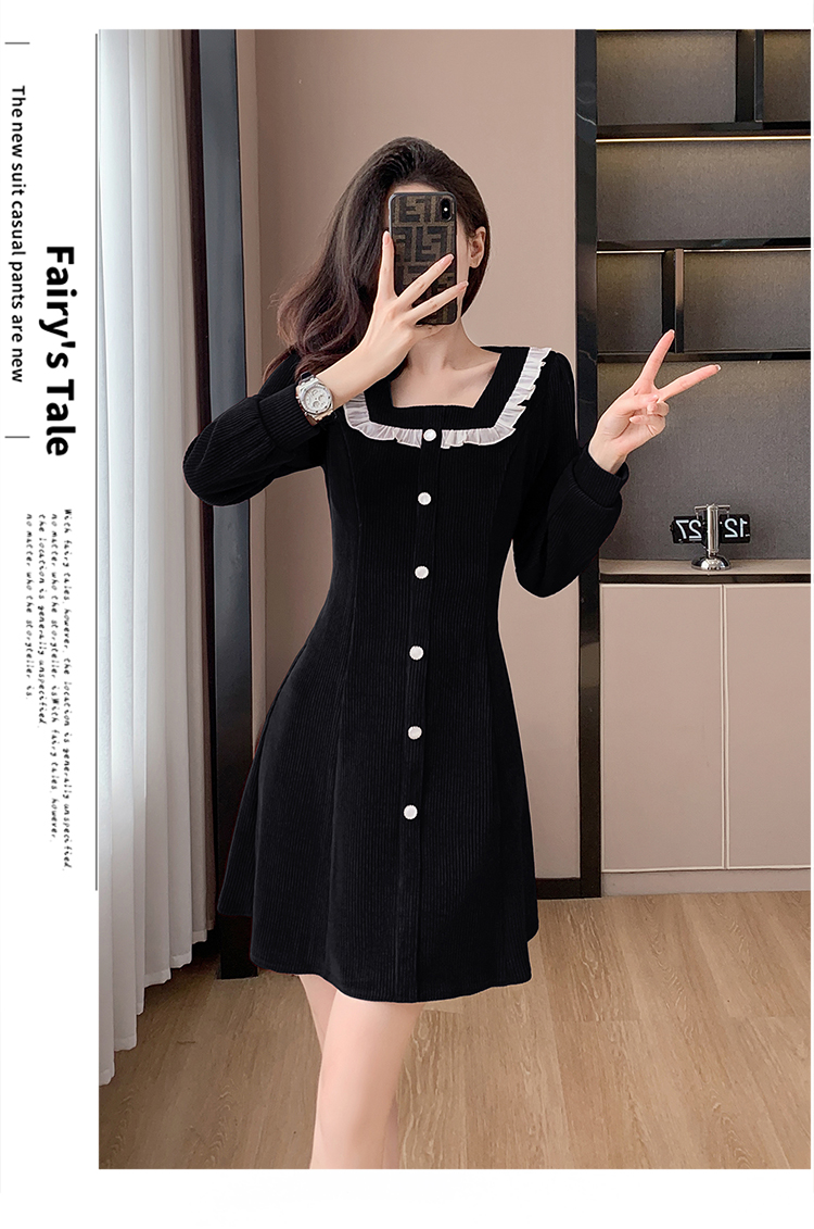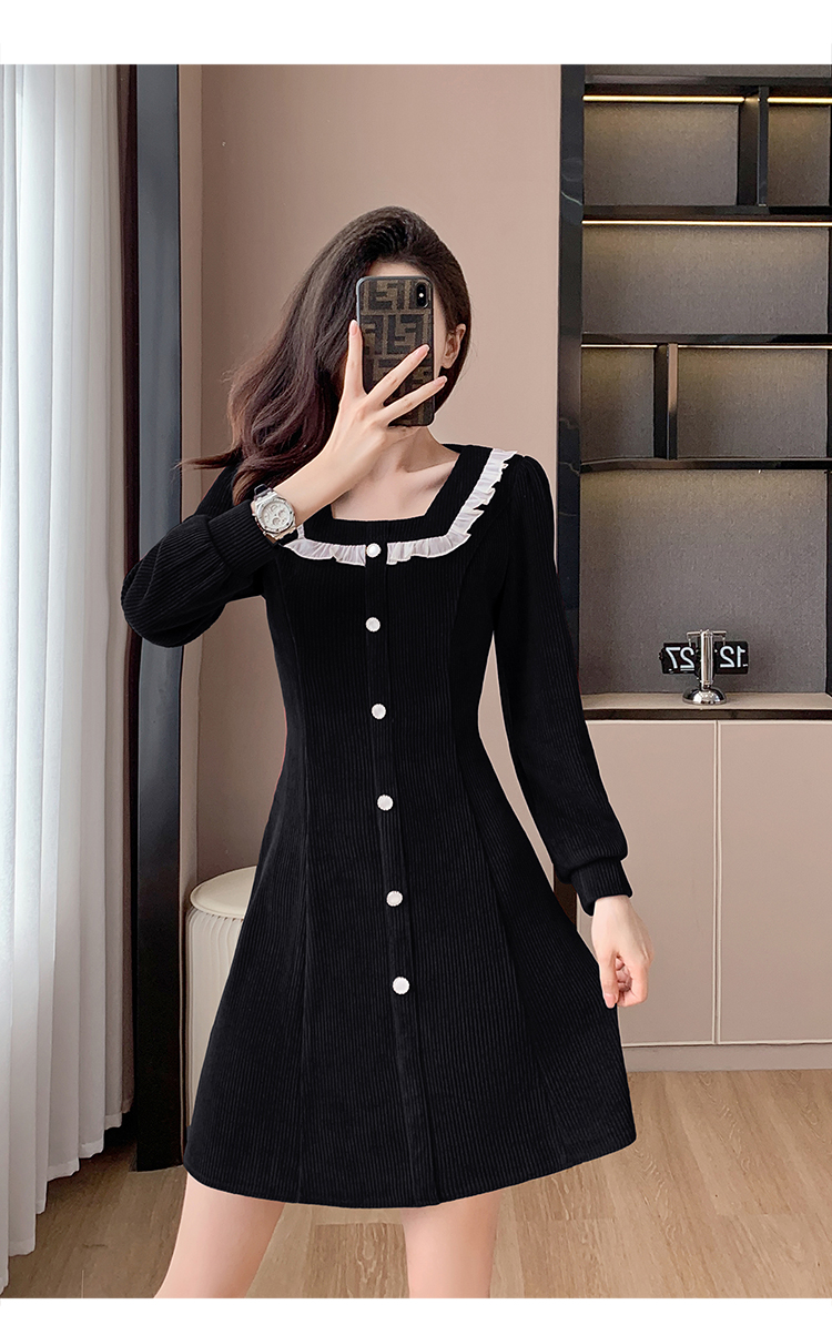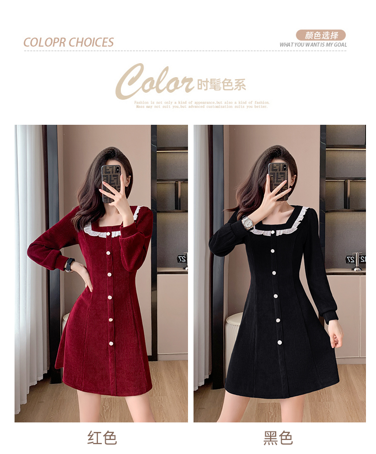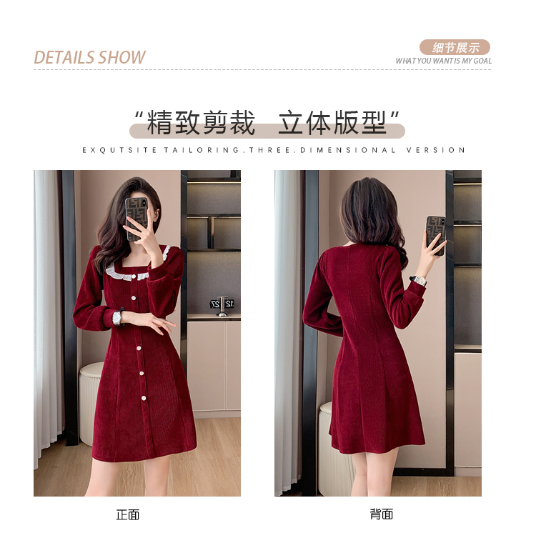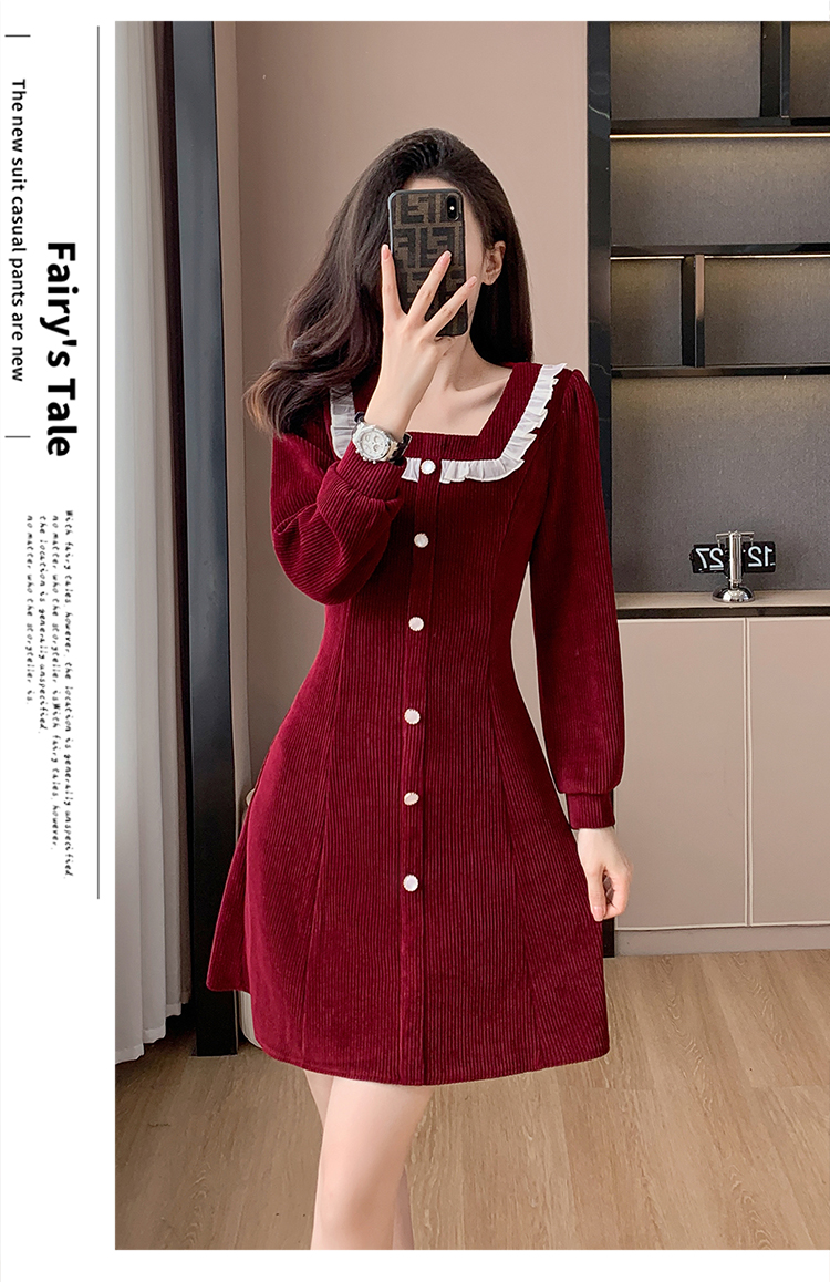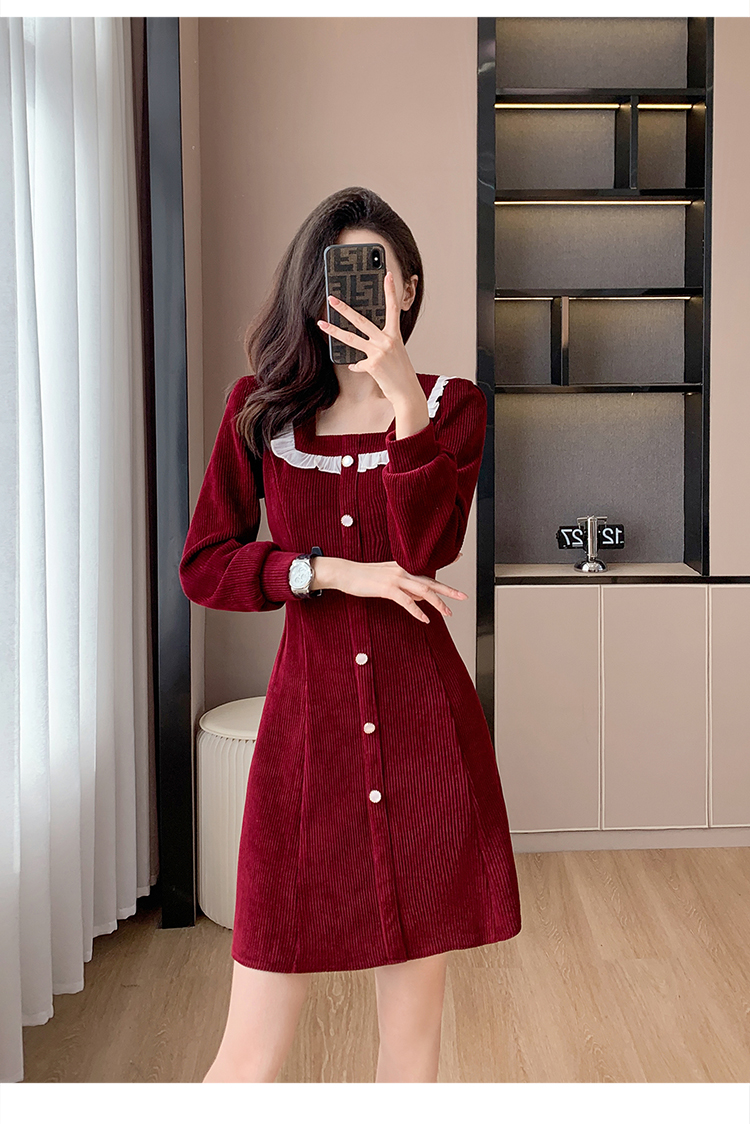 RM25927#修身显瘦红色气质荷叶边灯芯绒打底连衣裙
