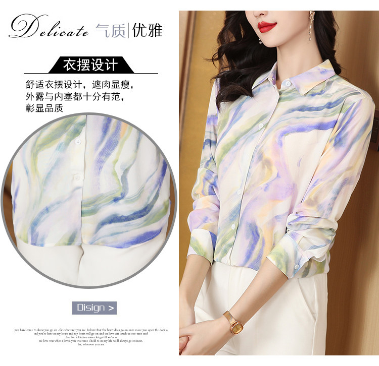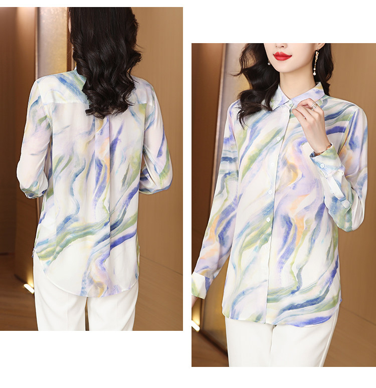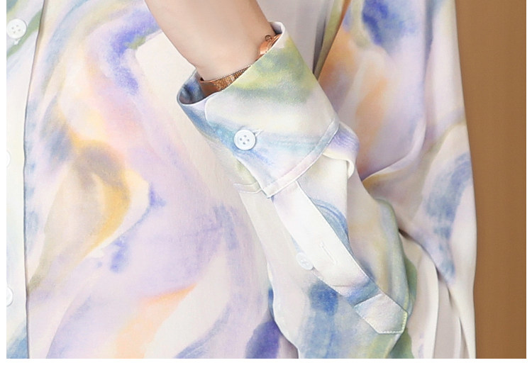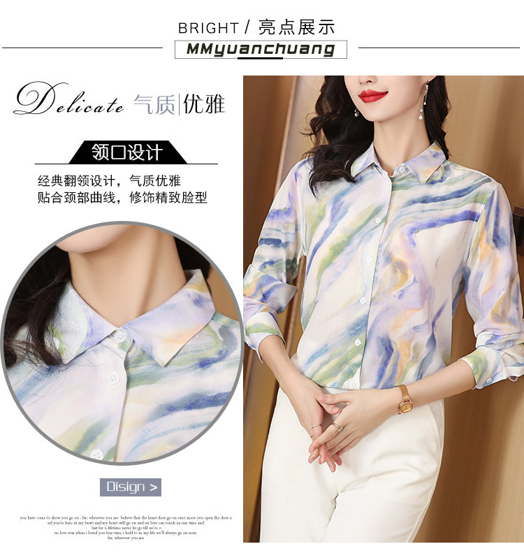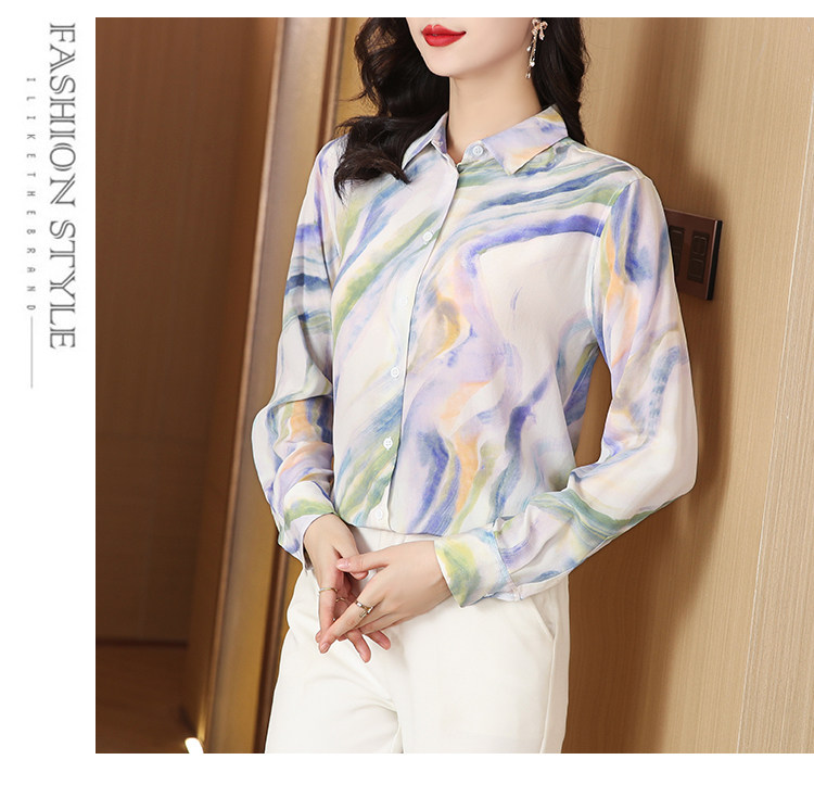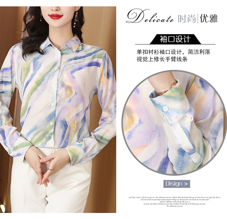 RM25939#法式复古浪漫温柔淡紫色云霞水墨印花柔糯砂洗真丝桑蚕丝长袖衬衫