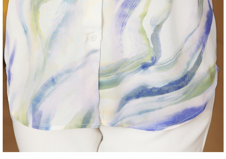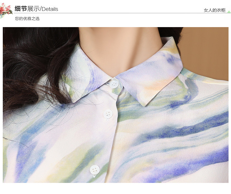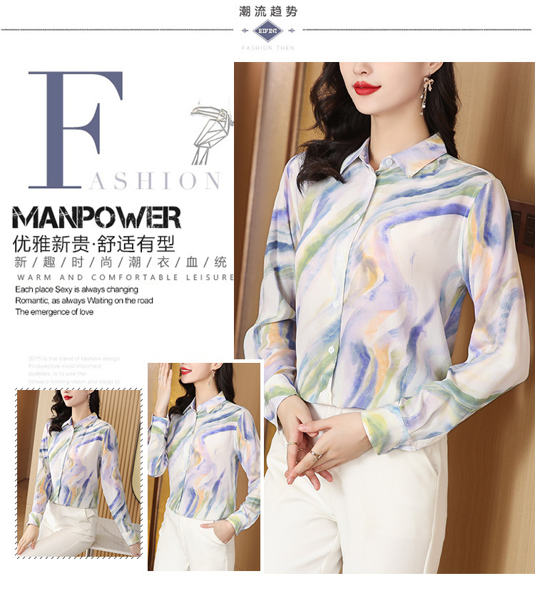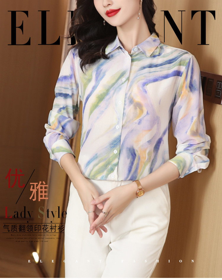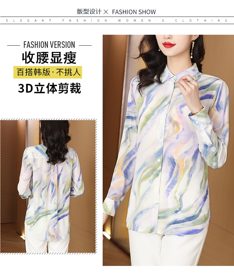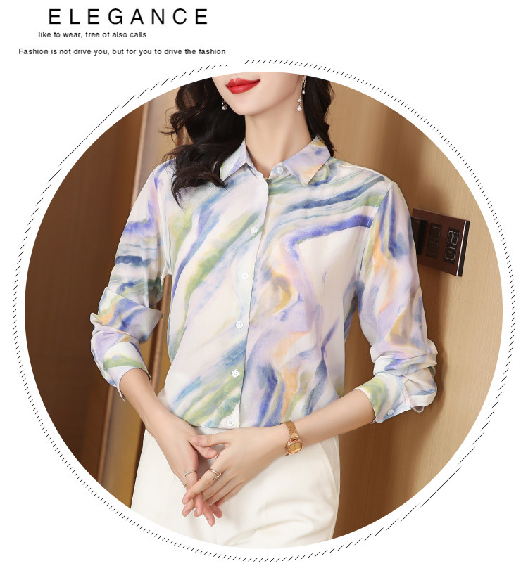 RM25939#法式复古浪漫温柔淡紫色云霞水墨印花柔糯砂洗真丝桑蚕丝长袖衬衫