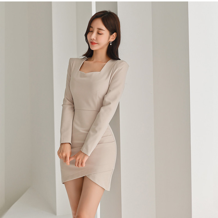 RM25949#新款韩版时尚气质优雅显瘦百搭简约长袖方领纯色连衣裙