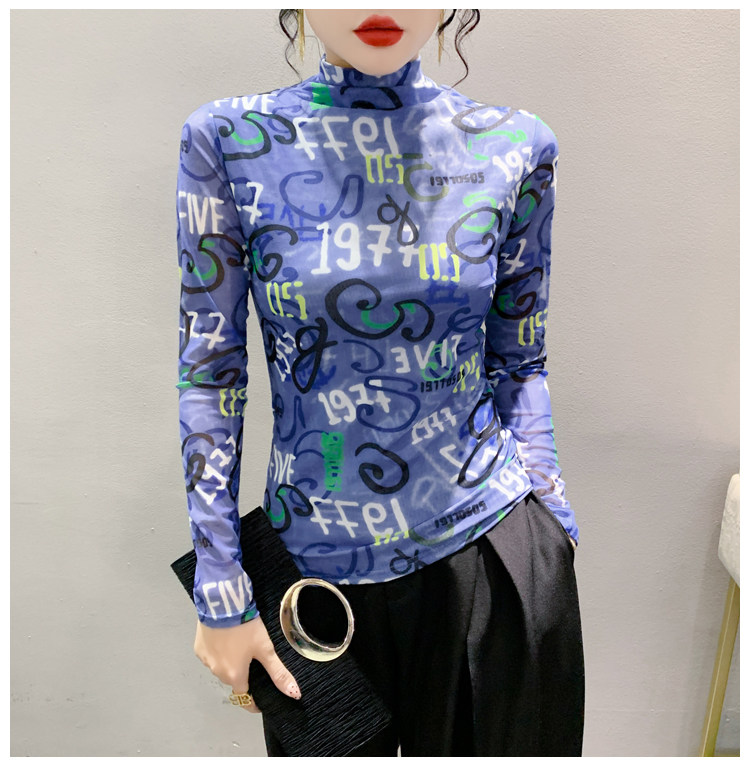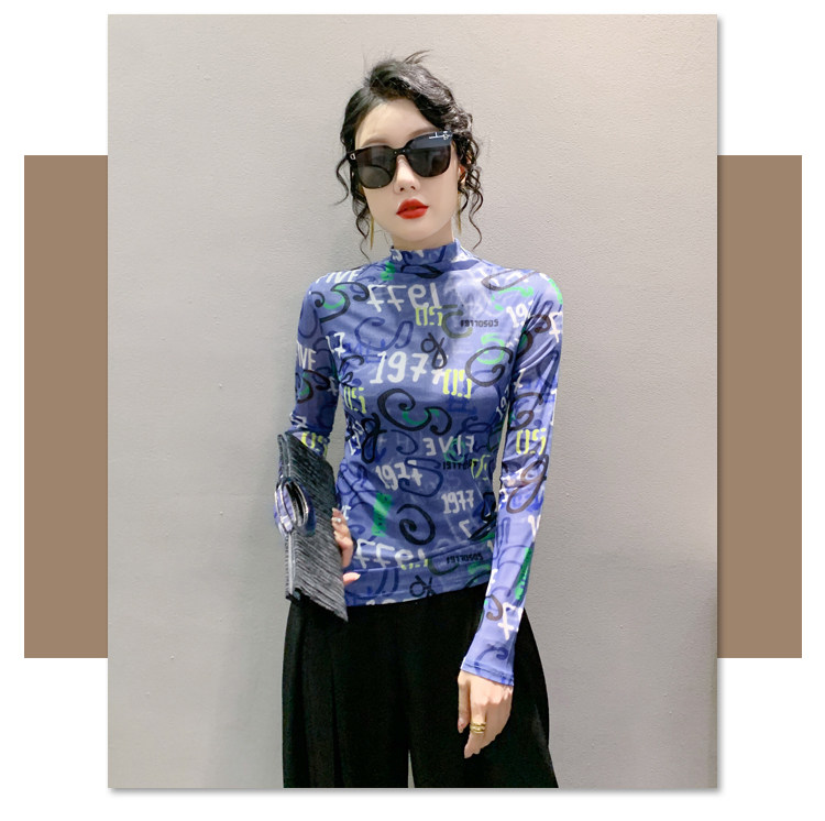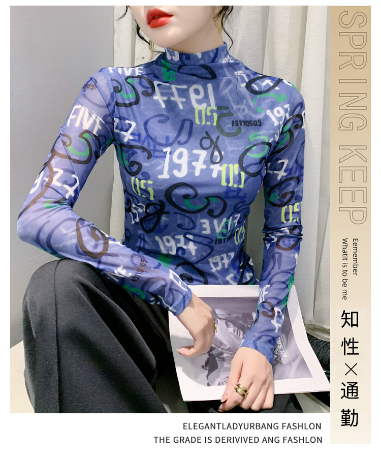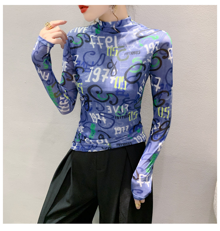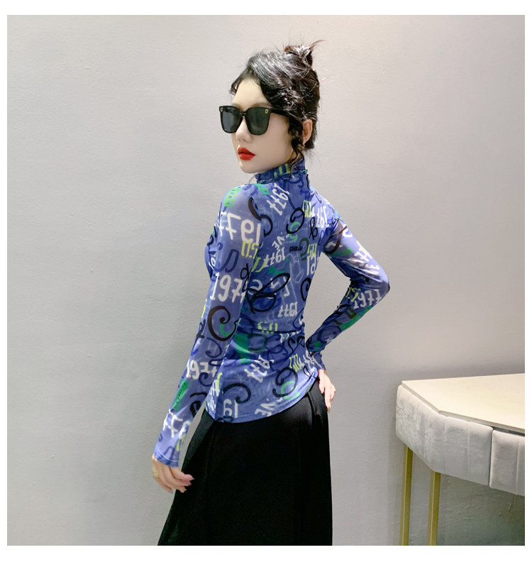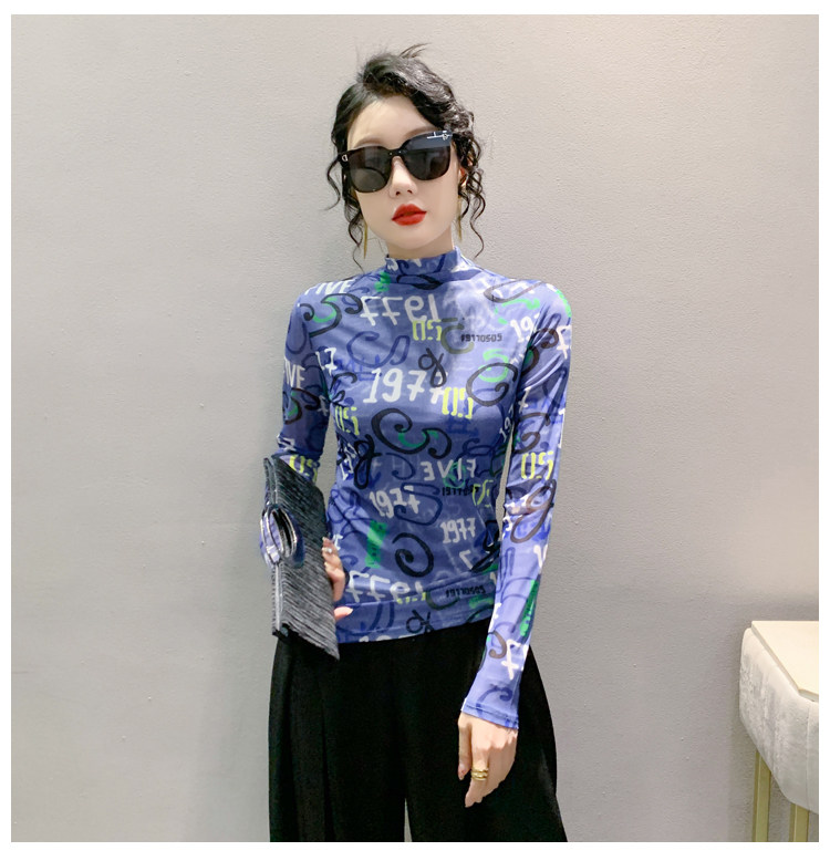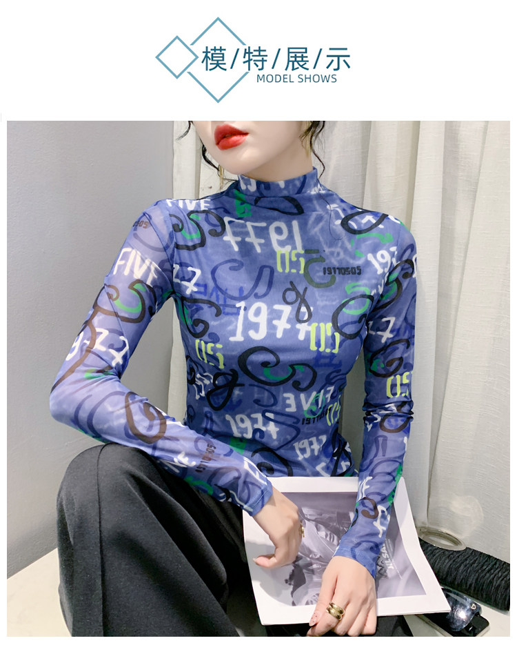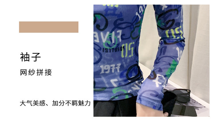 RM25956#新款修身显瘦高领时尚印花纱网长袖T恤潮洋气小衫实