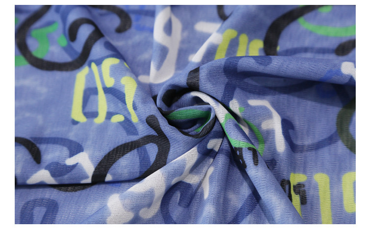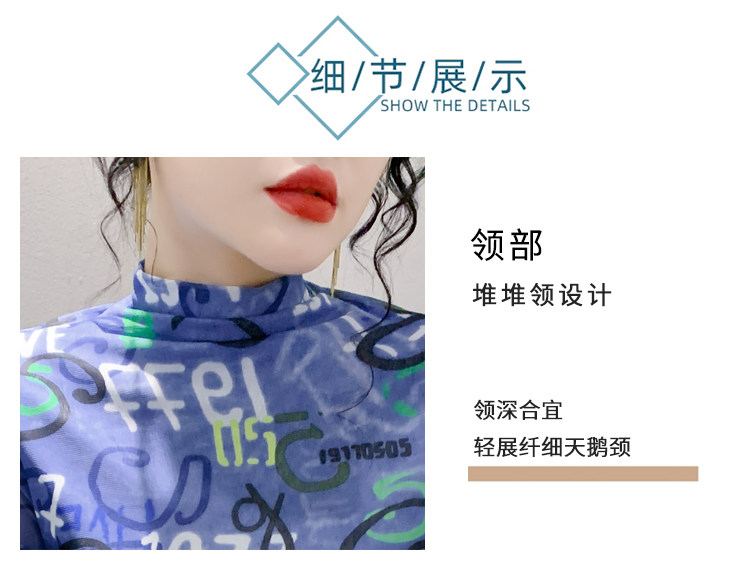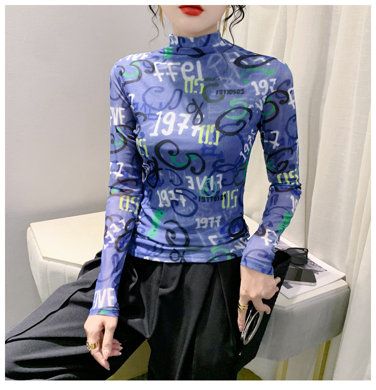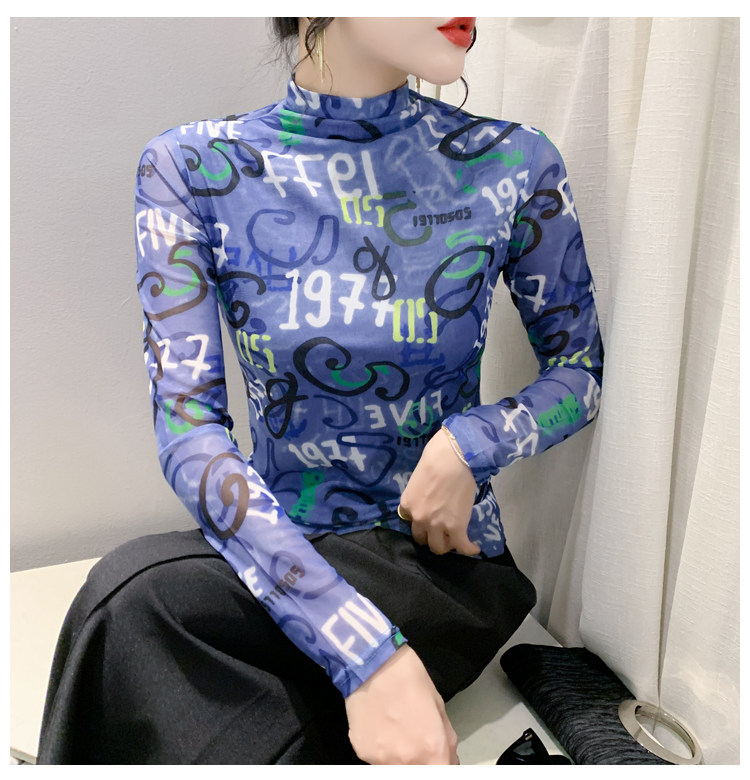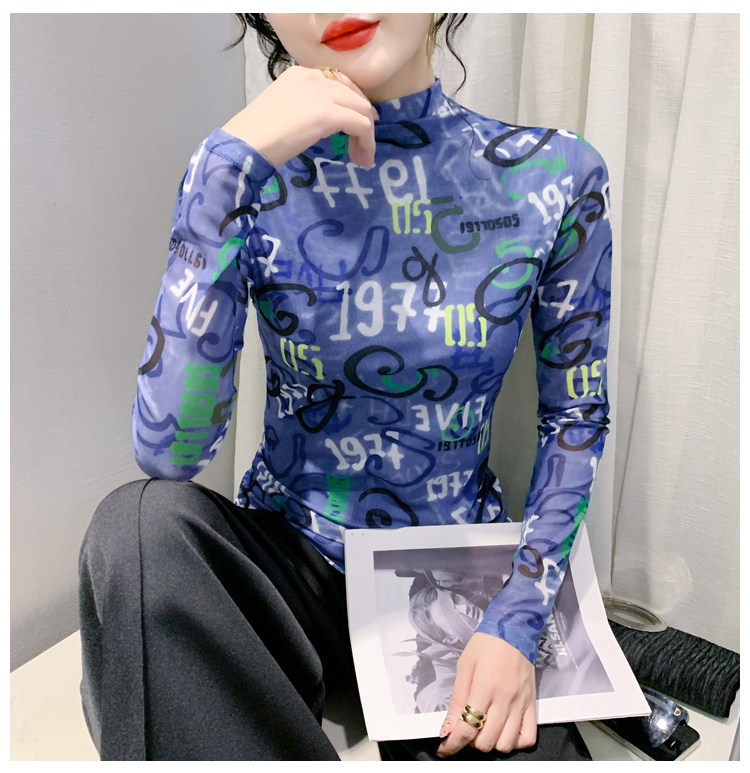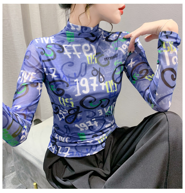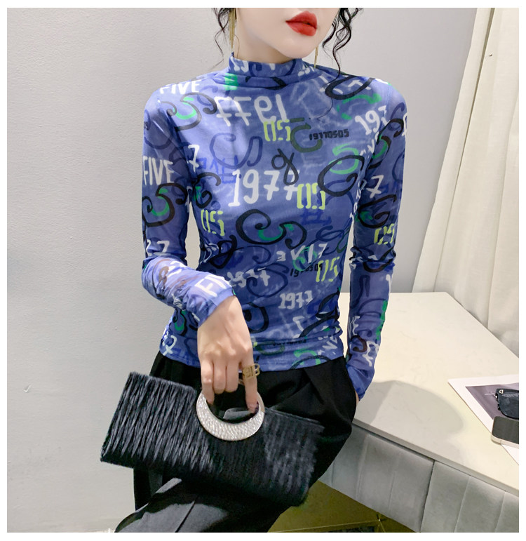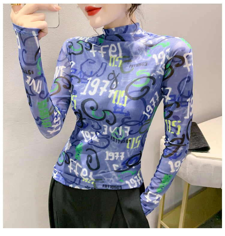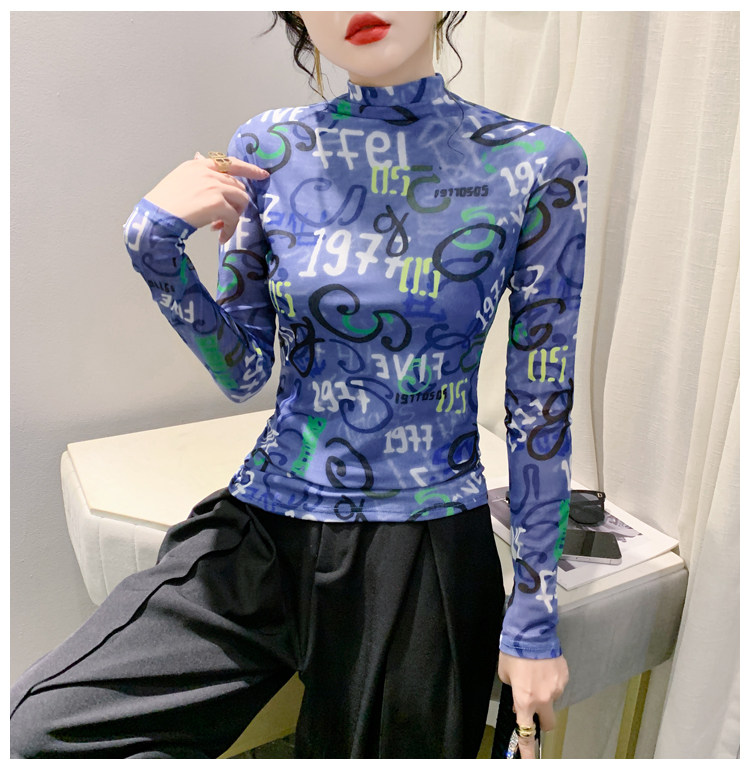 RM25956#新款修身显瘦高领时尚印花纱网长袖T恤潮洋气小衫实
