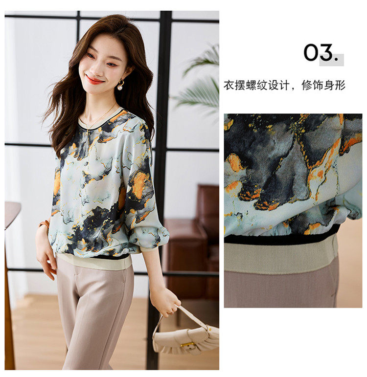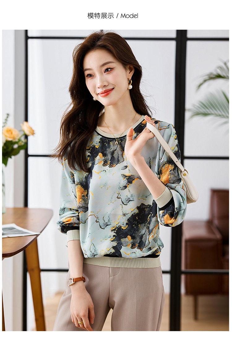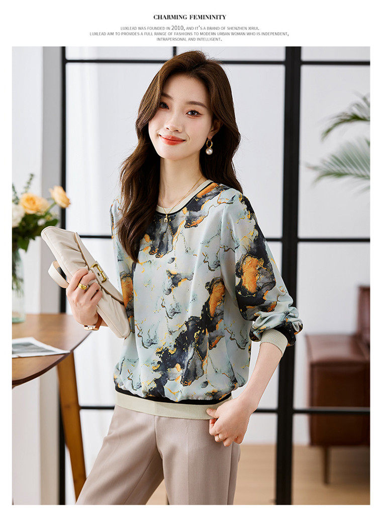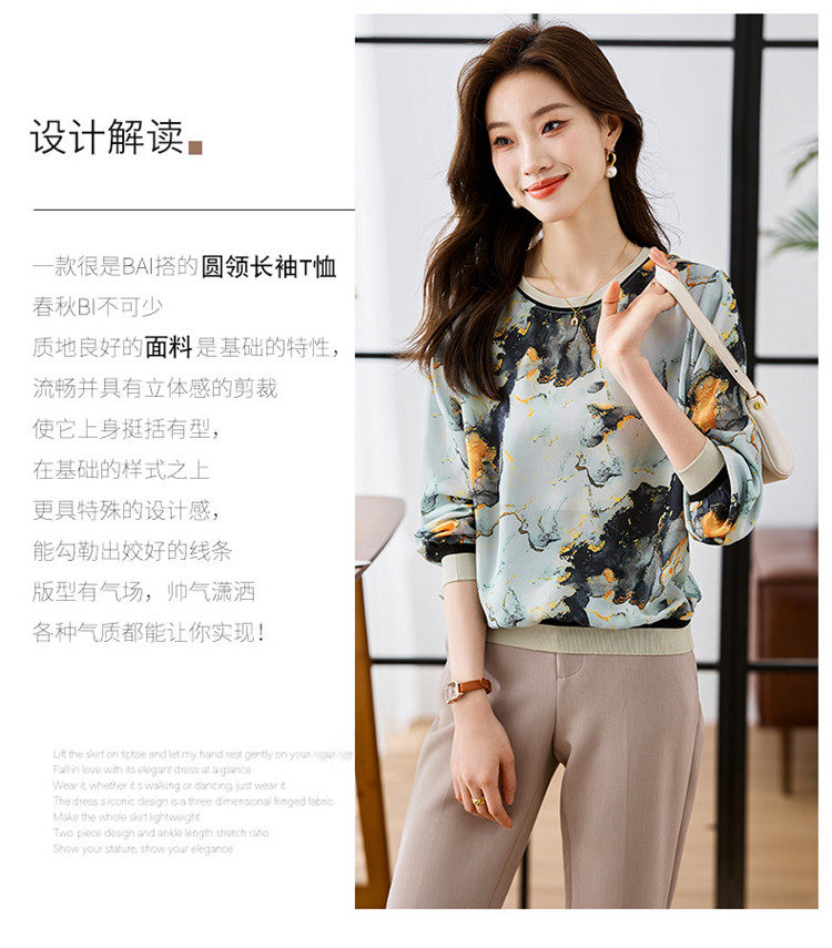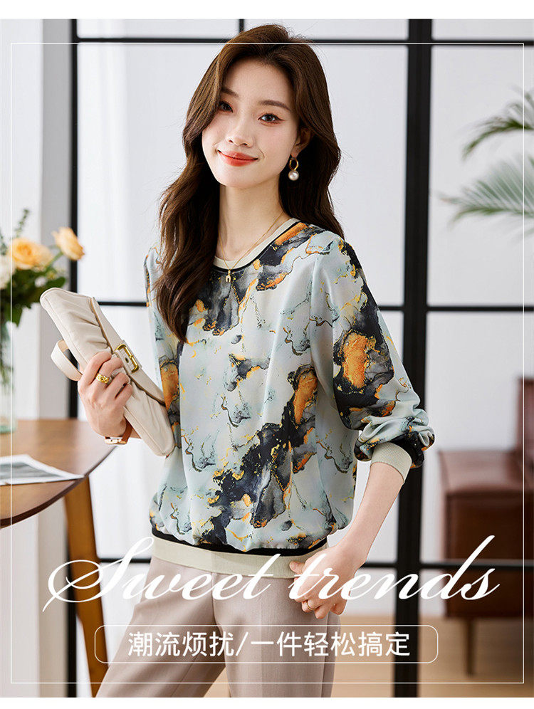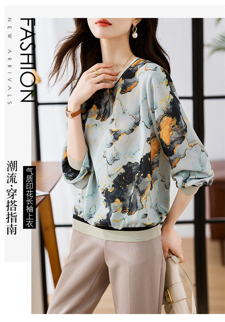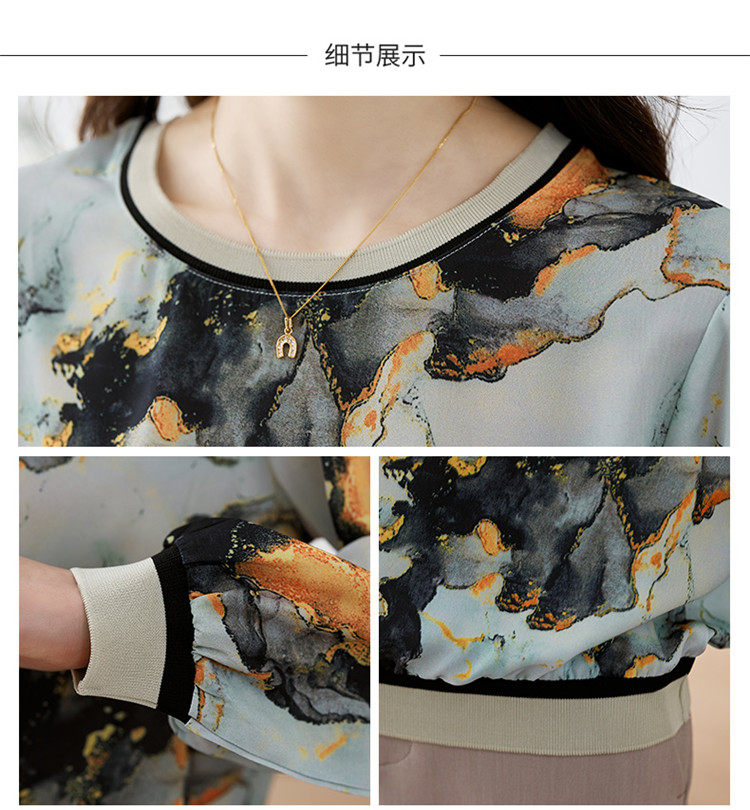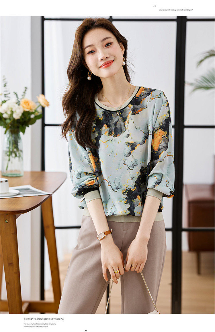 RM25960#新款秋高端韩国麻印花圆领长袖宽松休闲气质套头上衣