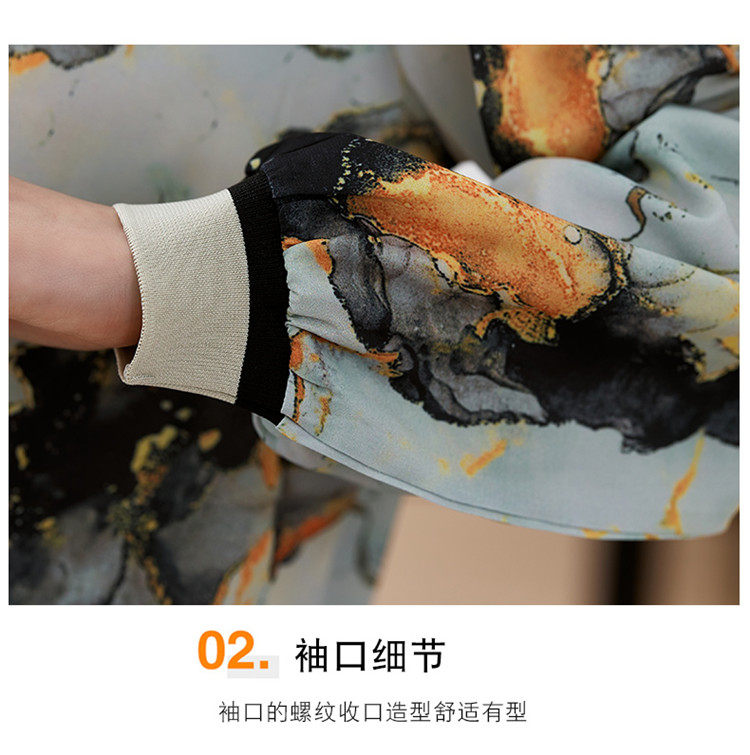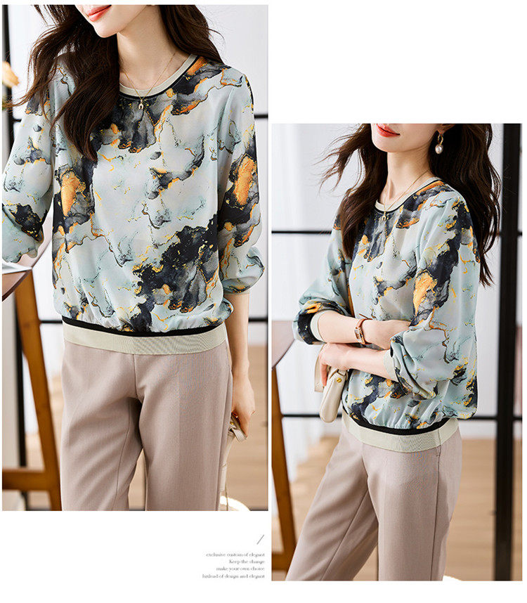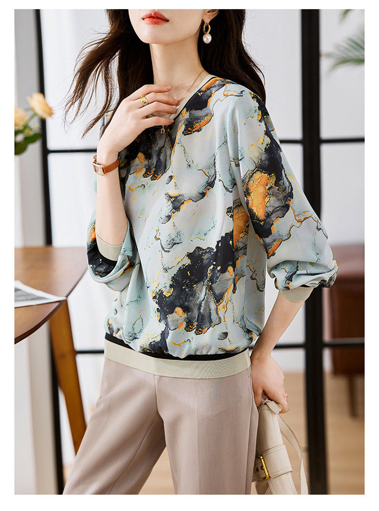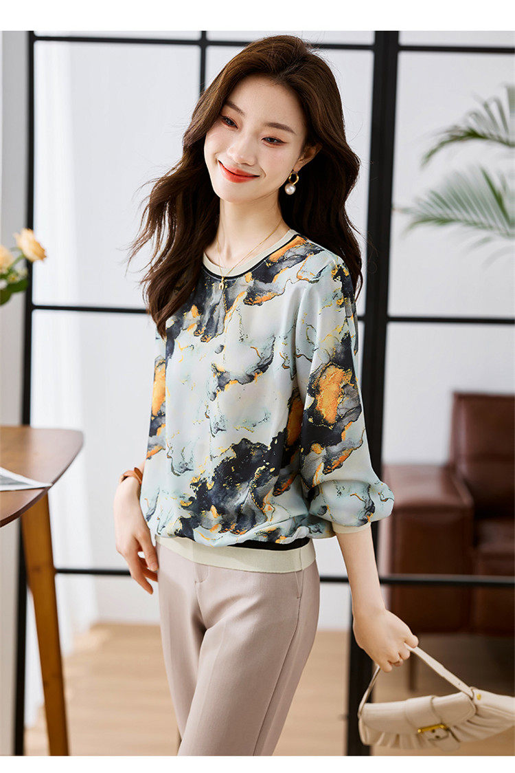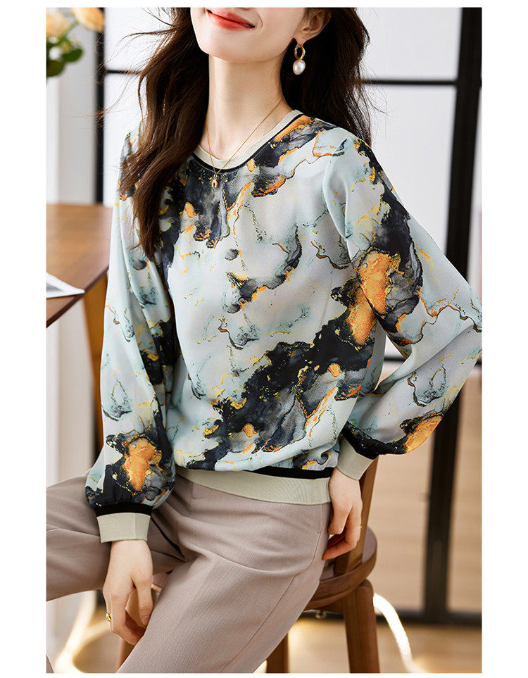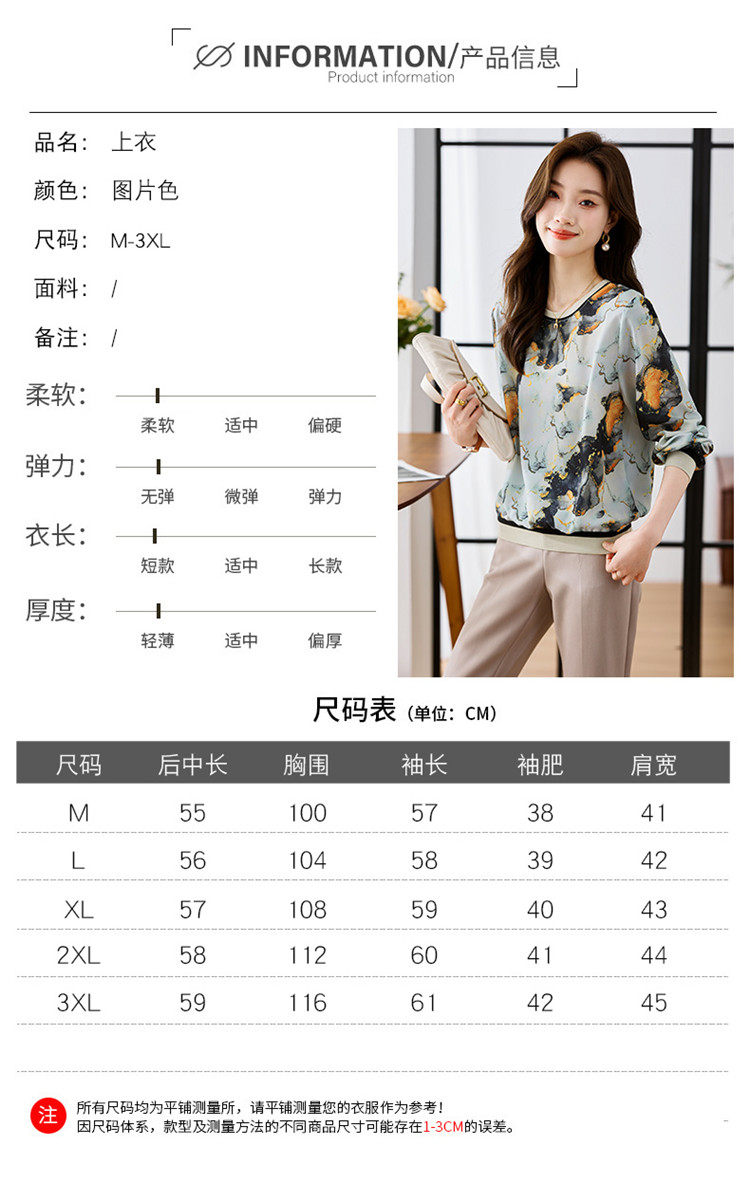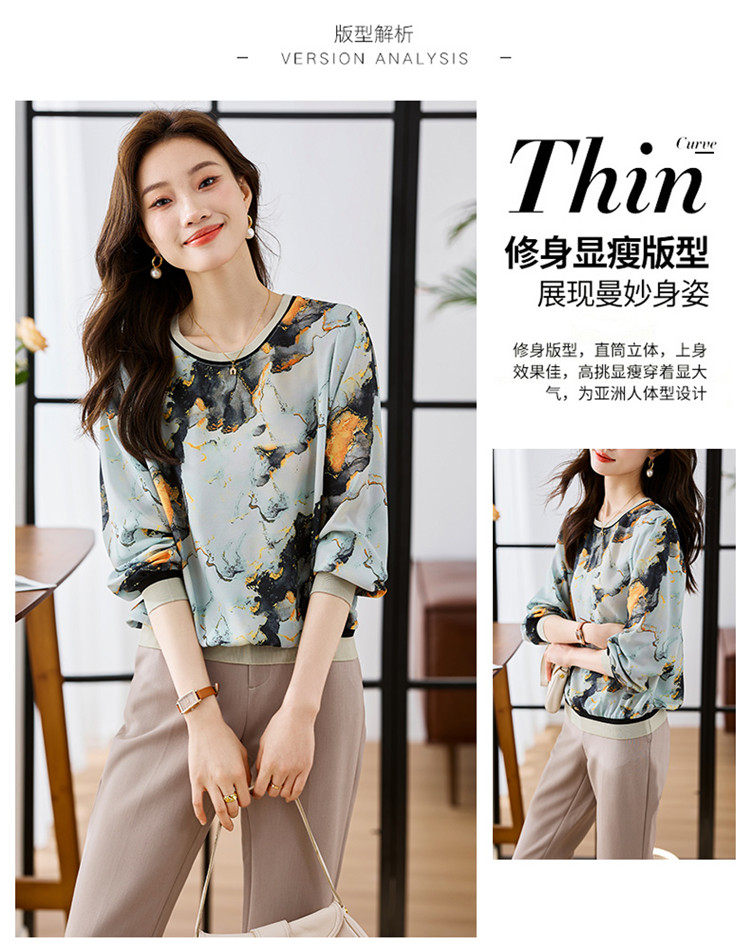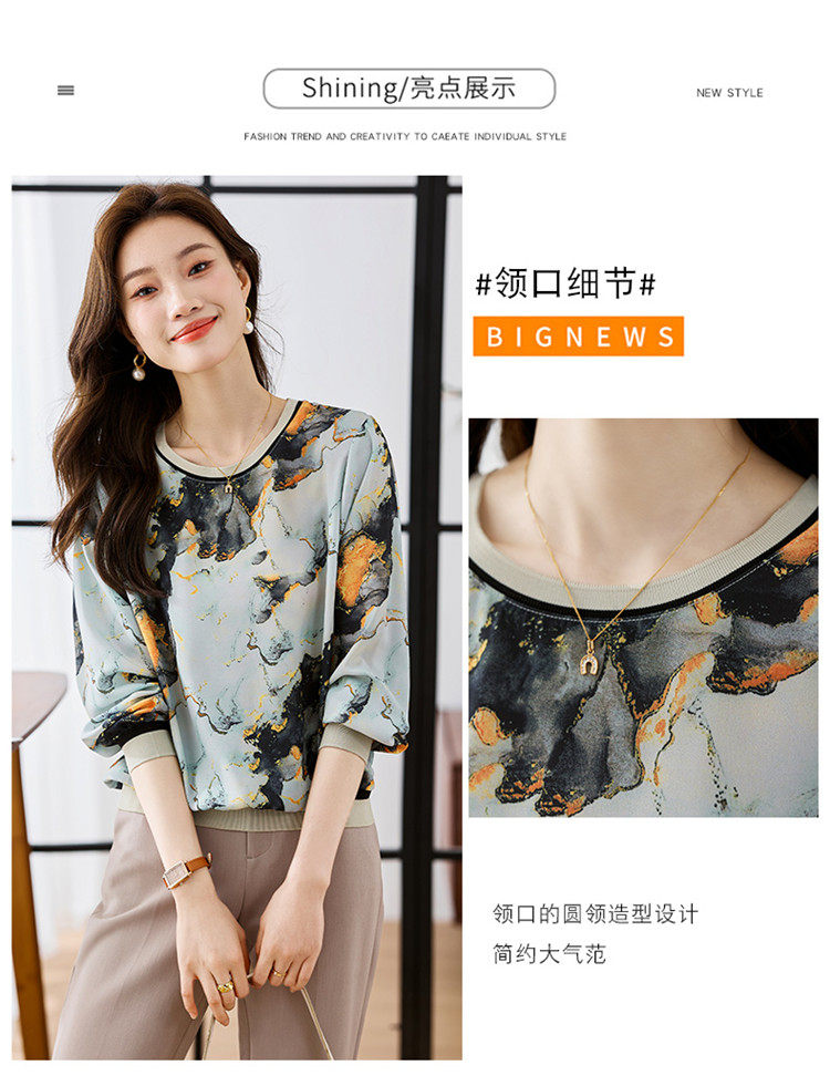 RM25960#新款秋高端韩国麻印花圆领长袖宽松休闲气质套头上衣