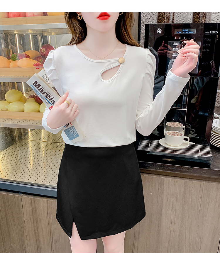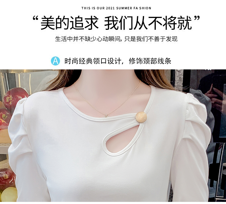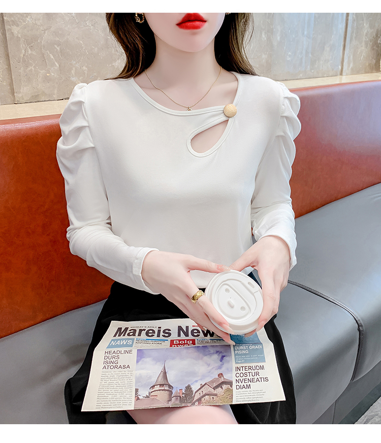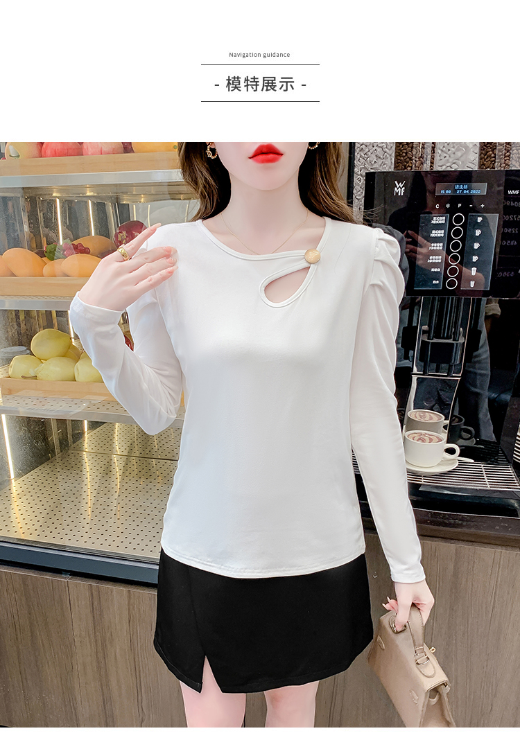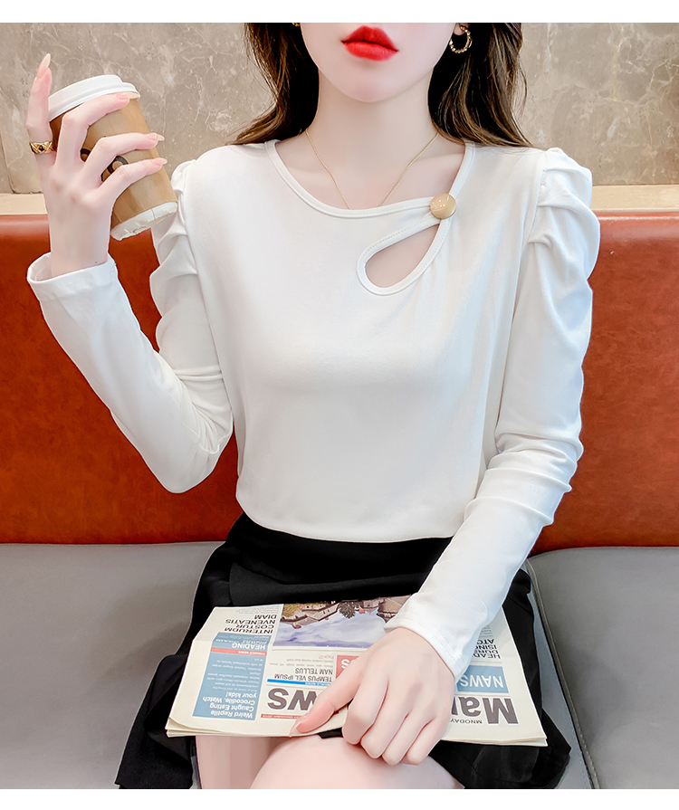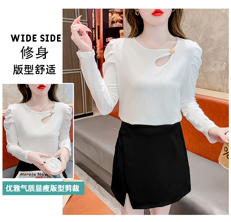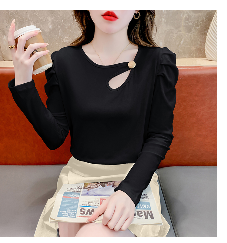 RM25987#韩版金属扣镂空泡泡袖打底衫女2023秋季新款时尚百搭修身上衣小衫