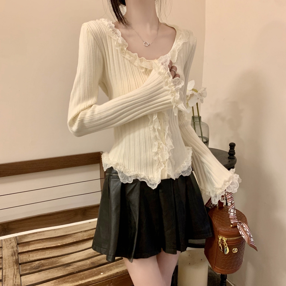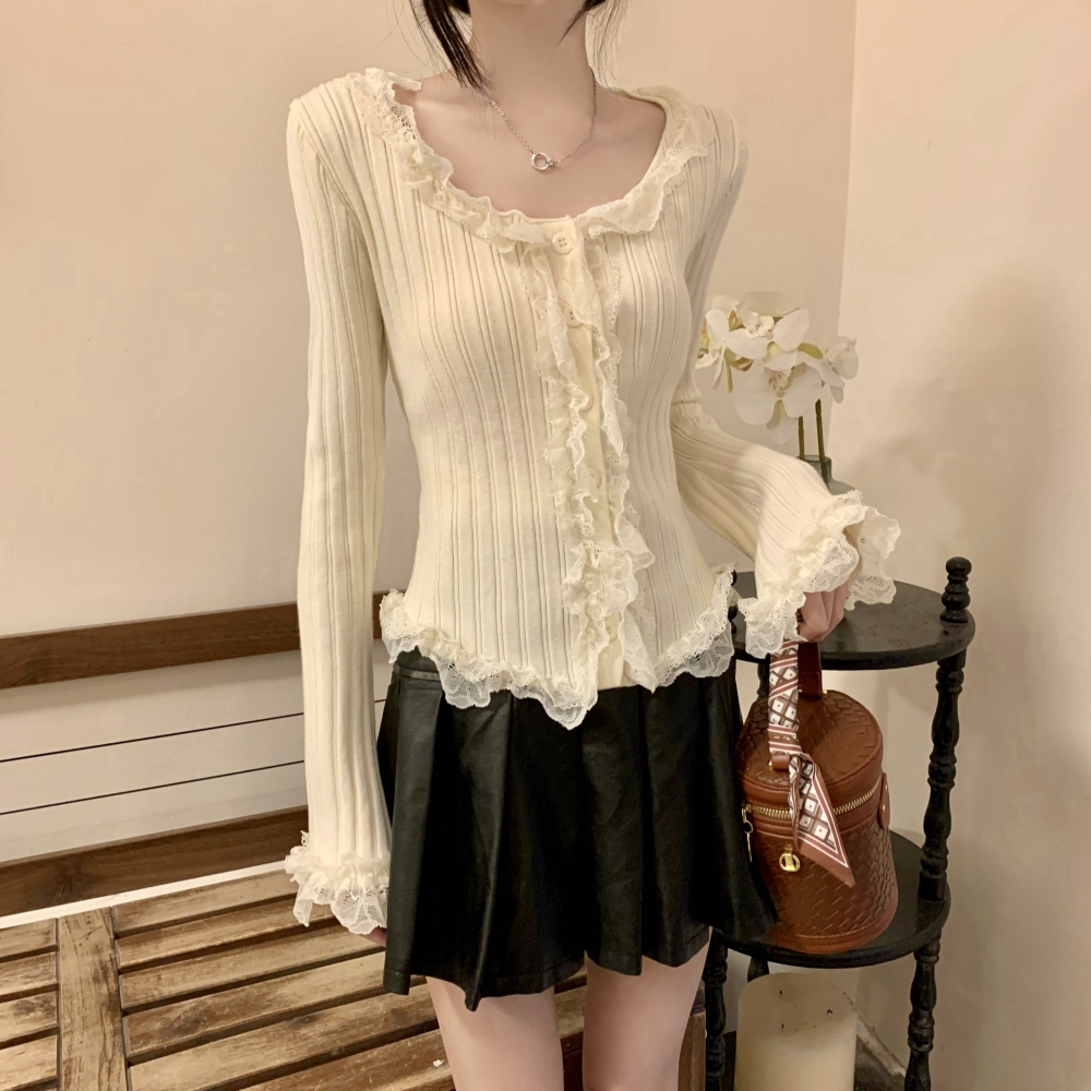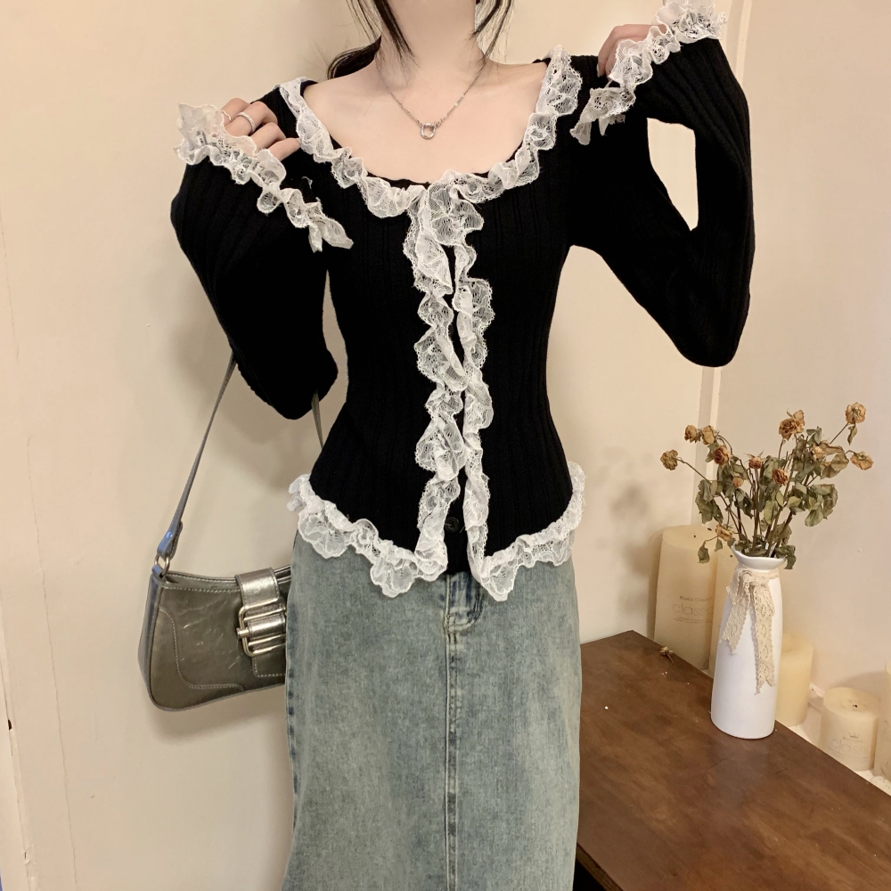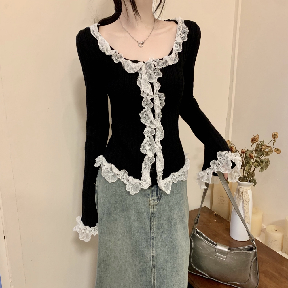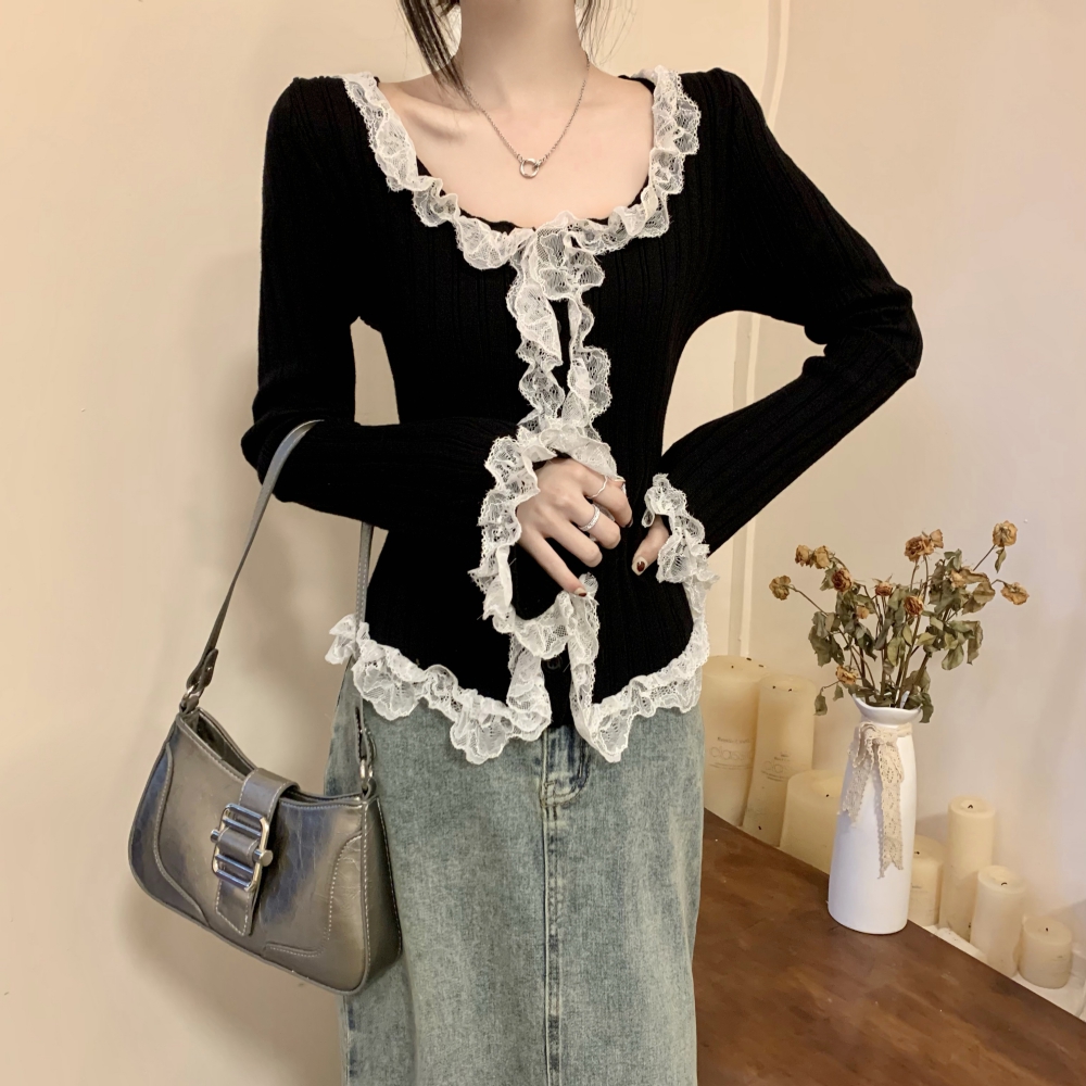 RM25990#法式蕾丝花边长袖针织衫秋季设计感小众显瘦短款上衣女