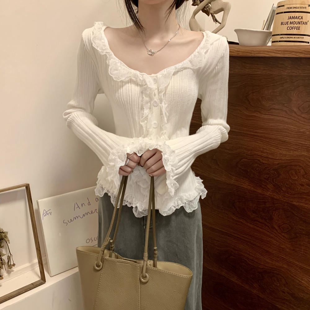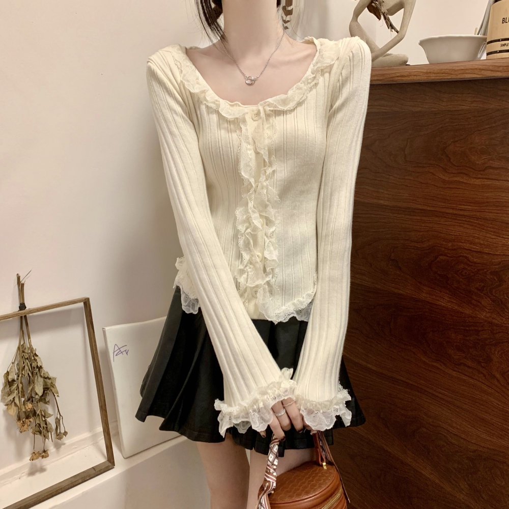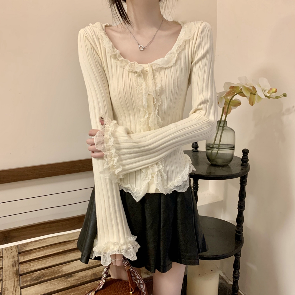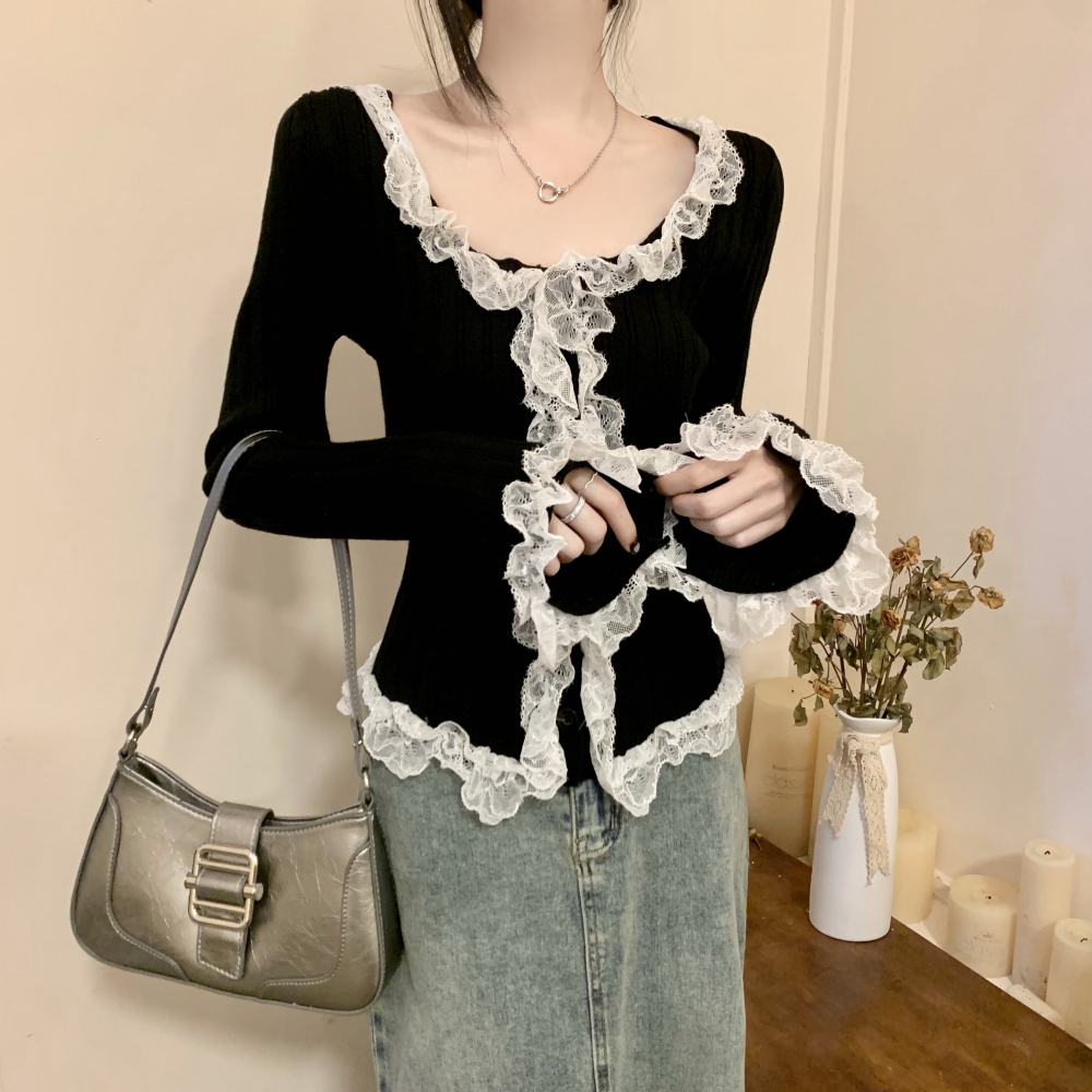 RM25990#法式蕾丝花边长袖针织衫秋季设计感小众显瘦短款上衣女