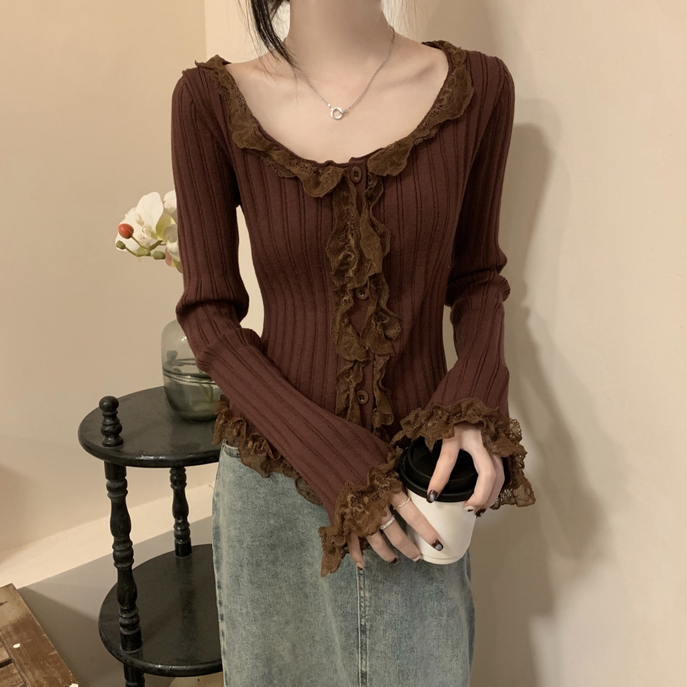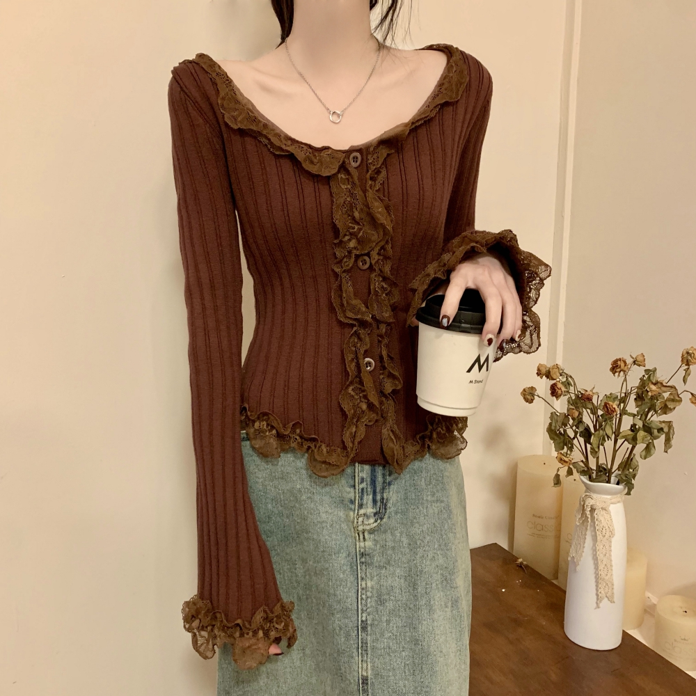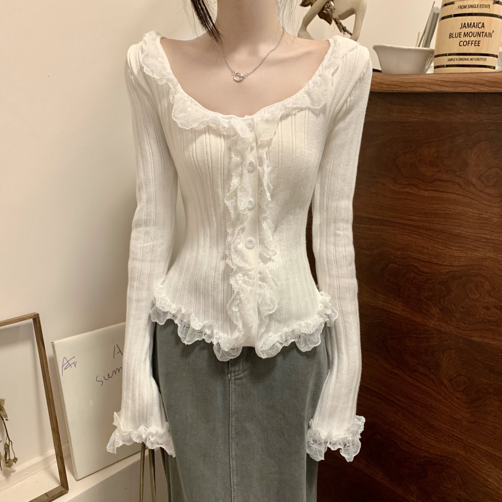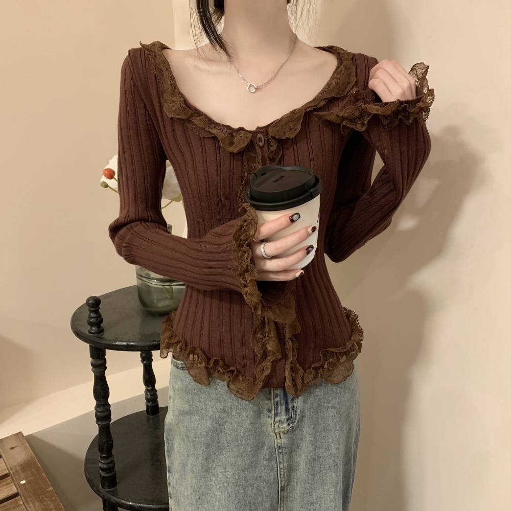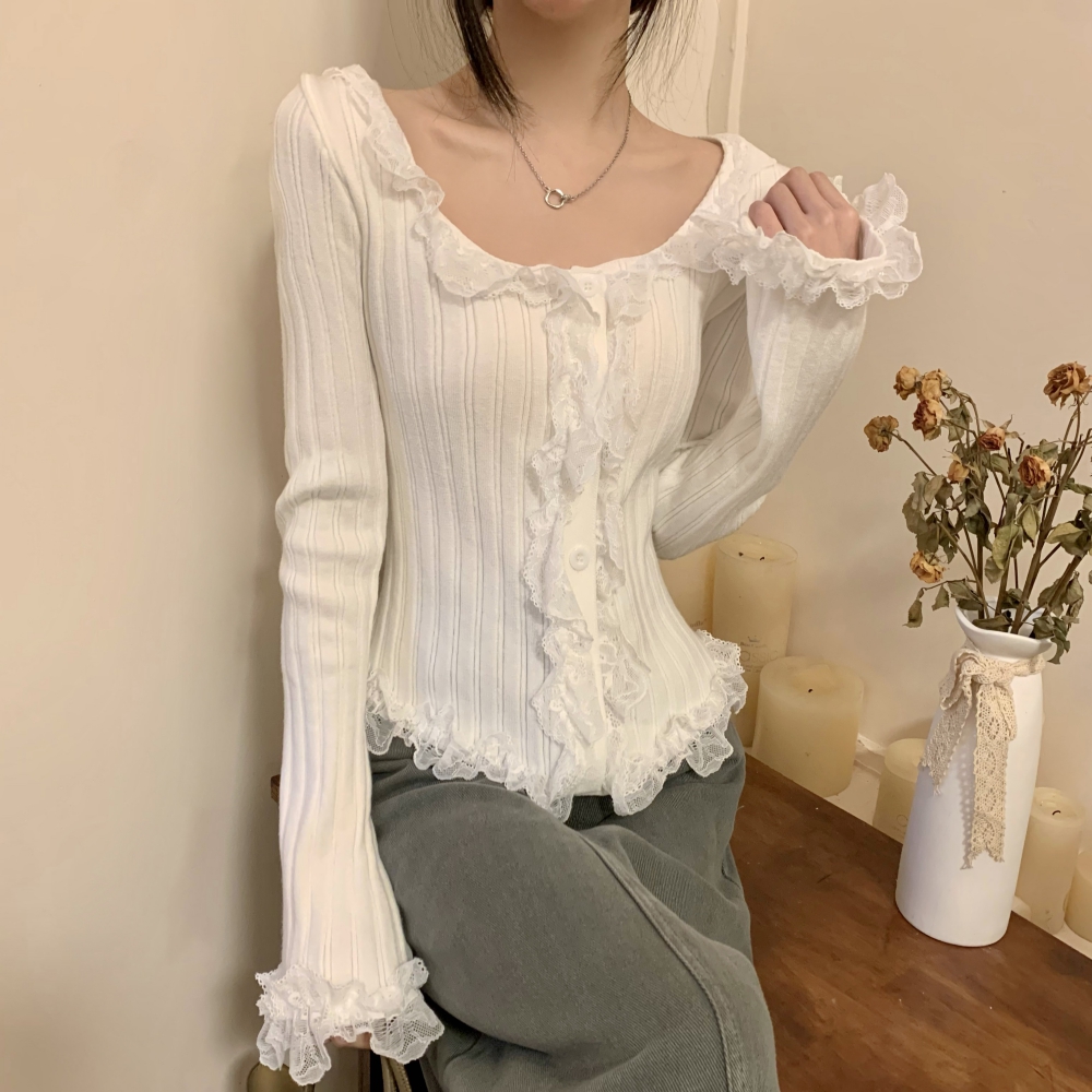 RM25990#法式蕾丝花边长袖针织衫秋季设计感小众显瘦短款上衣女