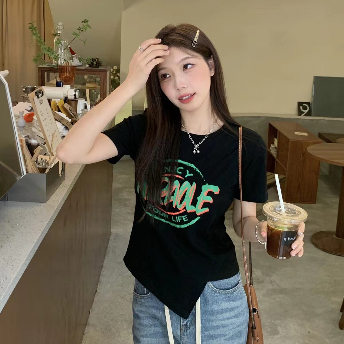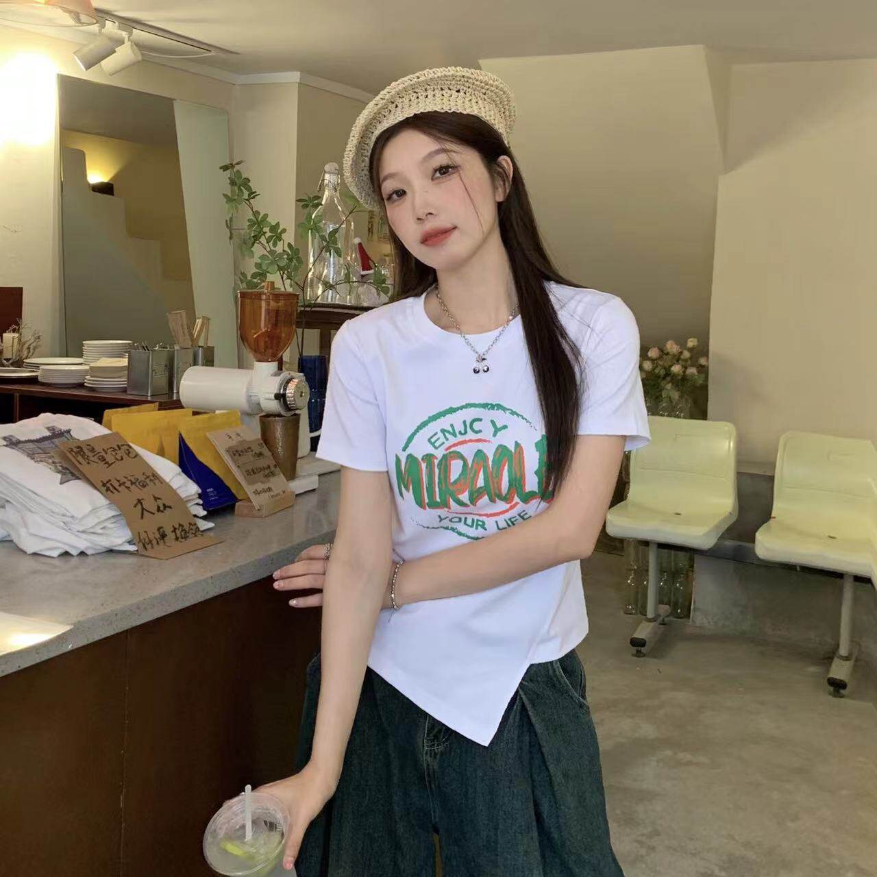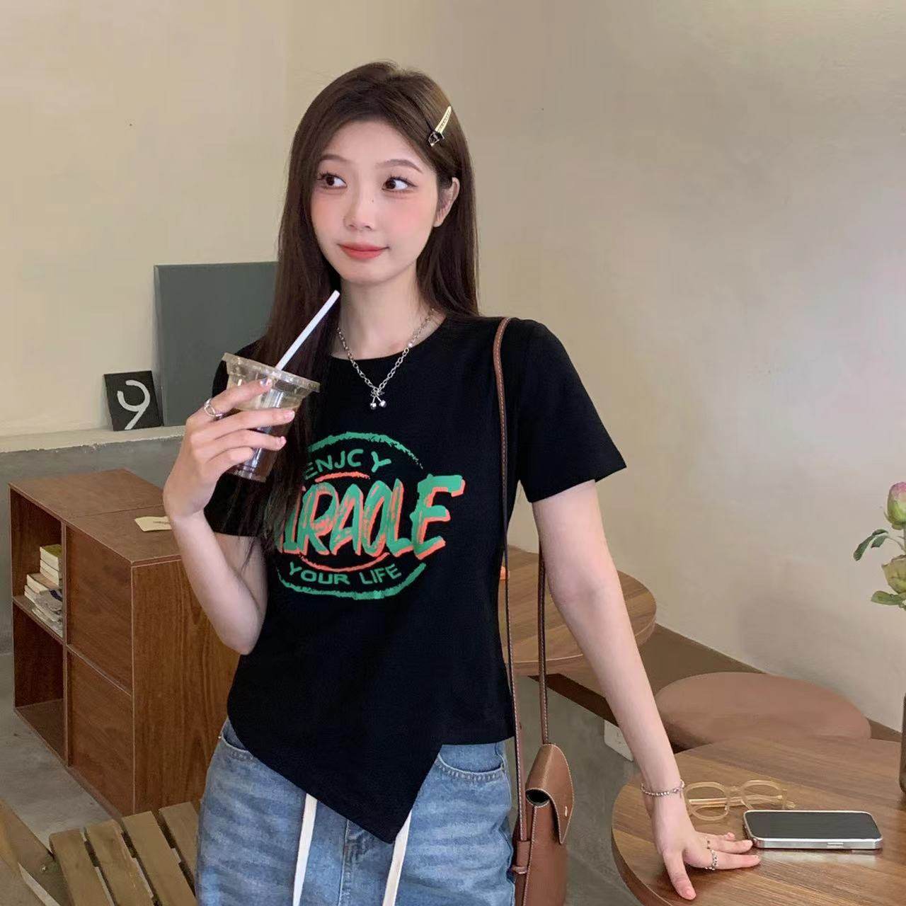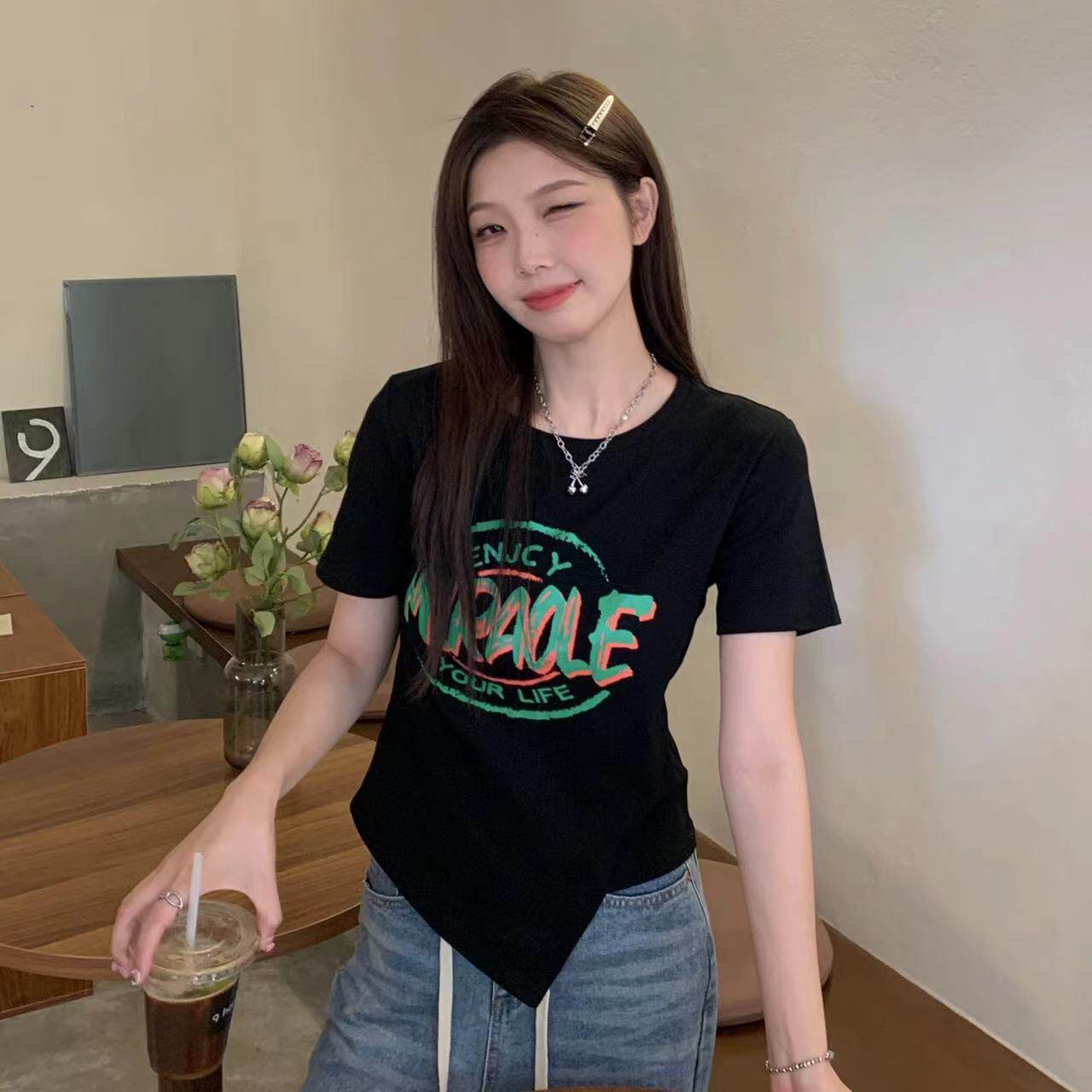 RM25997#大码新款胖MMt恤女夏季不规则设计感印花显瘦上衣