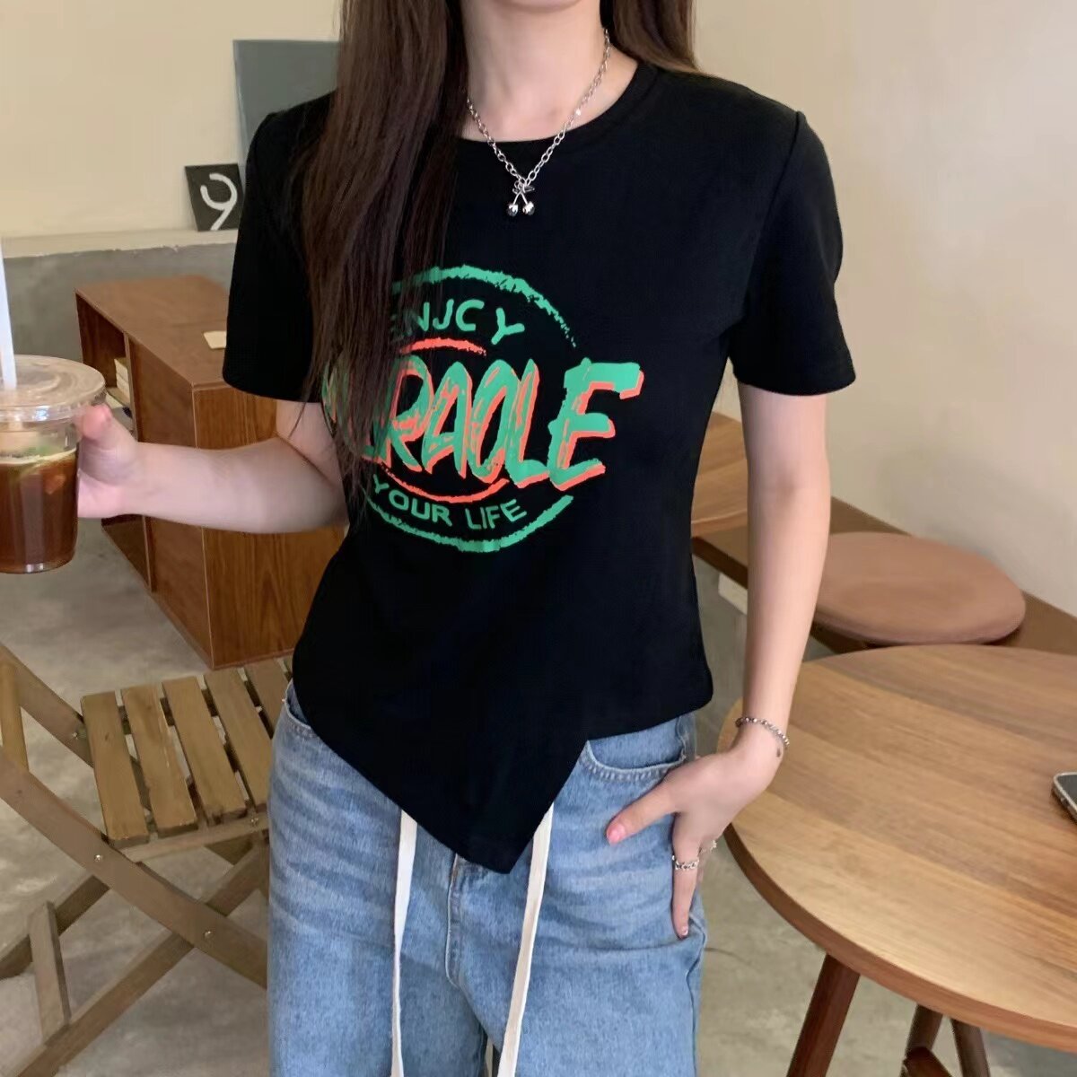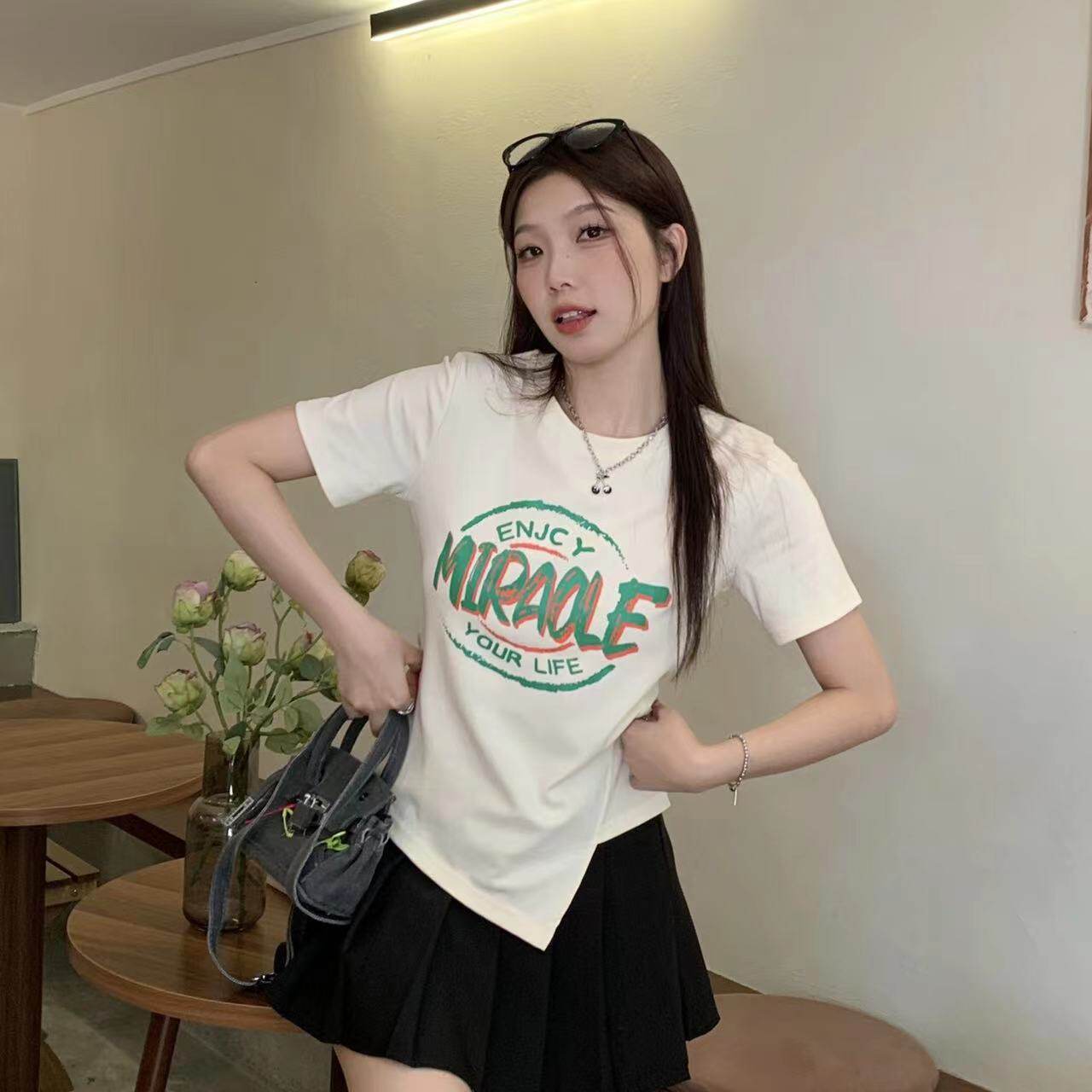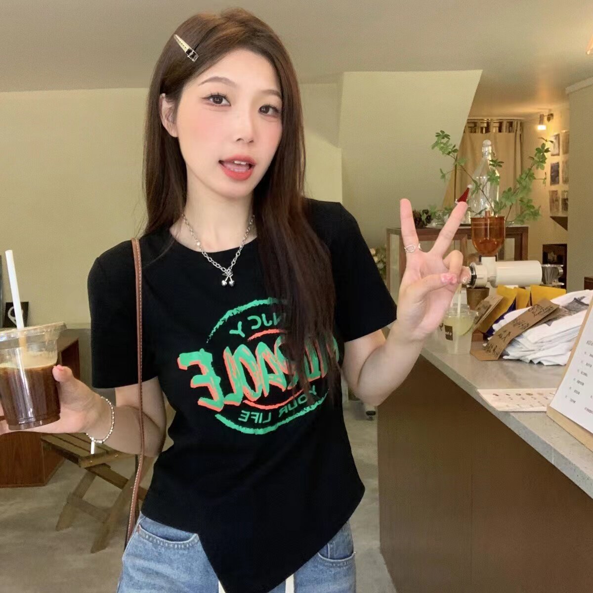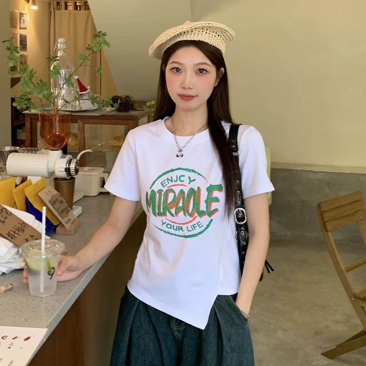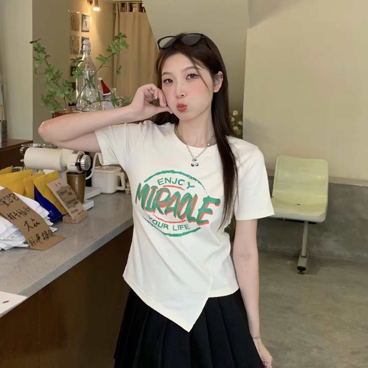 RM25997#大码新款胖MMt恤女夏季不规则设计感印花显瘦上衣