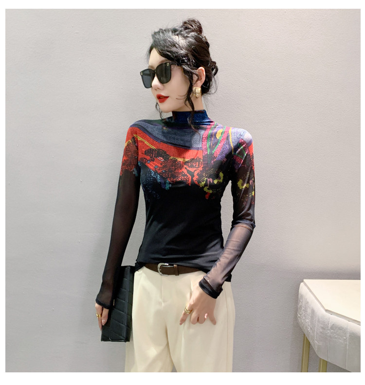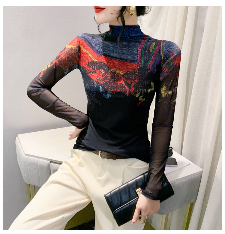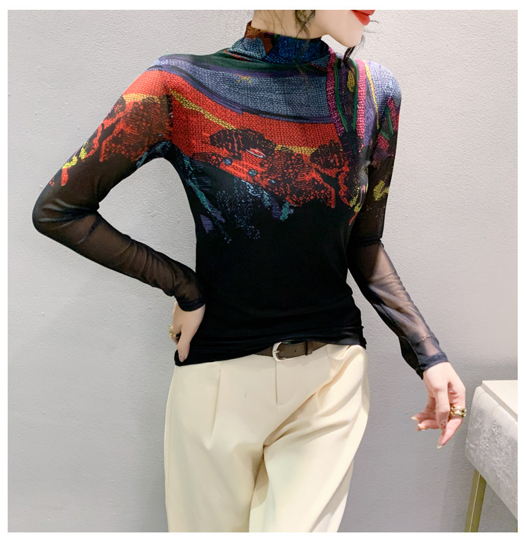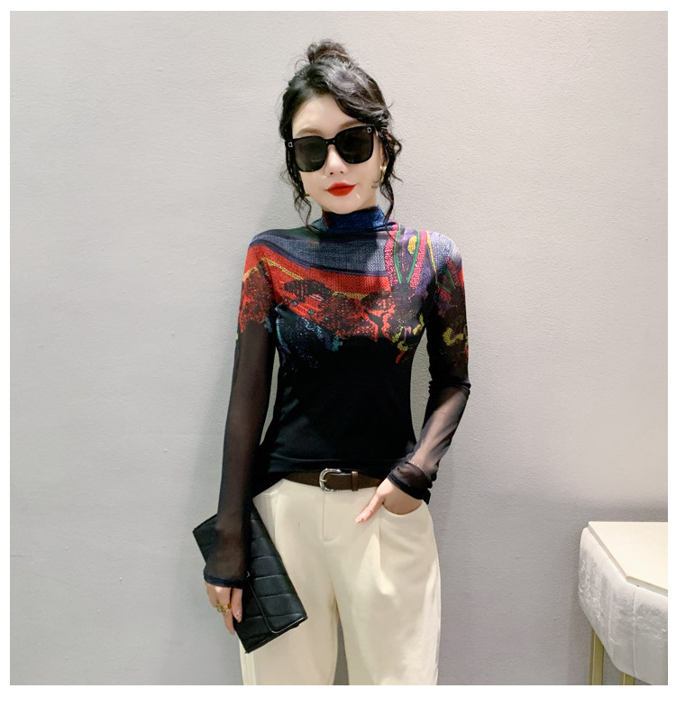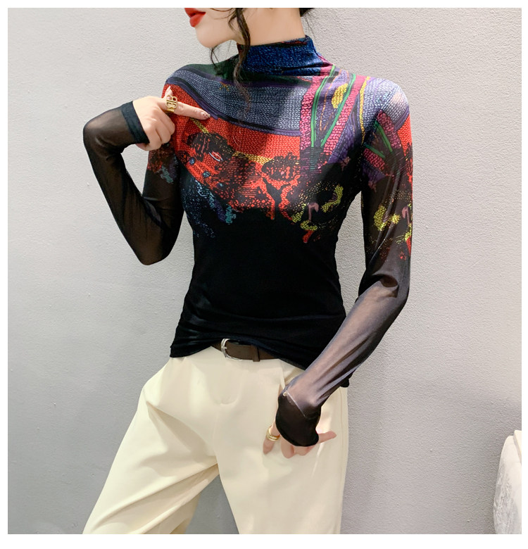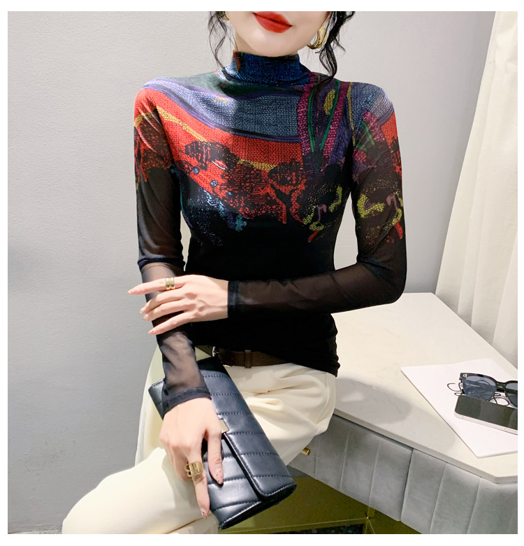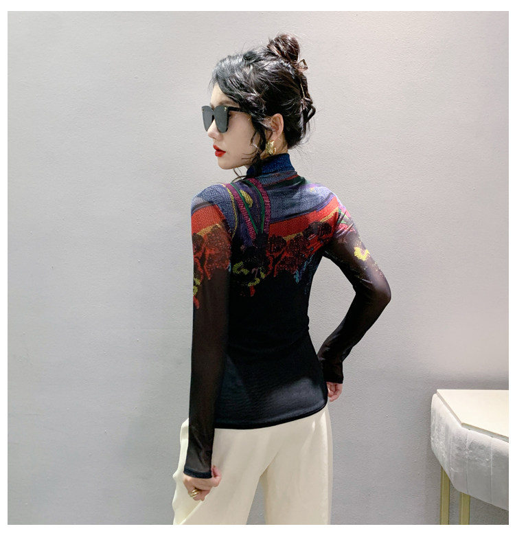 RM26012#欧货女装2023秋冬时尚洋气长袖高领网纱t恤女定位花上衣实拍