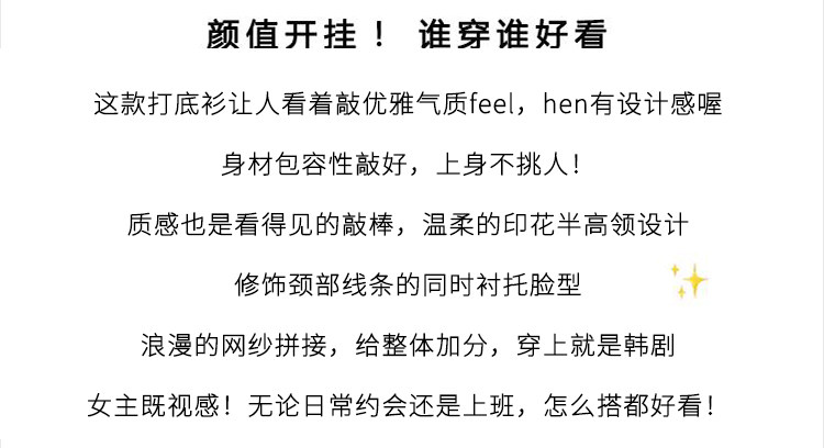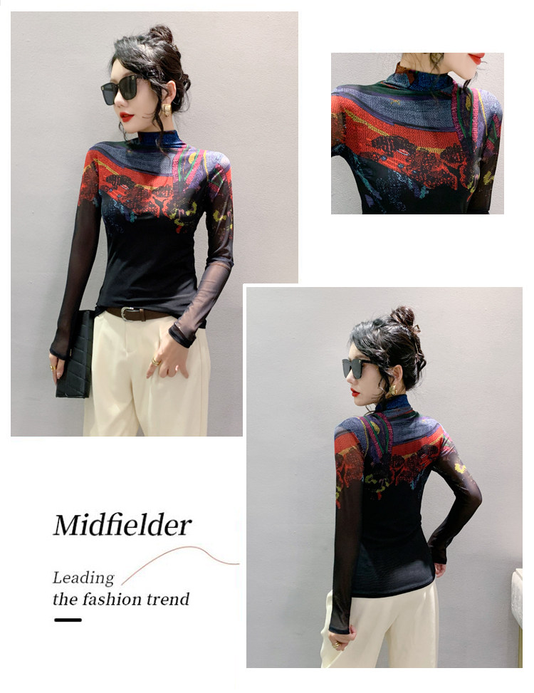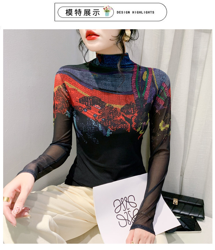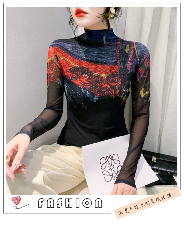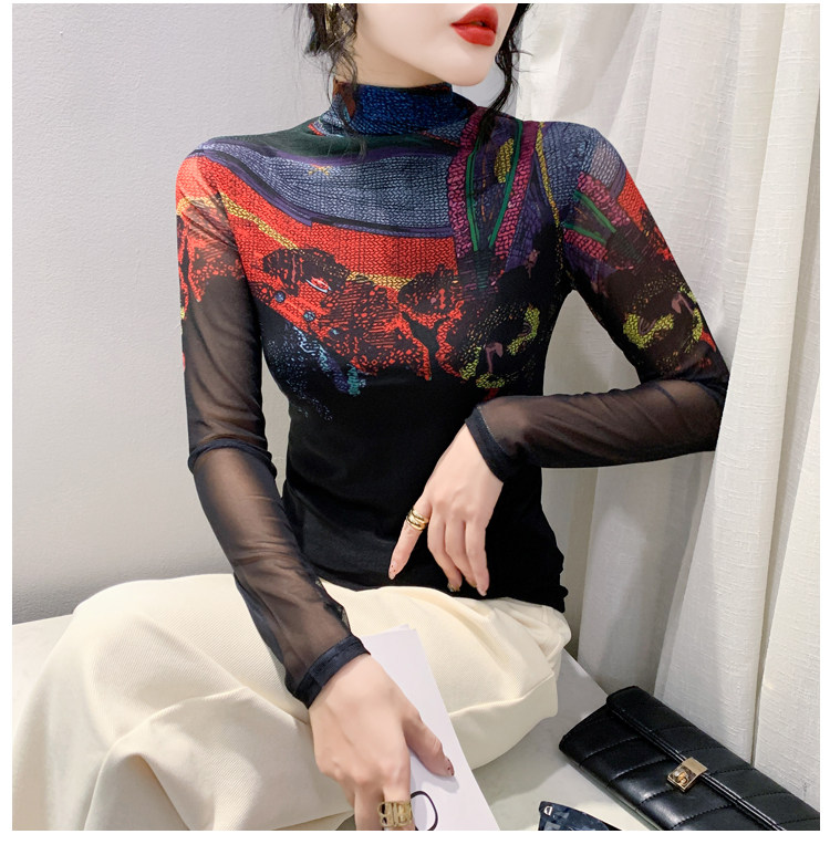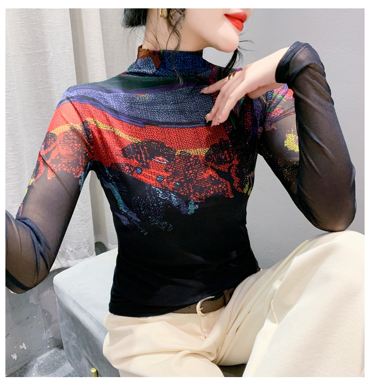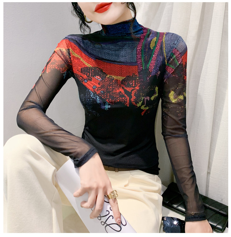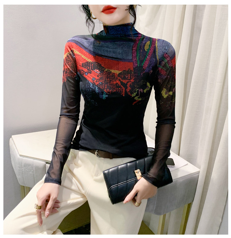 RM26012#欧货女装2023秋冬时尚洋气长袖高领网纱t恤女定位花上衣实拍