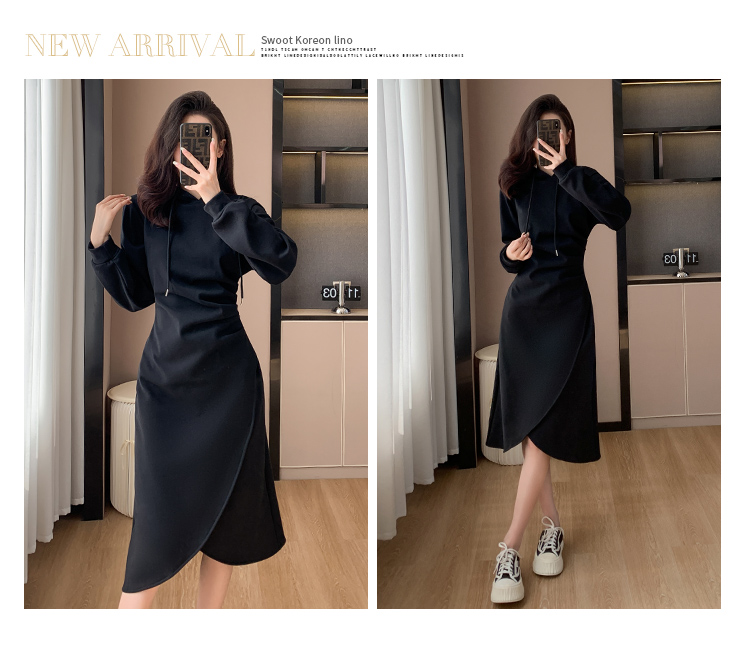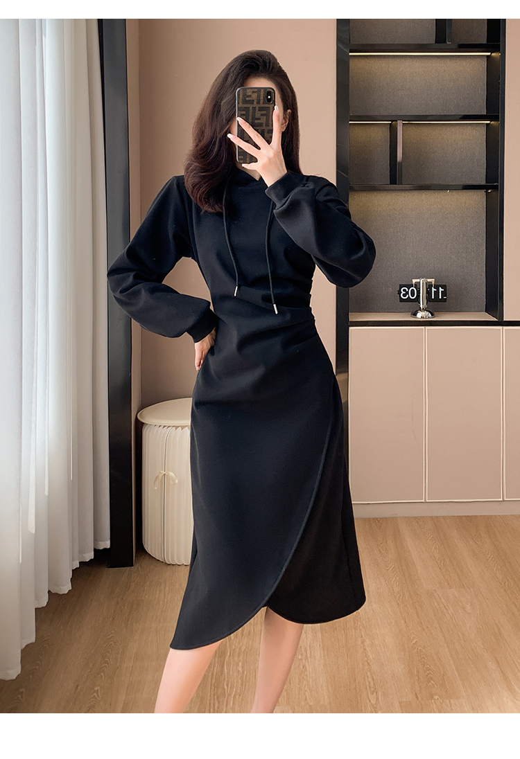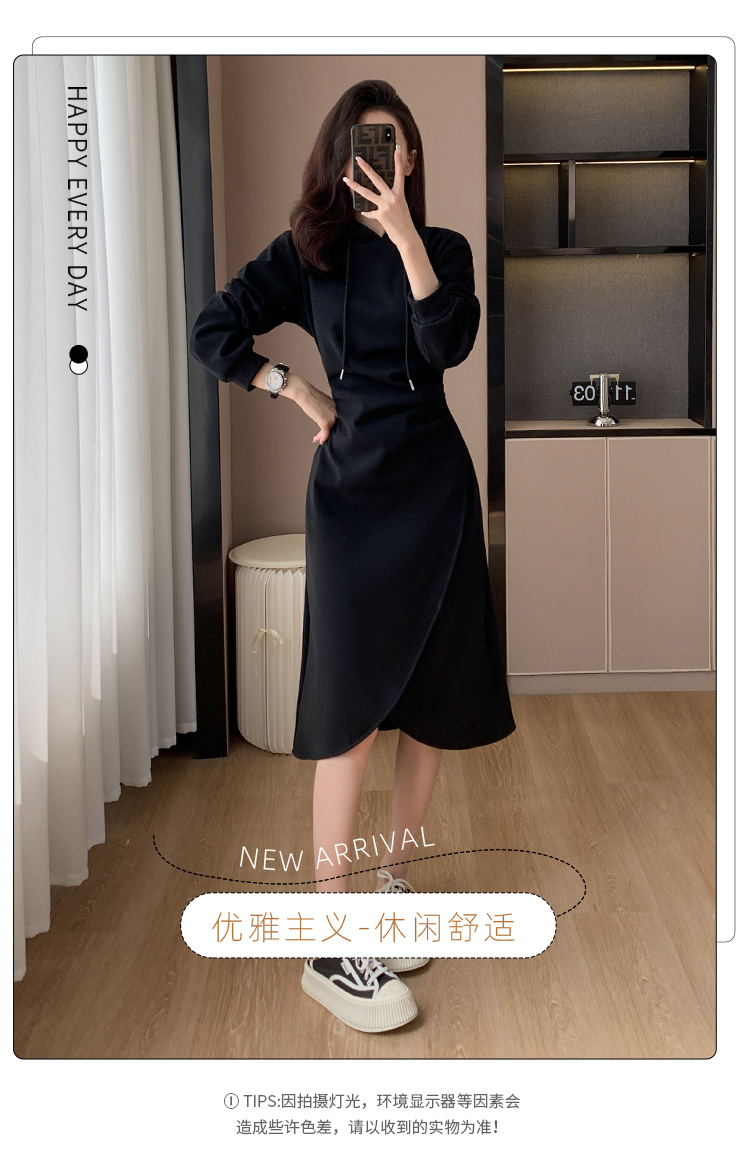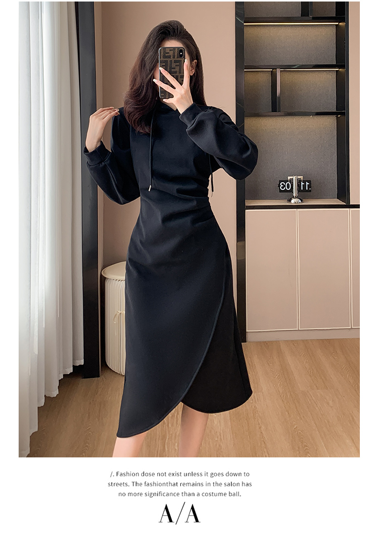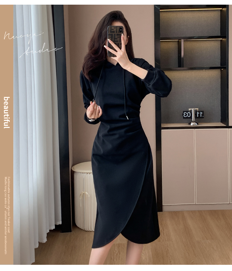 RM26015#黑色长袖卫衣连衣裙女秋季穿搭高级感气质收腰显瘦中长款过膝裙子