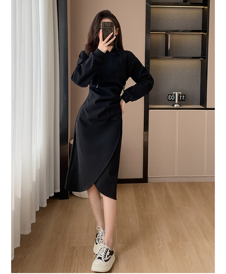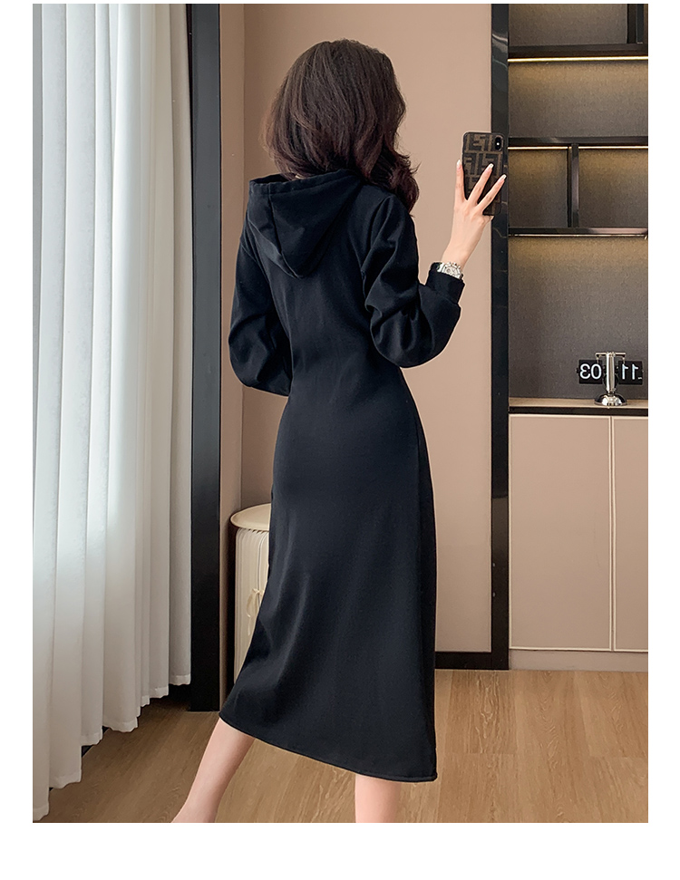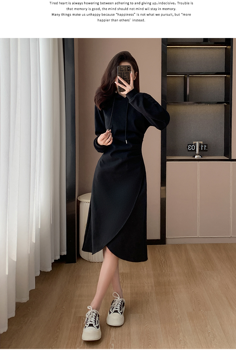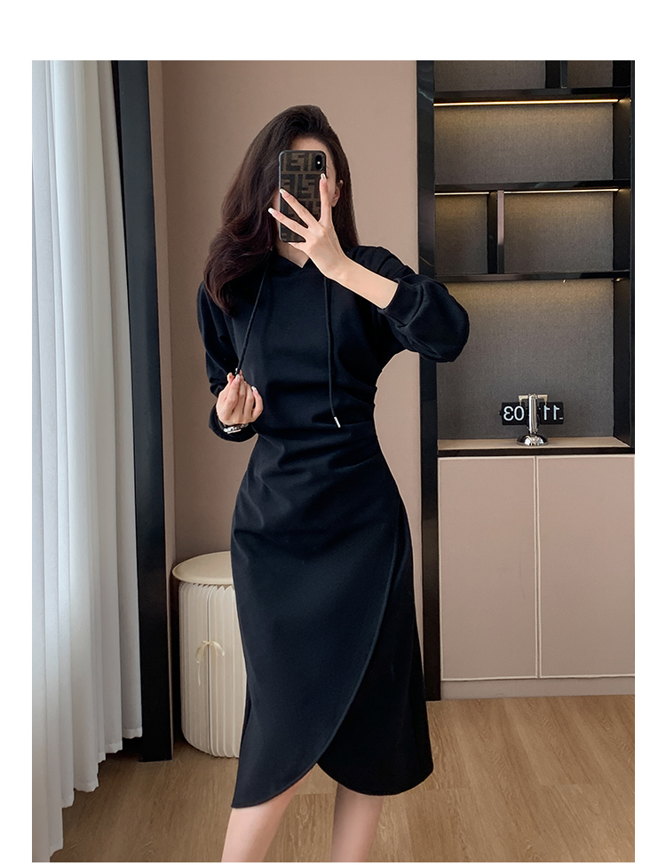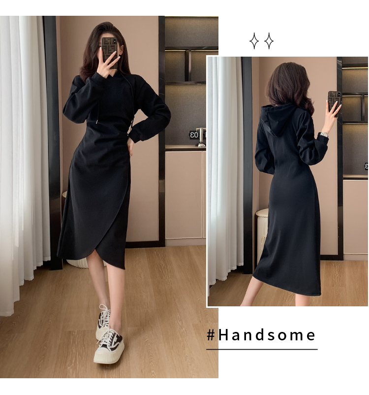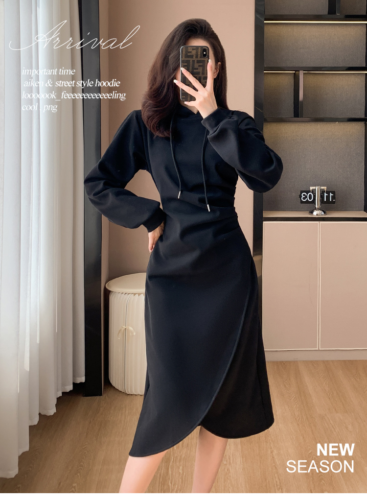 RM26015#黑色长袖卫衣连衣裙女秋季穿搭高级感气质收腰显瘦中长款过膝裙子
