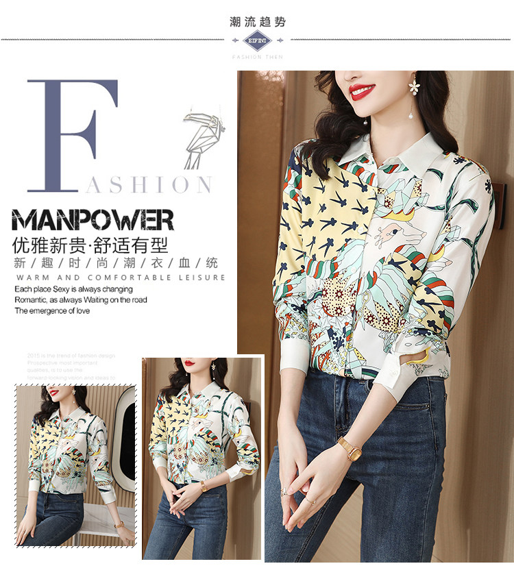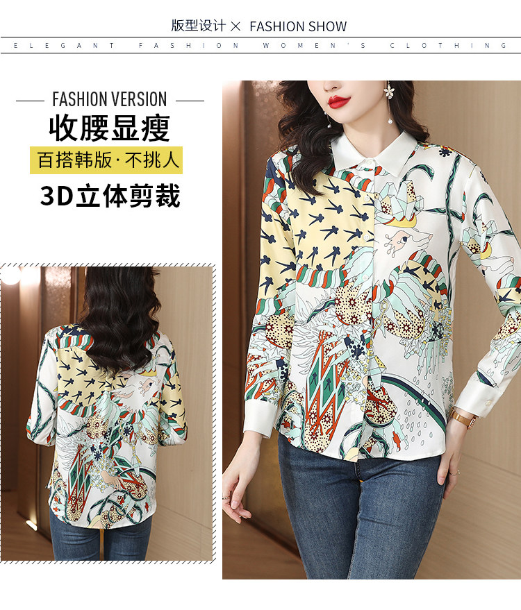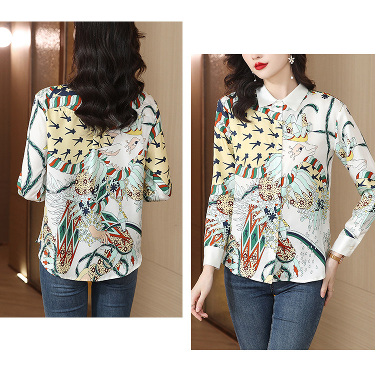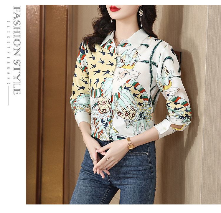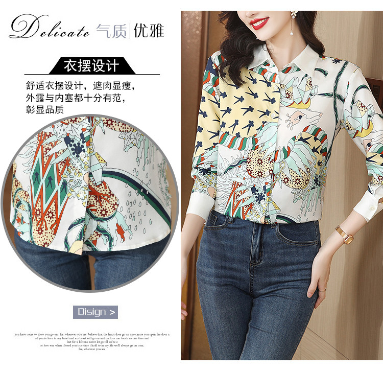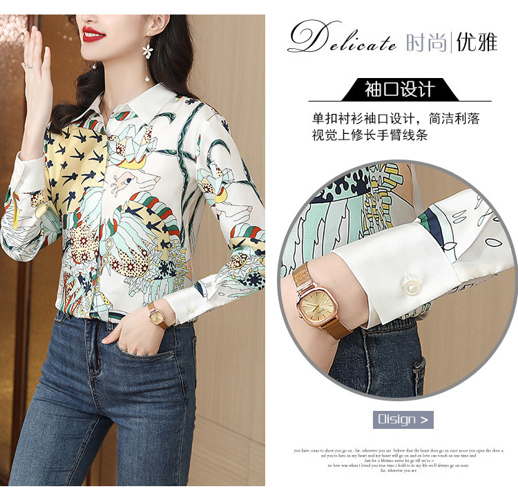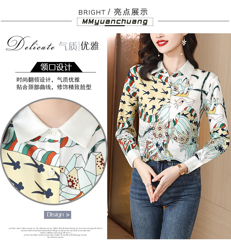 PF21803#新款印花重磅真丝长袖POLO领女士通勤显瘦桑蚕丝OL衬衫女...