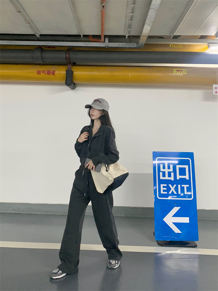 RM26314#设计感宽松双拉链卫衣外套休闲运动裤套装