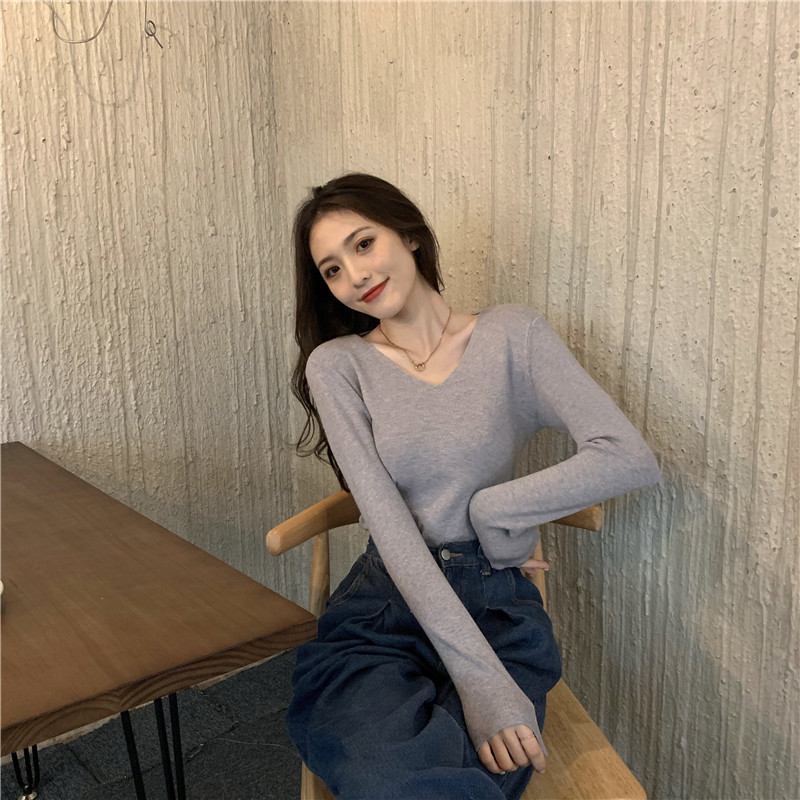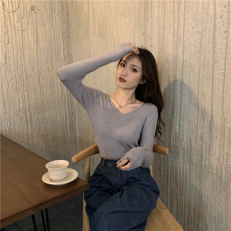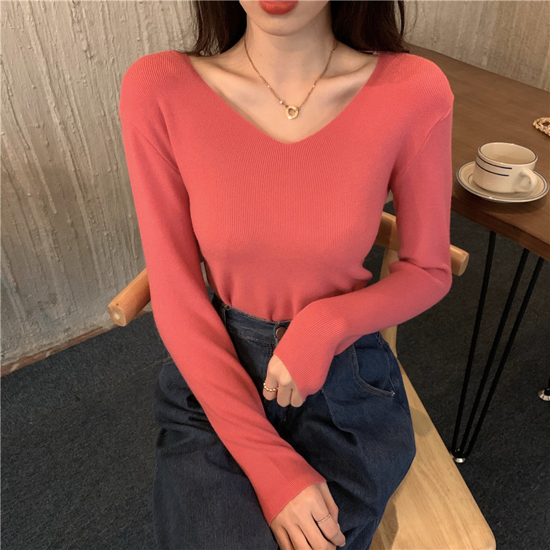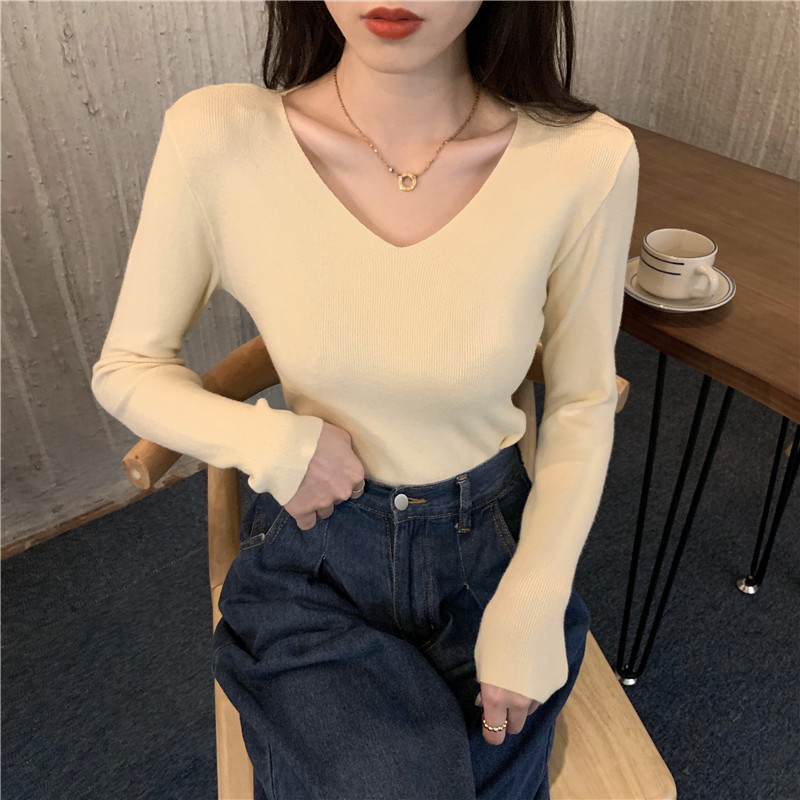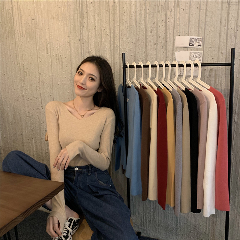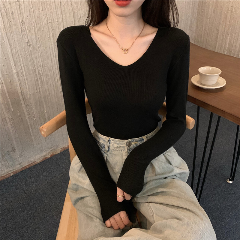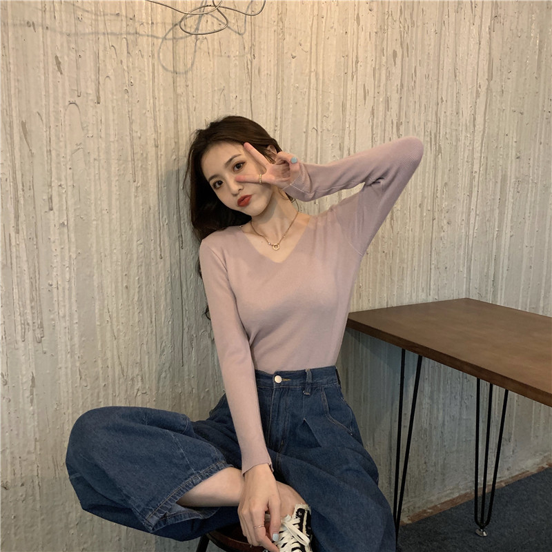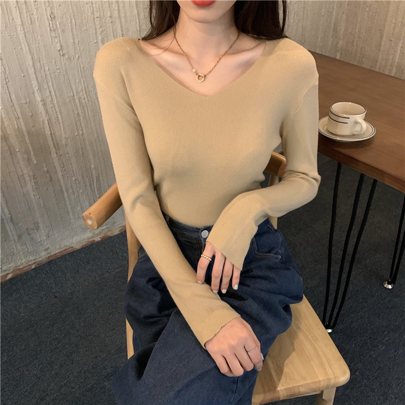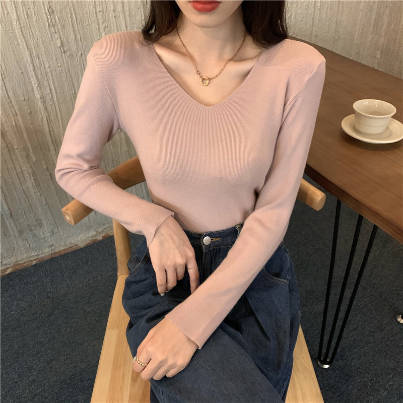 RM26342#新款V领长袖针织衫百搭修身显瘦打底上衣
