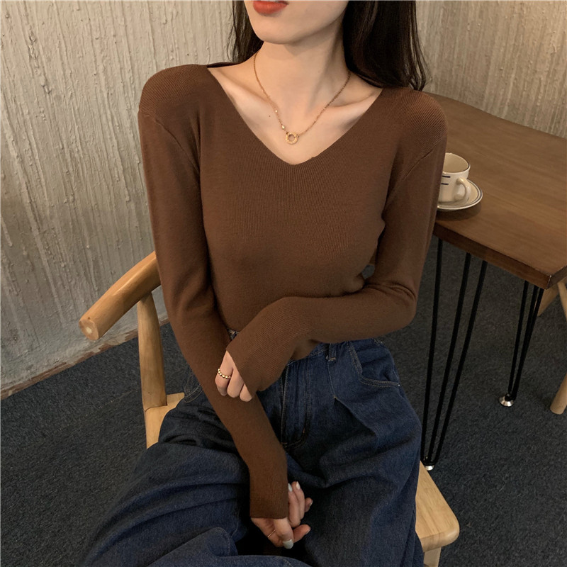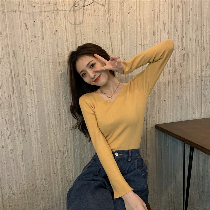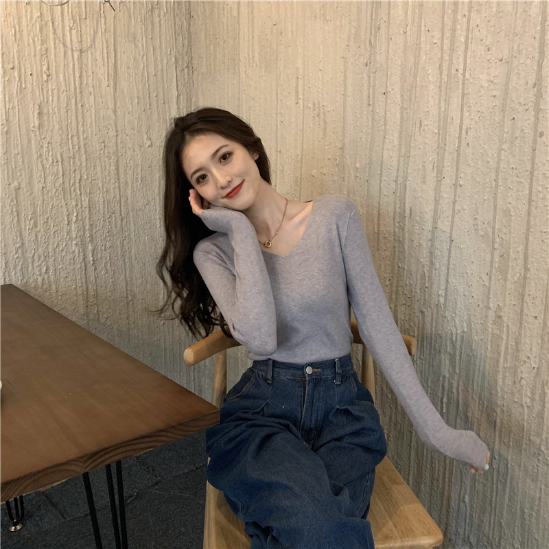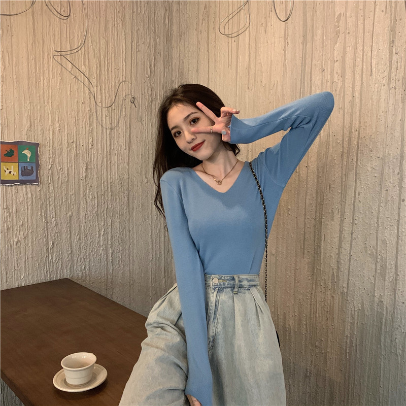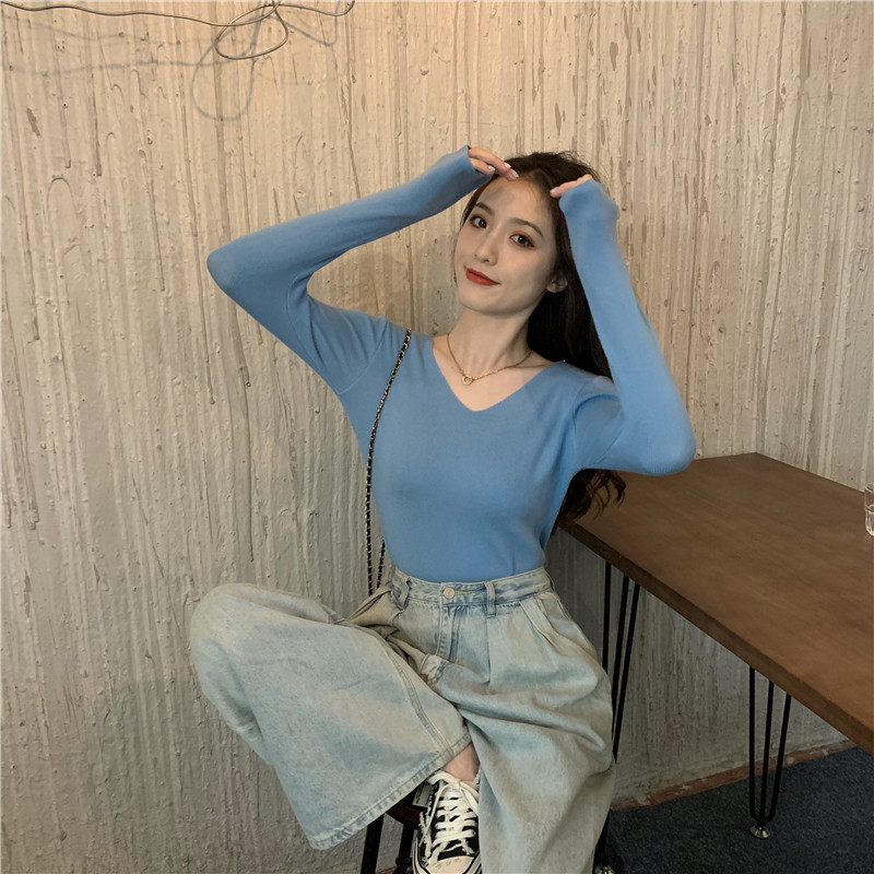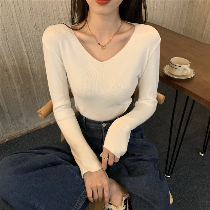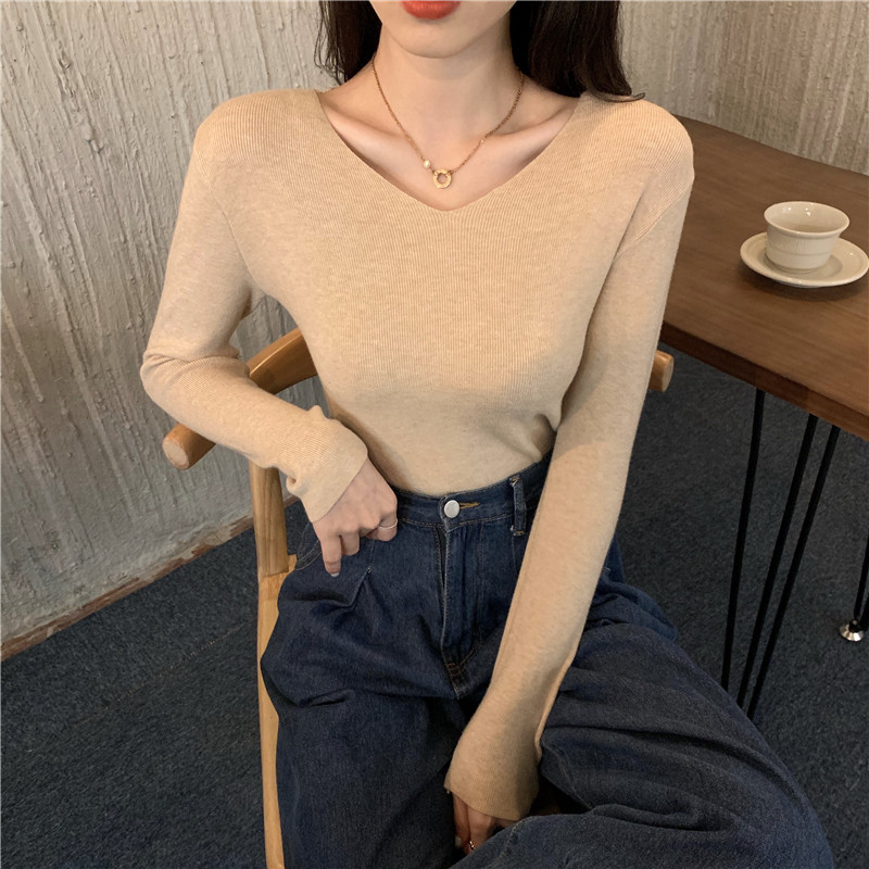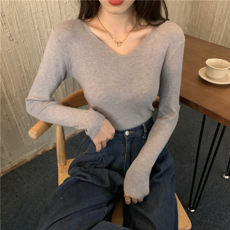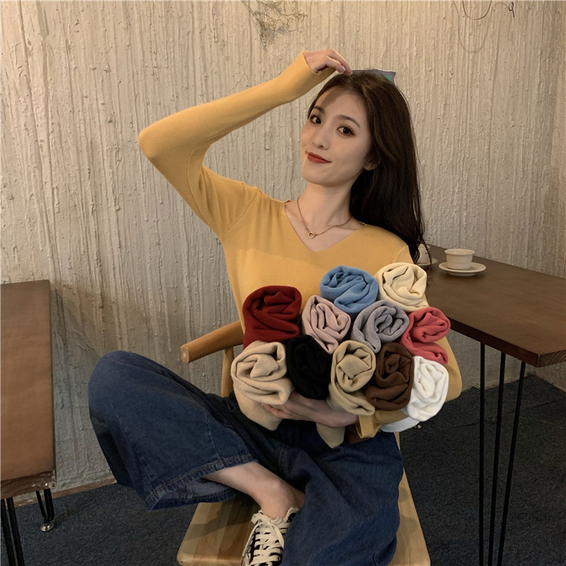 RM26342#新款V领长袖针织衫百搭修身显瘦打底上衣