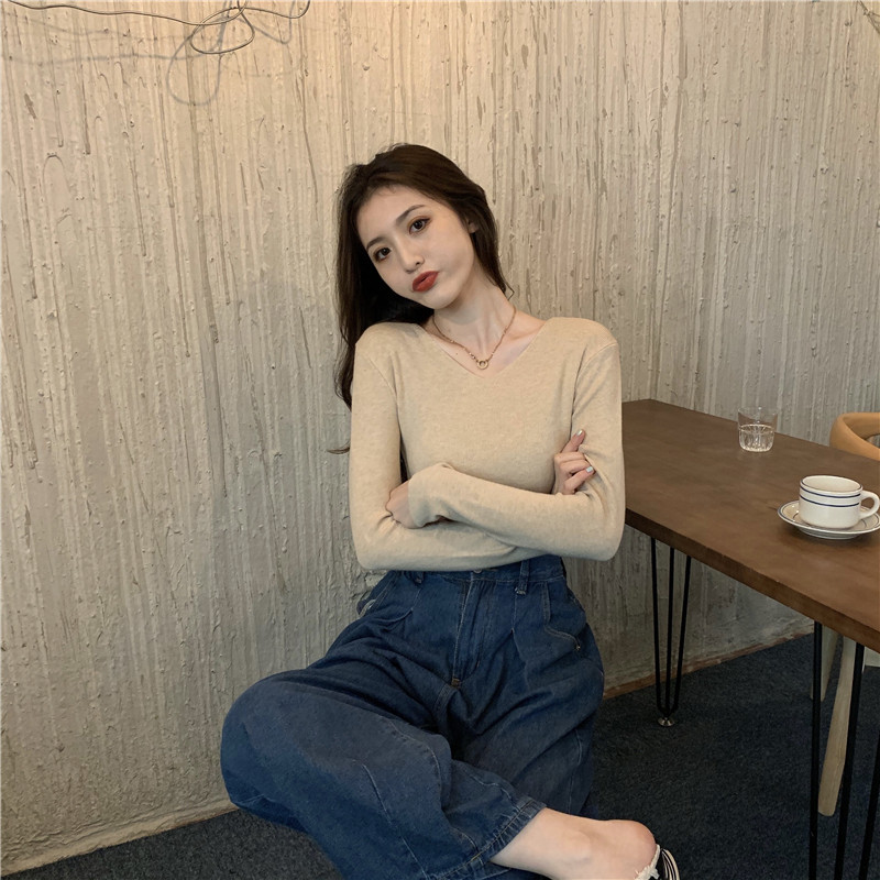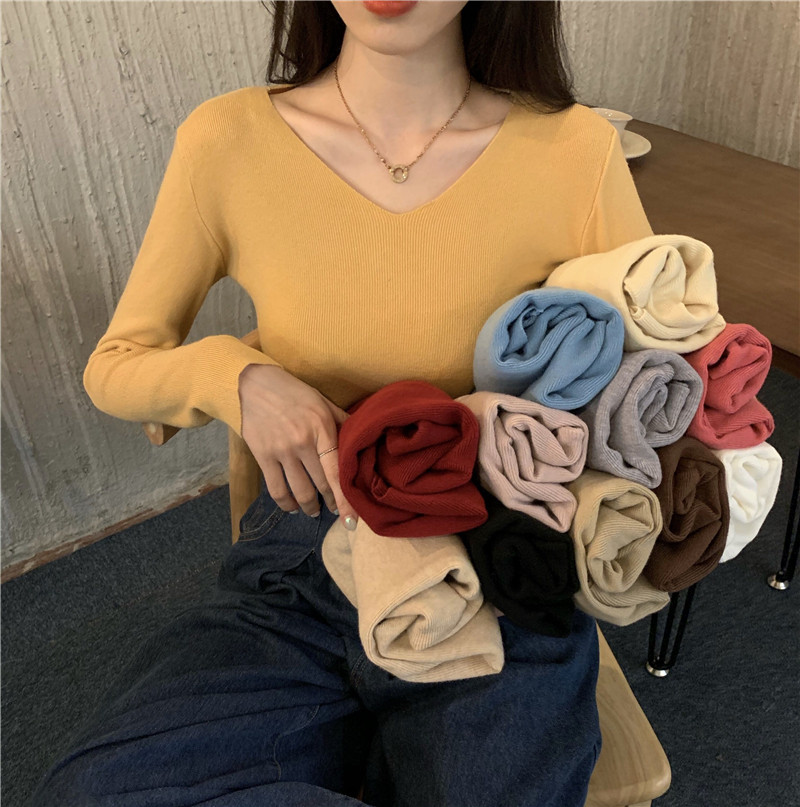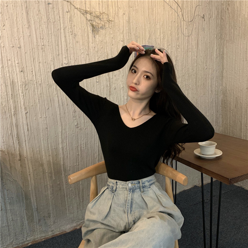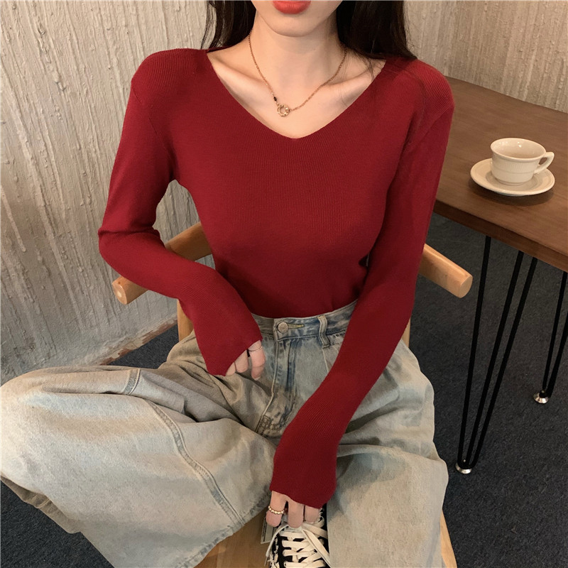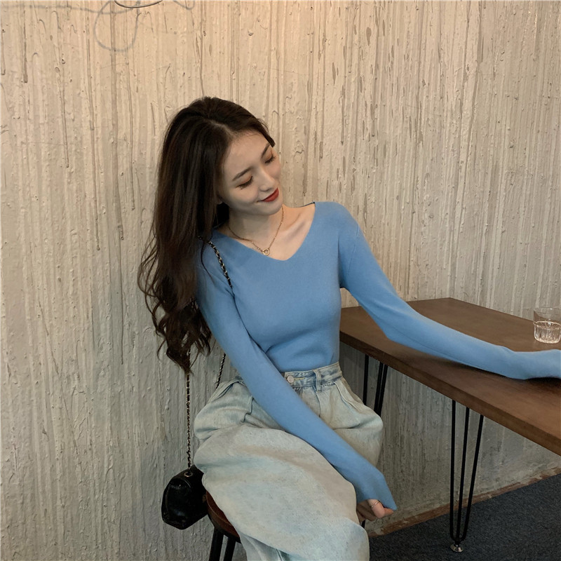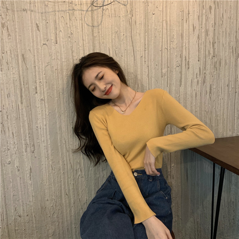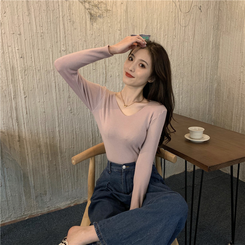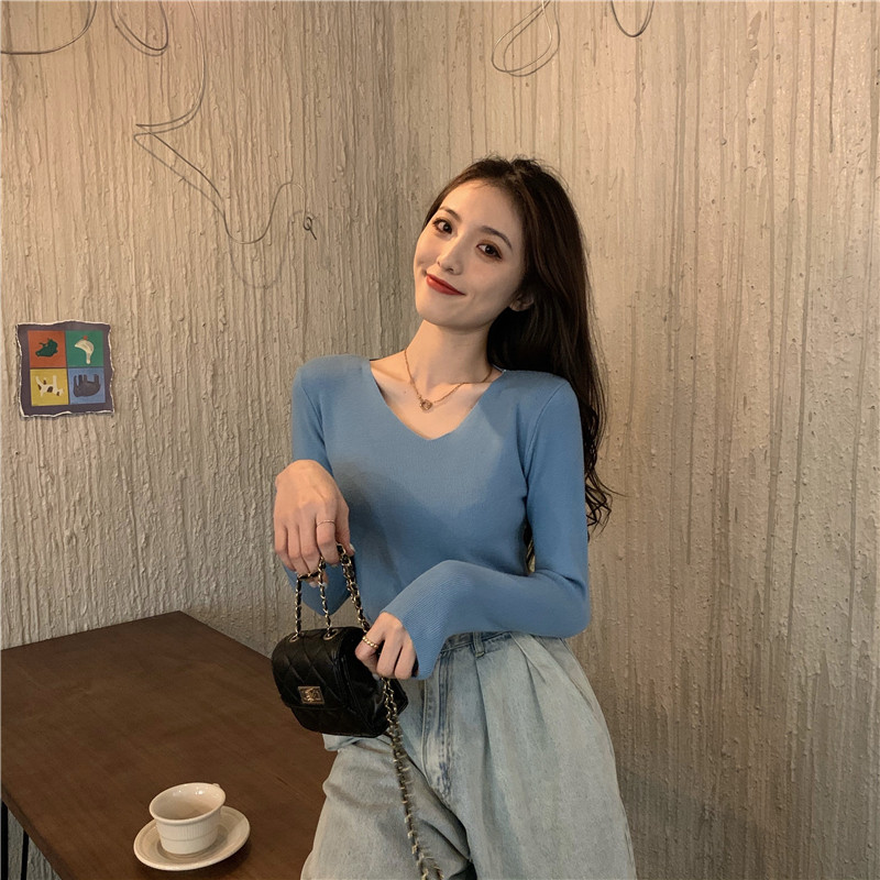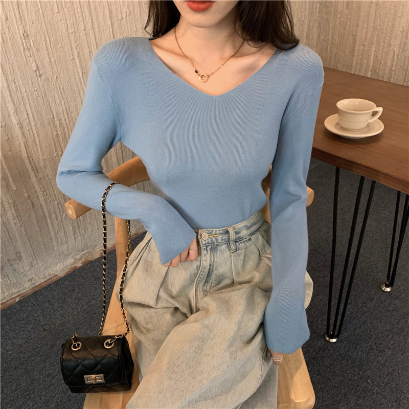 RM26342#新款V领长袖针织衫百搭修身显瘦打底上衣