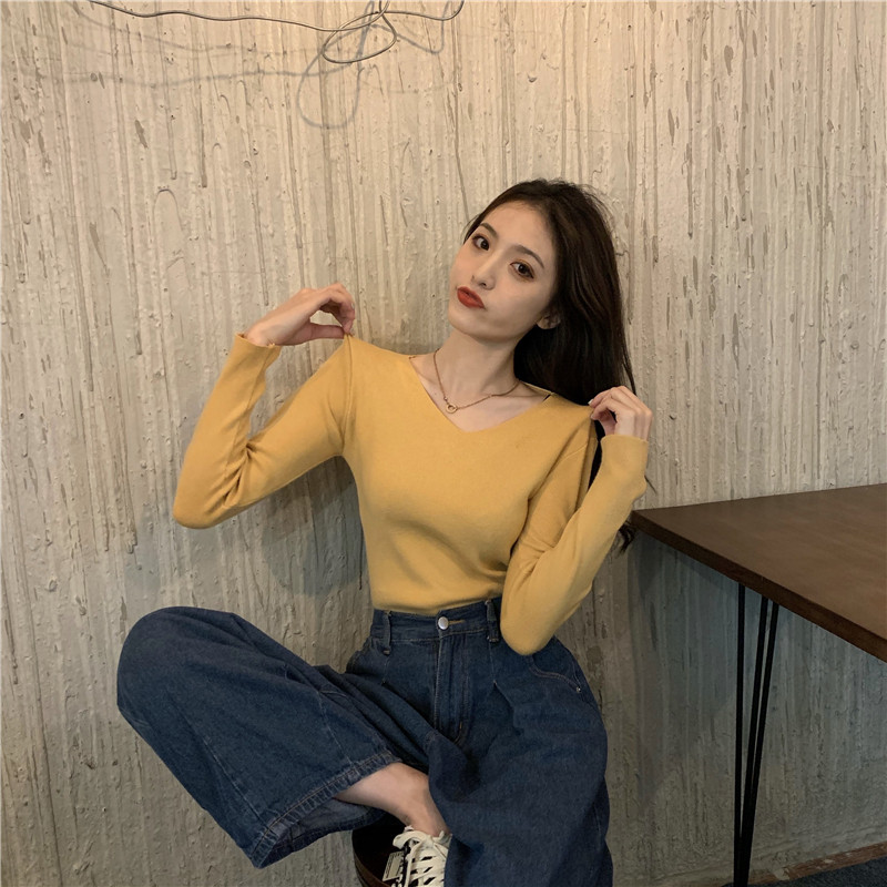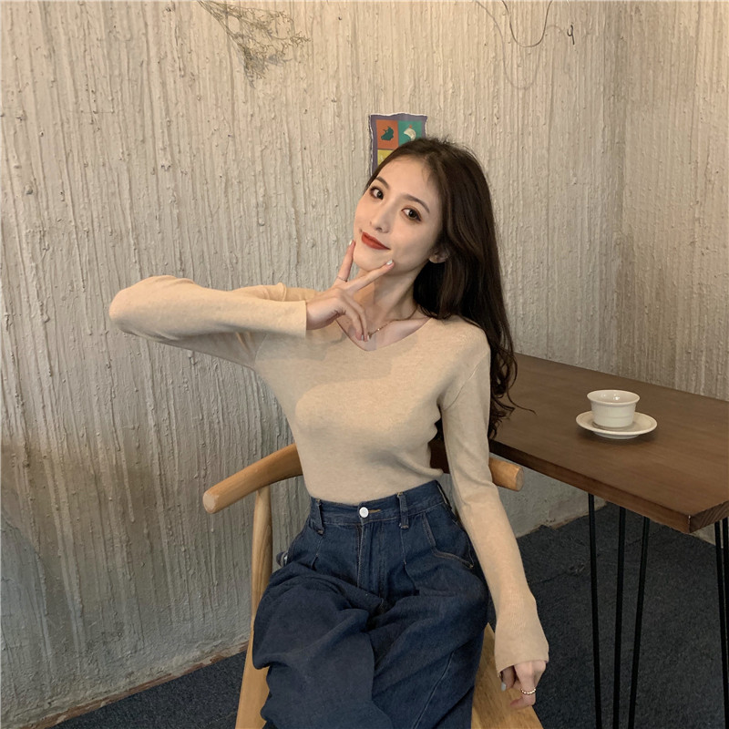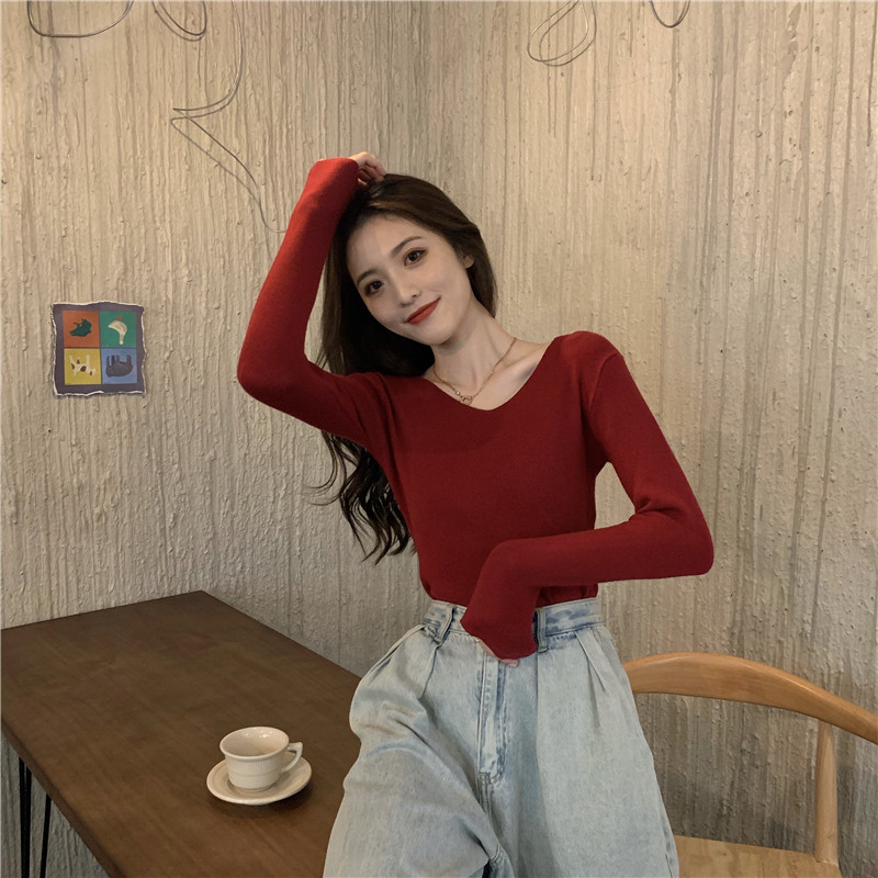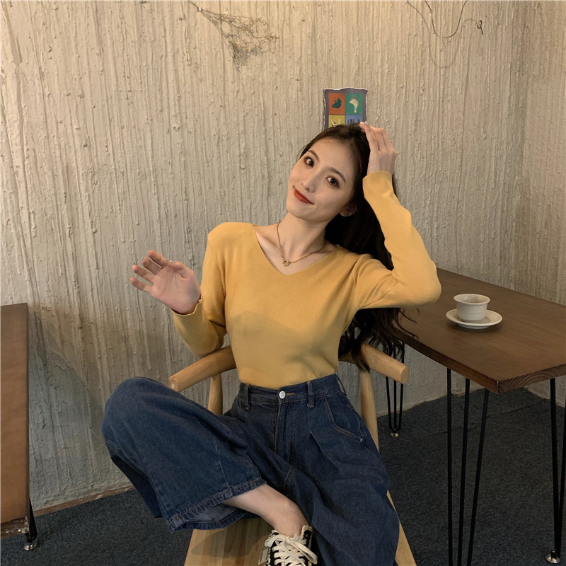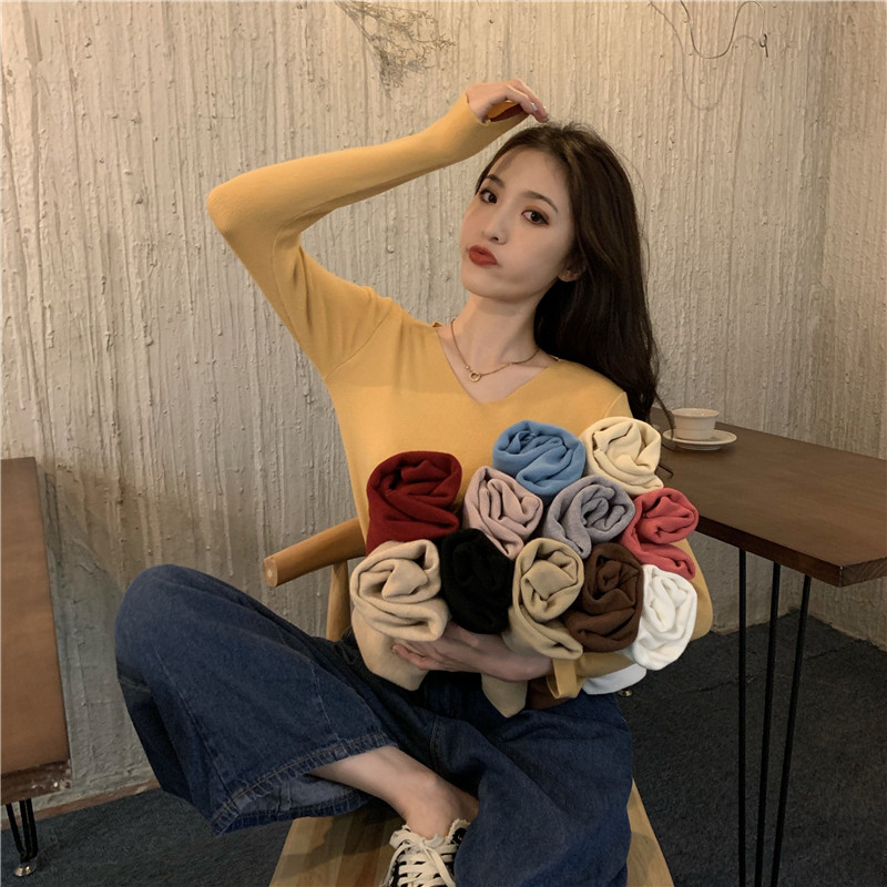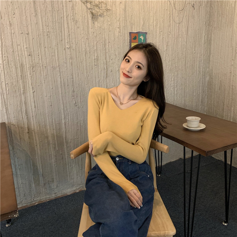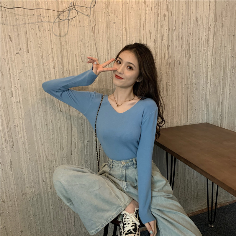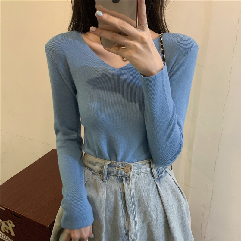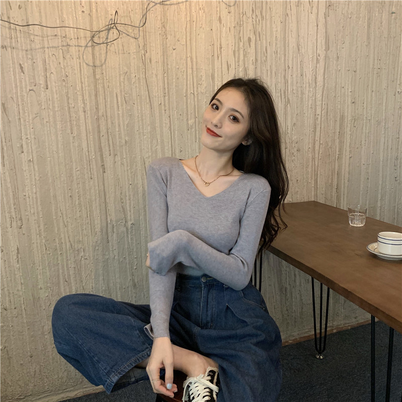 RM26342#新款V领长袖针织衫百搭修身显瘦打底上衣