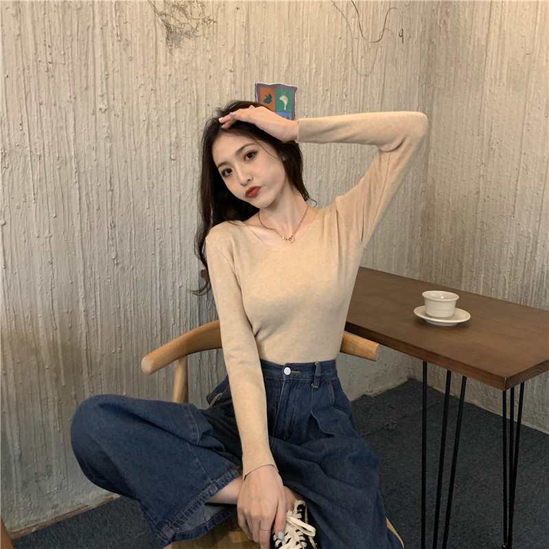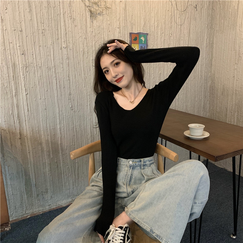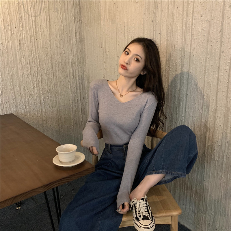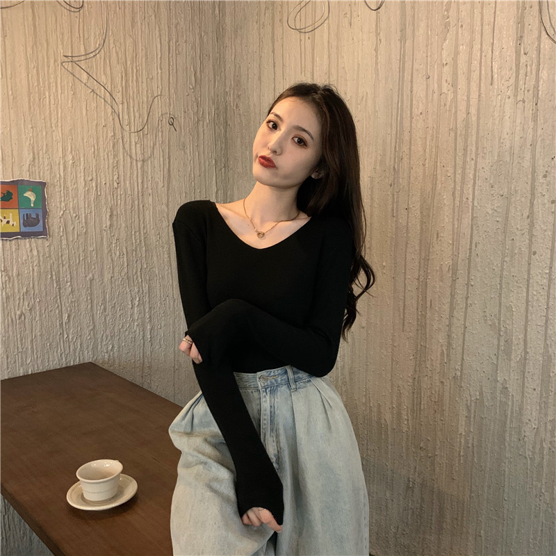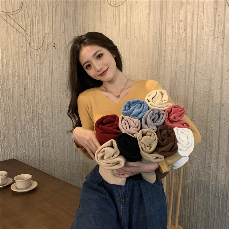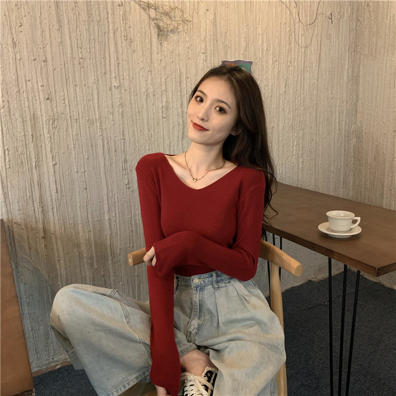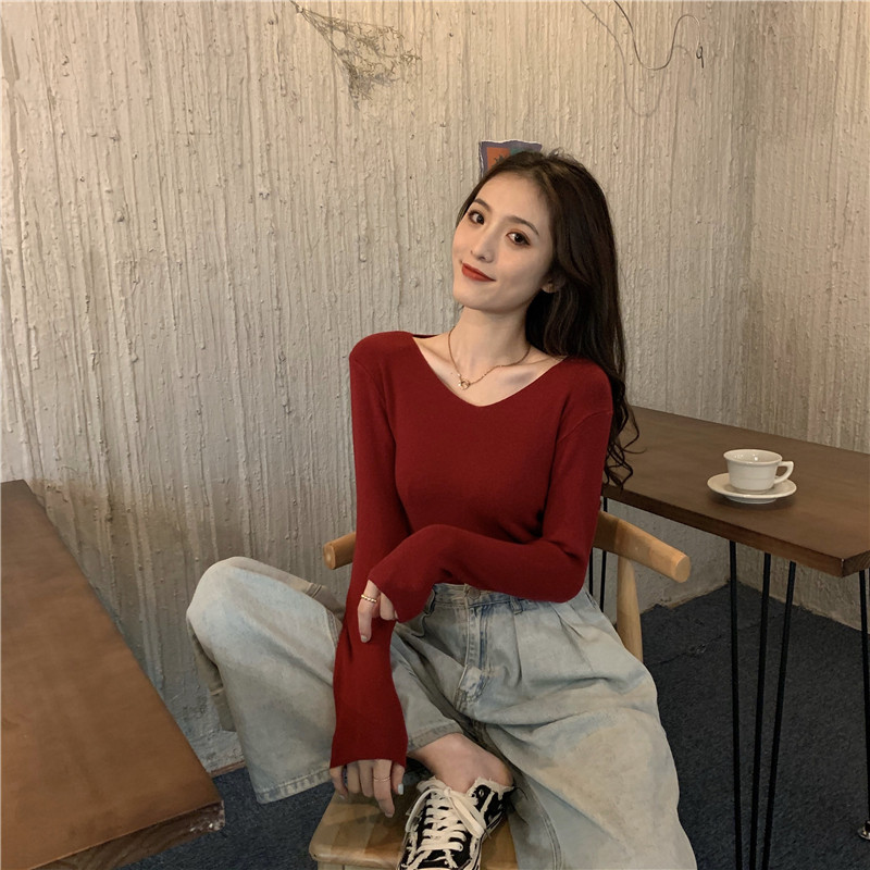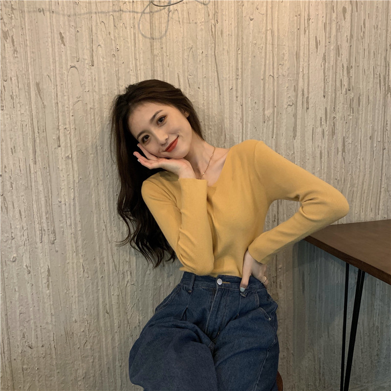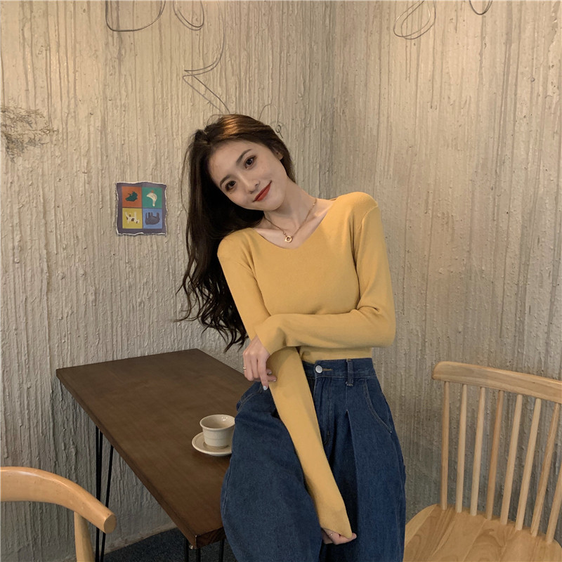 RM26342#新款V领长袖针织衫百搭修身显瘦打底上衣