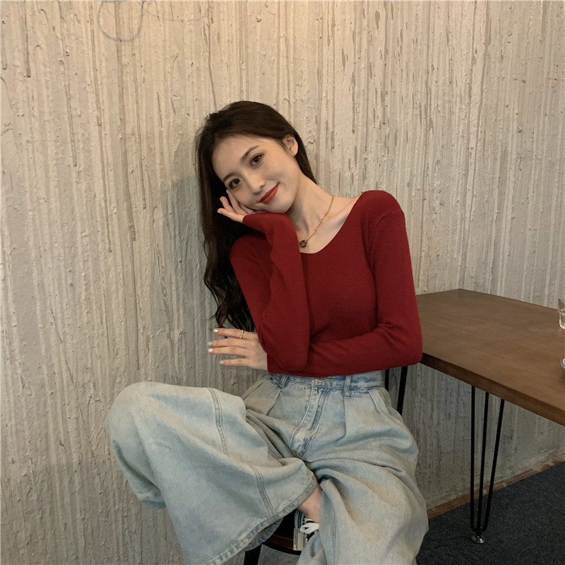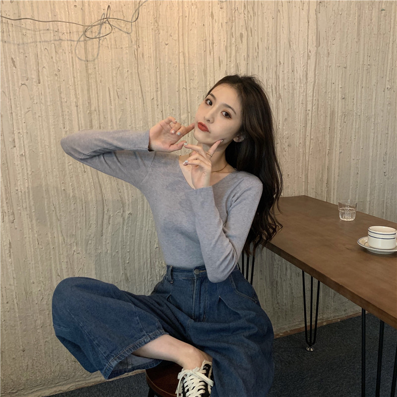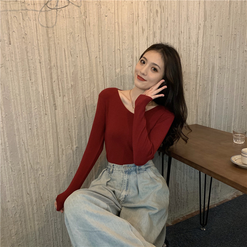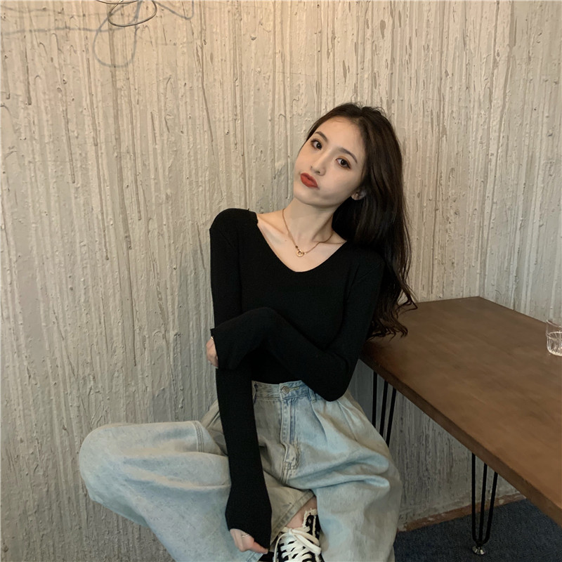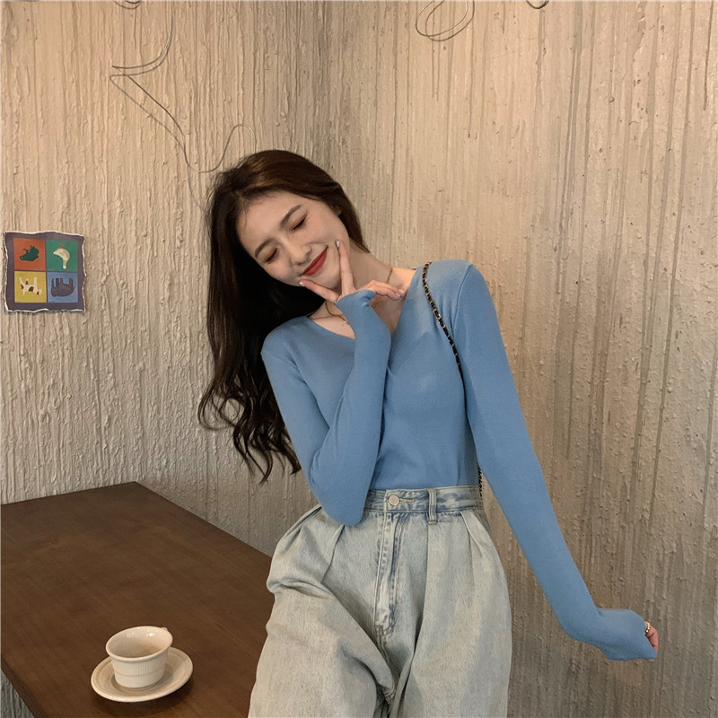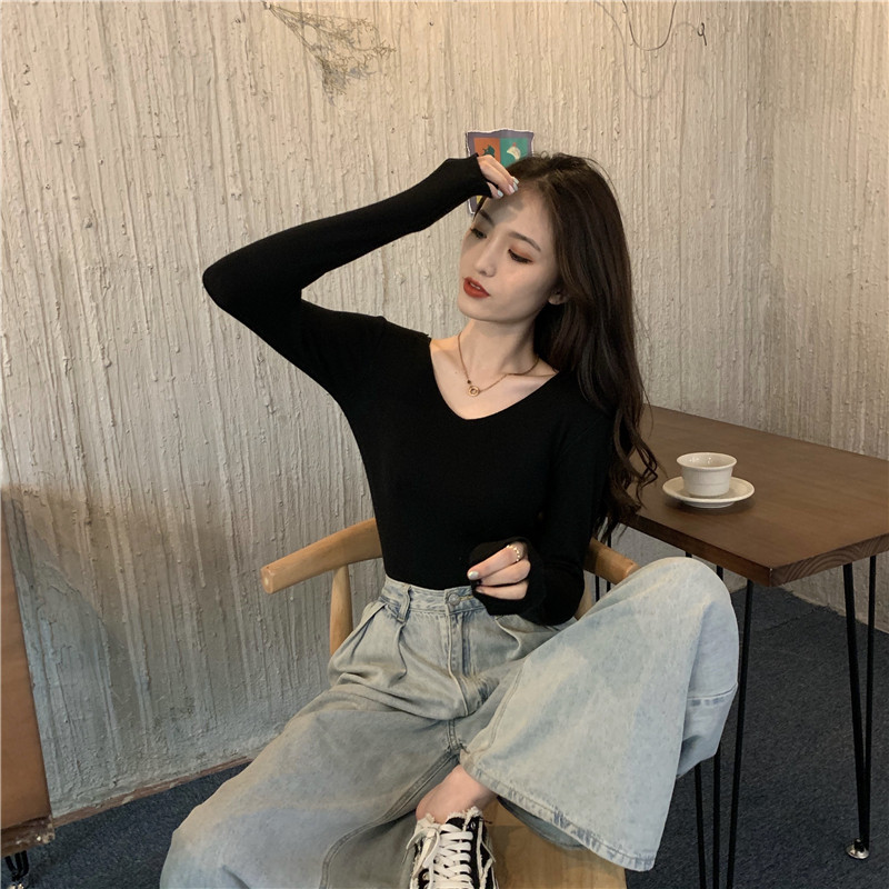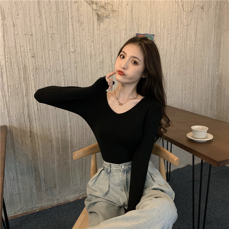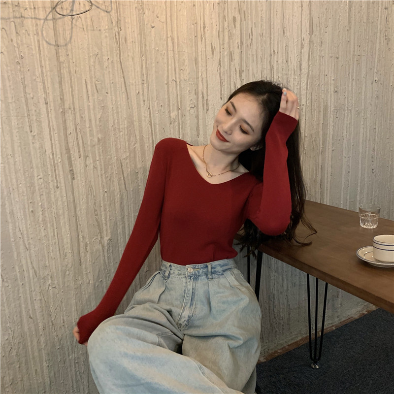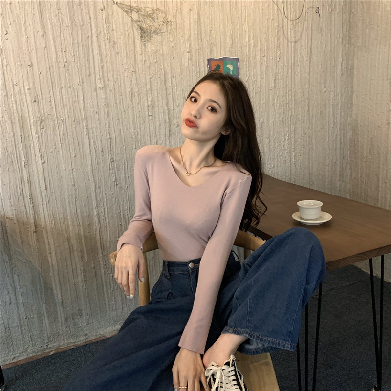 RM26342#新款V领长袖针织衫百搭修身显瘦打底上衣