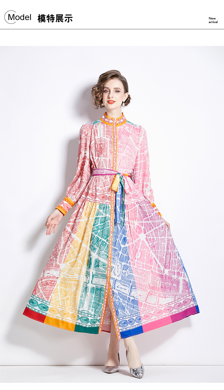 RM26370#新款民族风复古立领灯笼袖拼色印花连衣裙