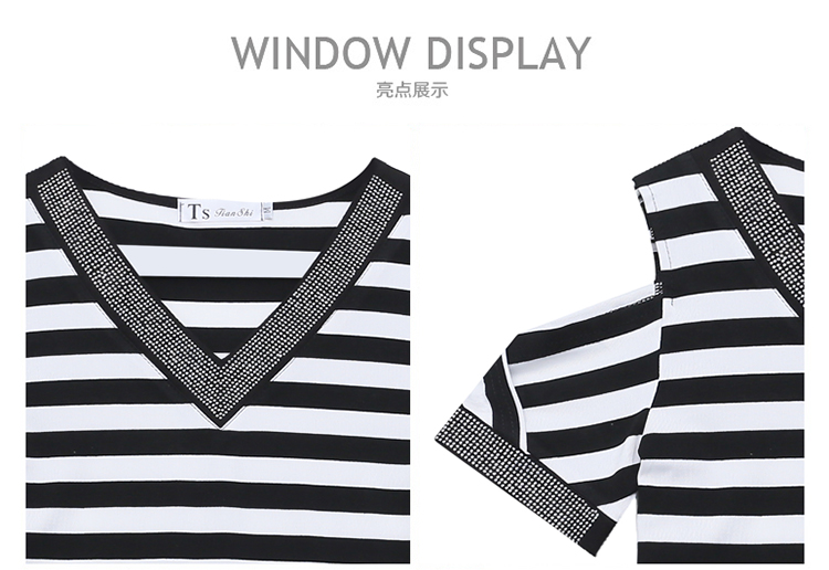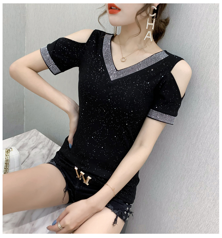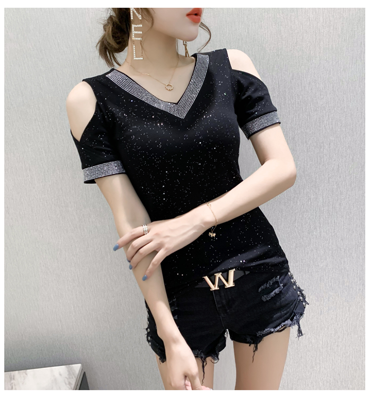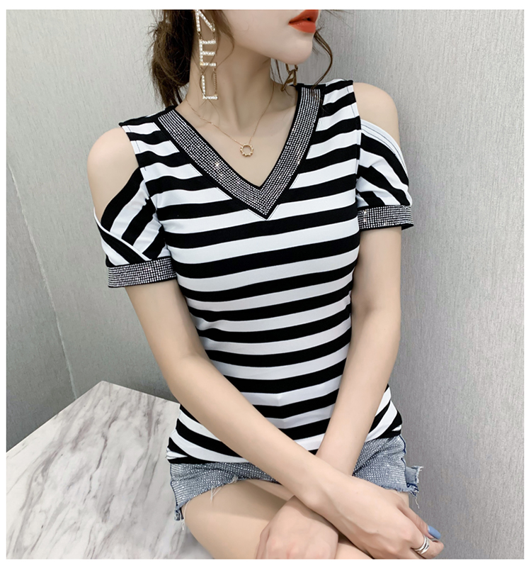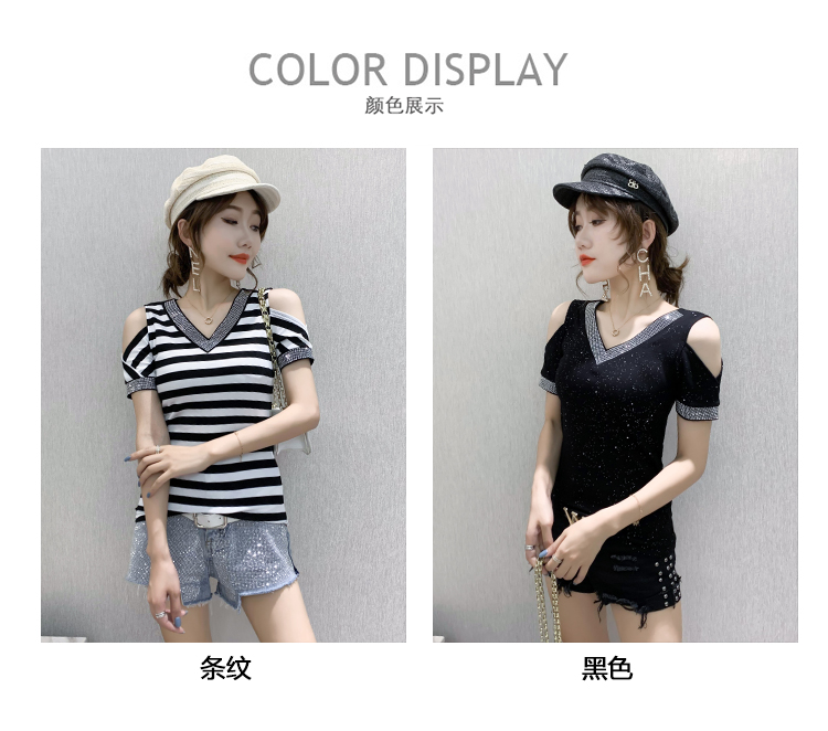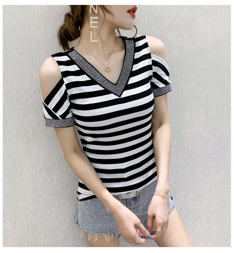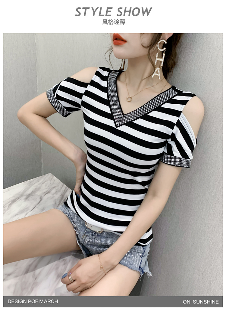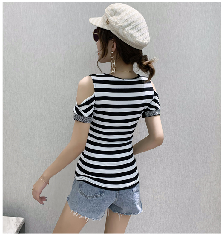 RY1904#夏季新款时尚烫钻条纹短袖T恤女洋气露肩性感上衣心机镂空欧货衫