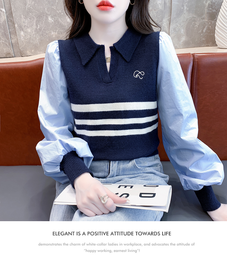RM26445#条纹拼色翻领T恤上衣女秋季新款简约套头长袖冰丝针织衫