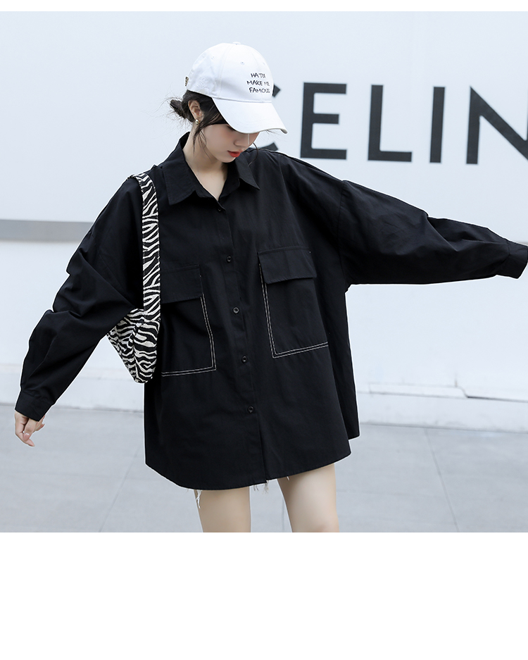RM26481#韩版休闲H型宽松纯色时尚帅气纯棉撞色单排扣衬衣