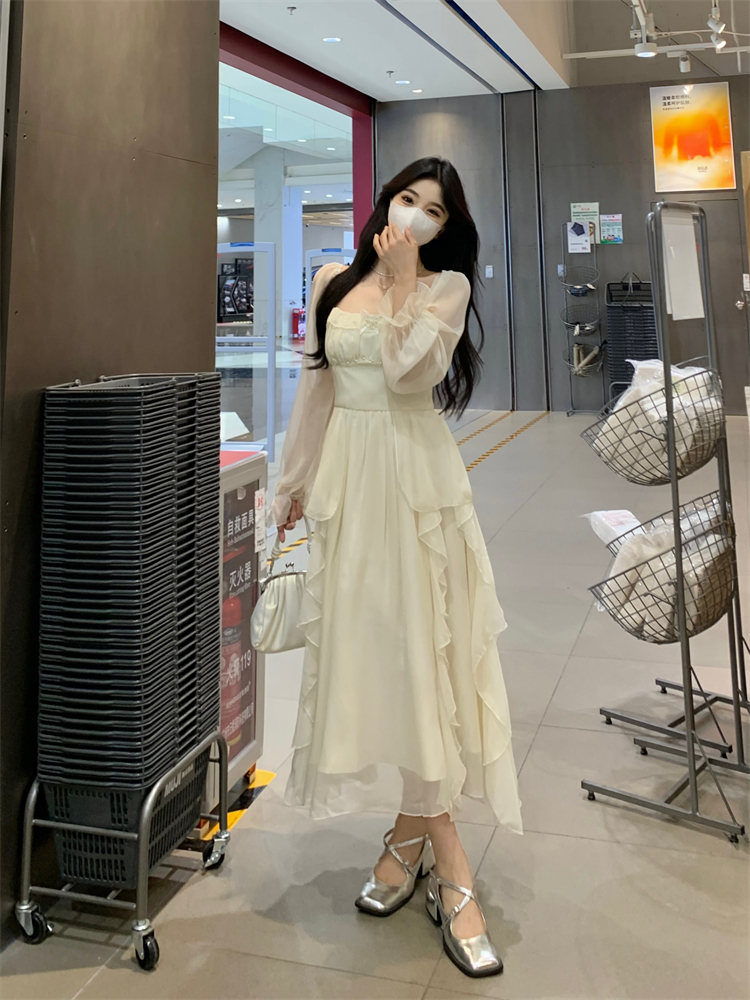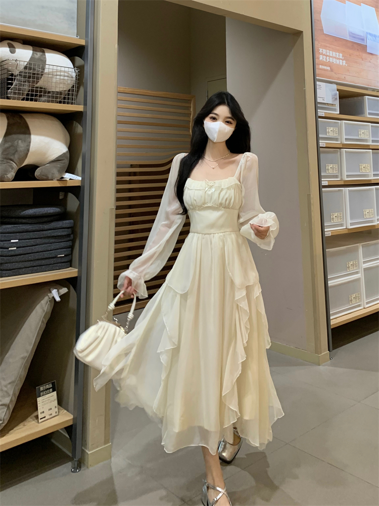 RM27330#大码女装法式方领温柔仙女风长连衣裙春秋显瘦遮肚荷叶边气质长裙