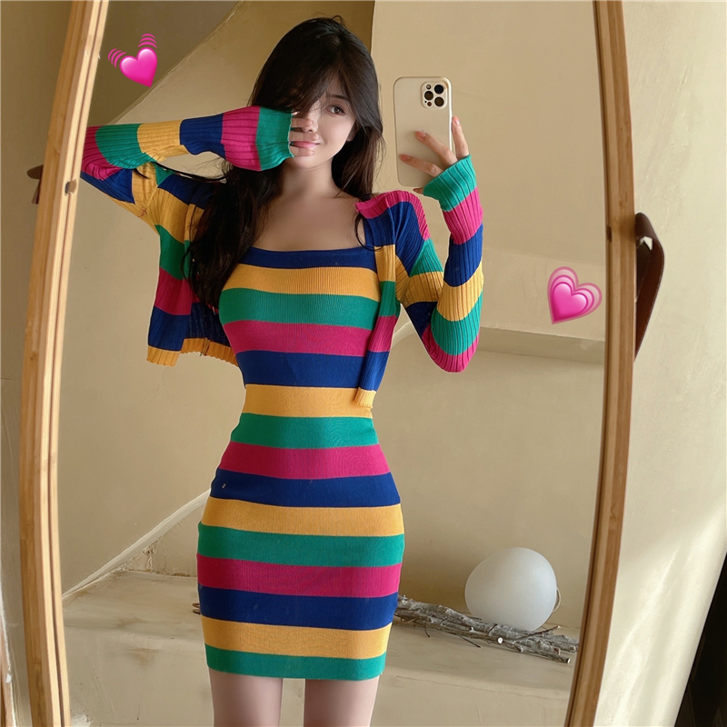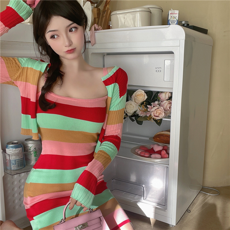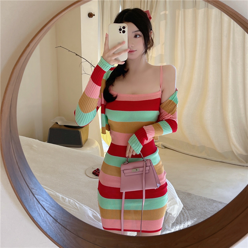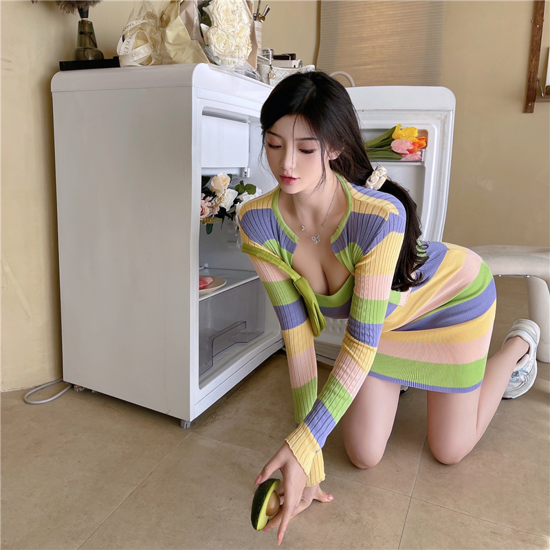 RM27593#纯欲毛毛领修身包臀开衩针织连衣裙