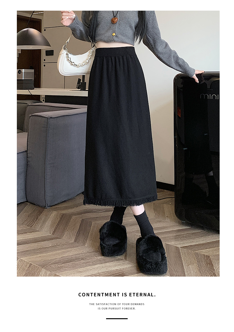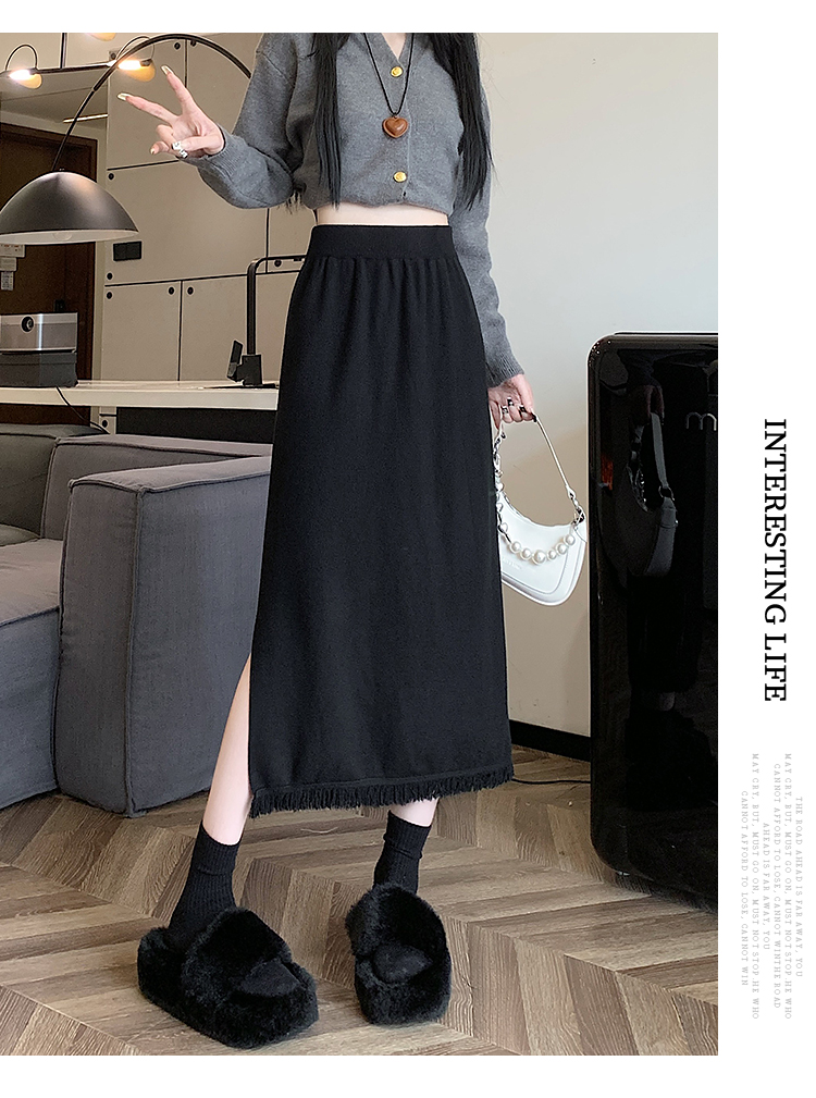 RM27739#针织半身裙2023秋冬加厚中长款流苏开叉a字直筒一步裙毛线裙