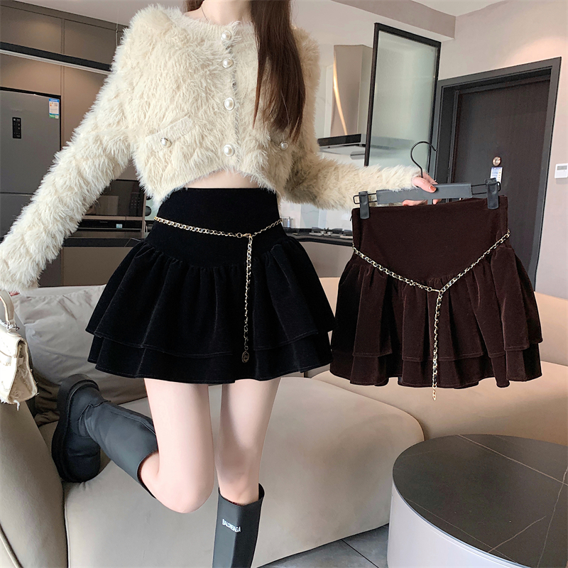 RM27854#金丝绒高腰显瘦荷叶边半身裙防走光短裙a字裙配链条腰带