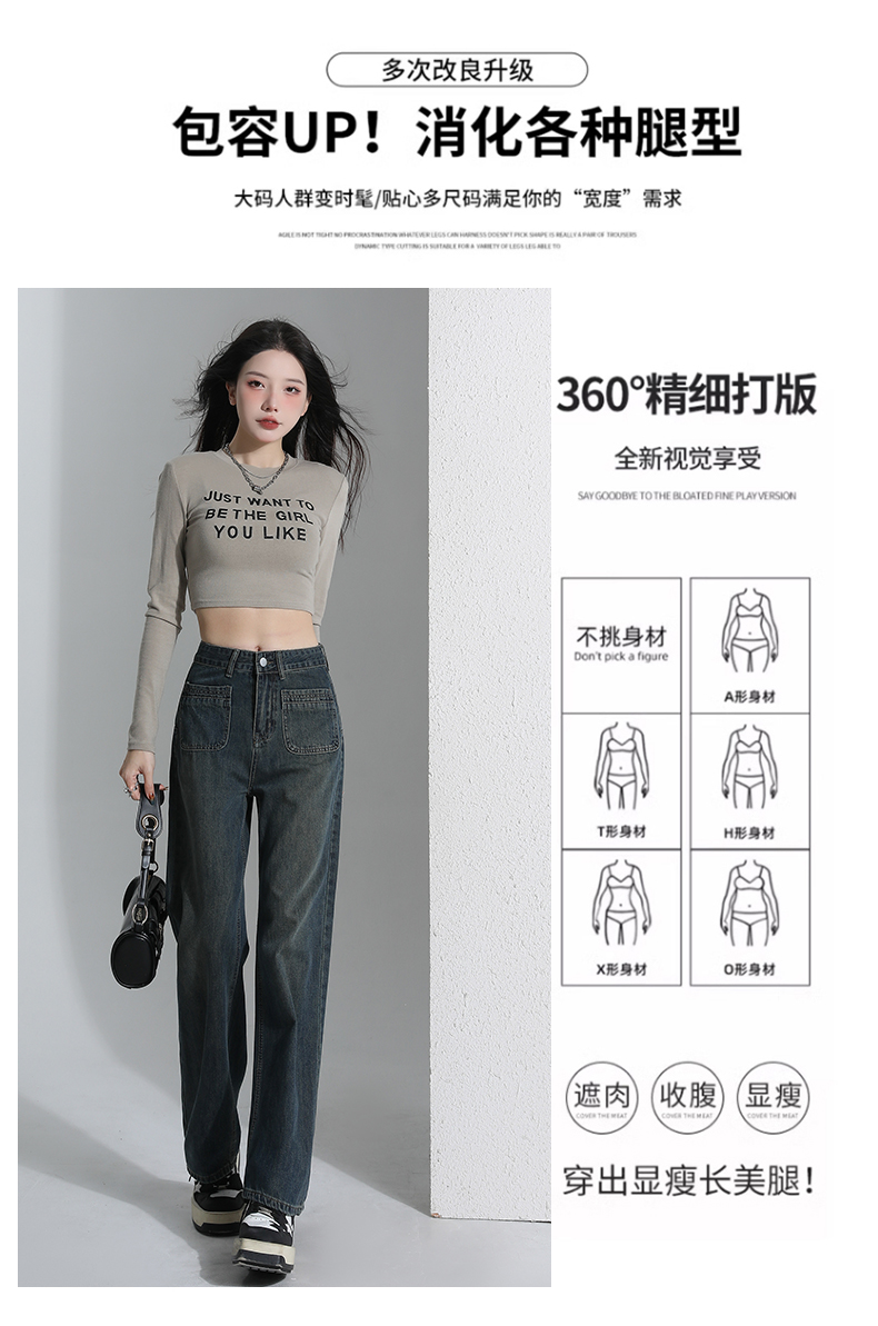 RM27927#高质量水泥灰直筒牛仔裤女新款复古显瘦宽松高腰阔腿裤长裤加长