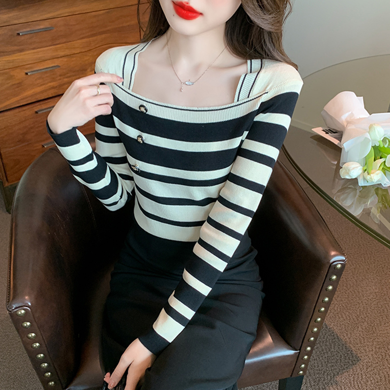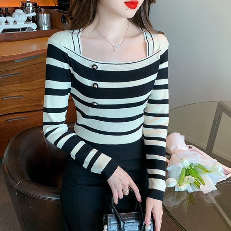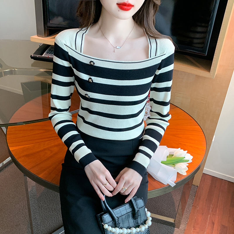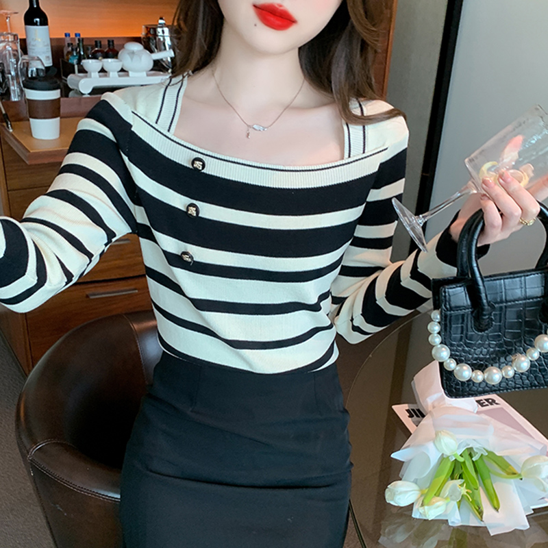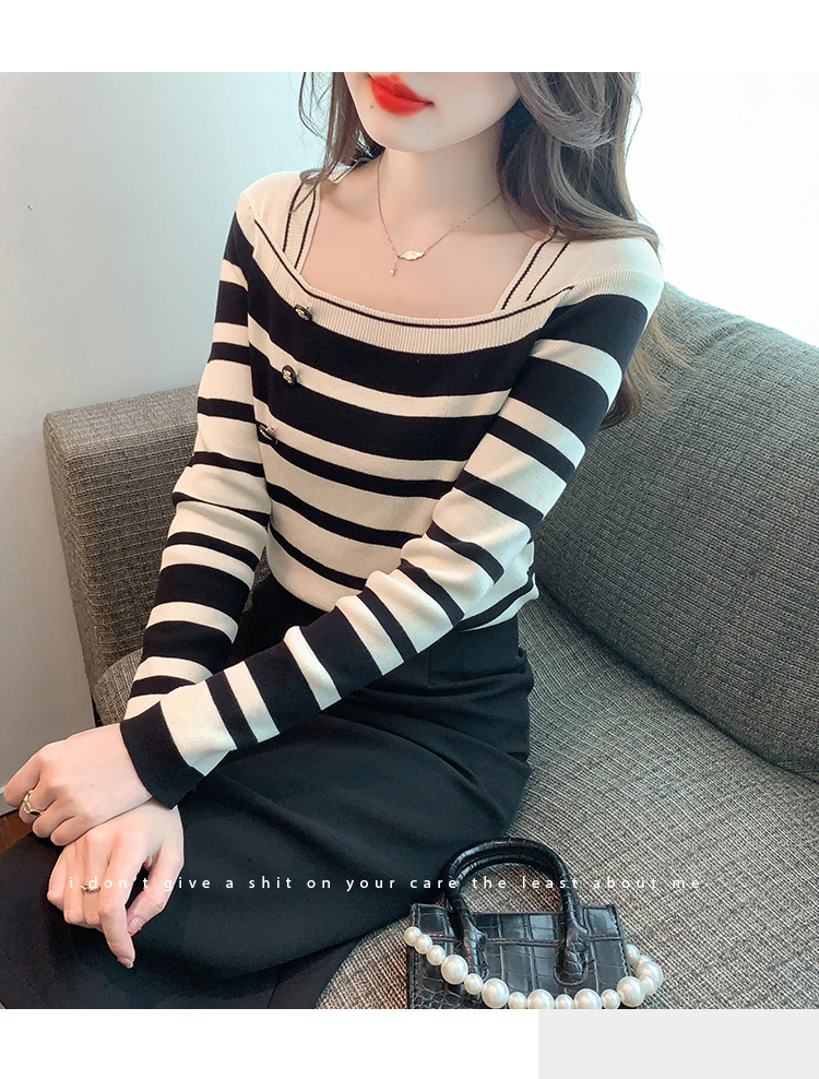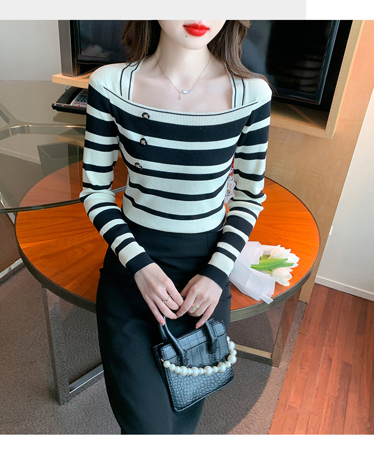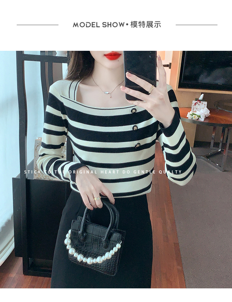 RM28274#内搭法式方领条纹慵懒风显瘦宽松长袖针织上衣