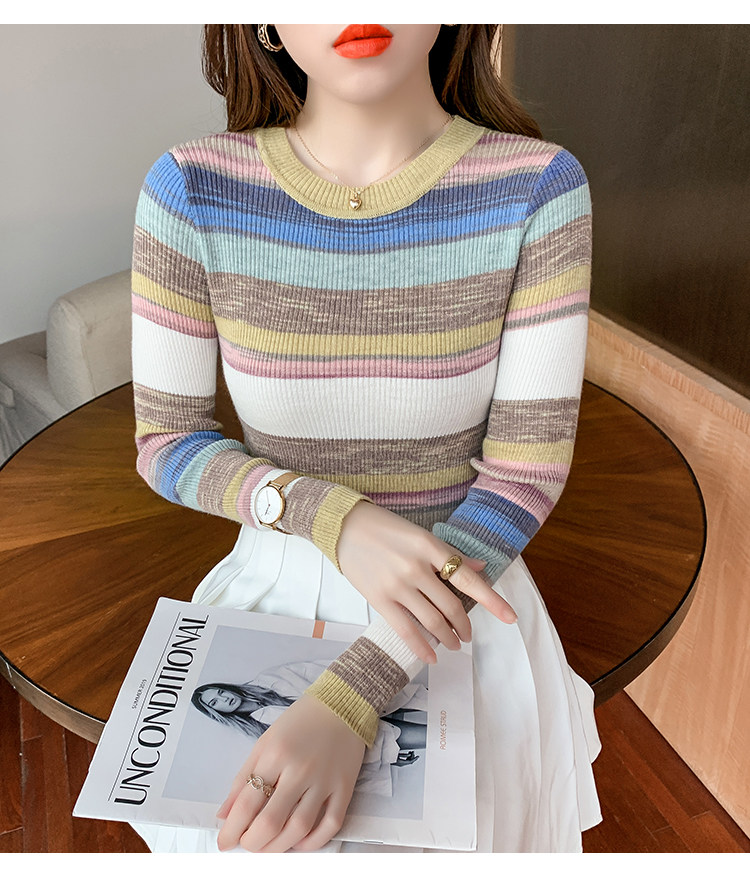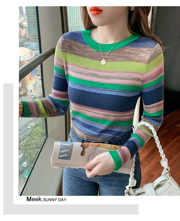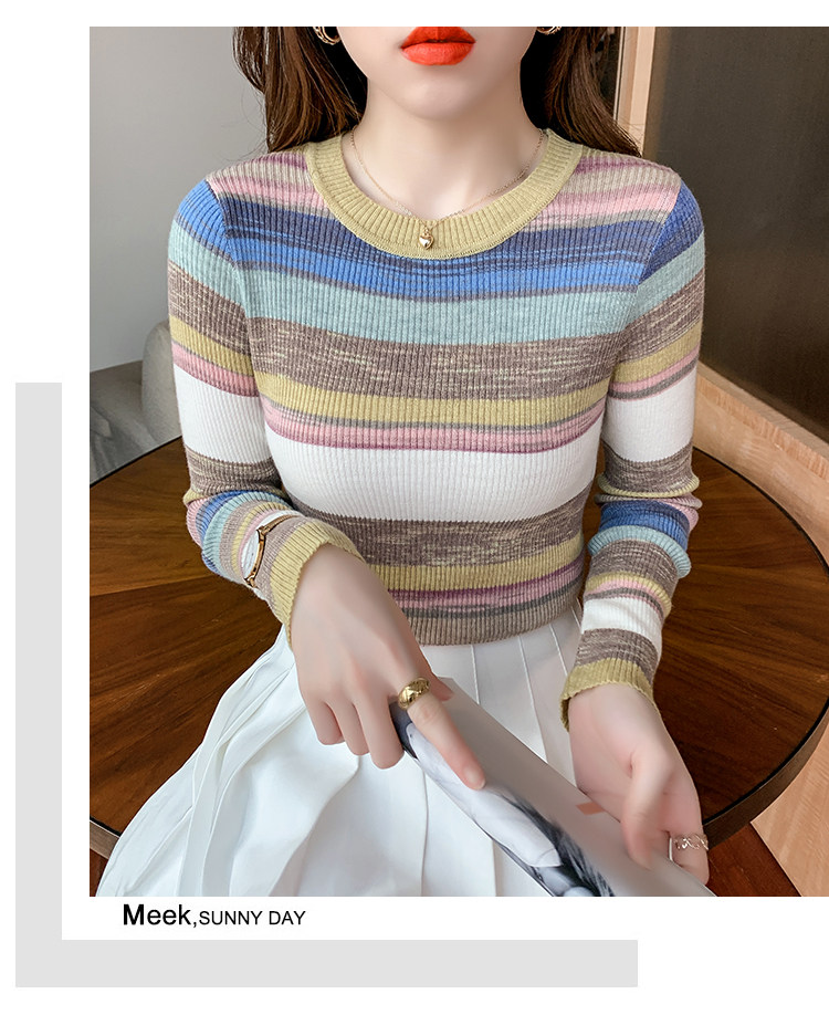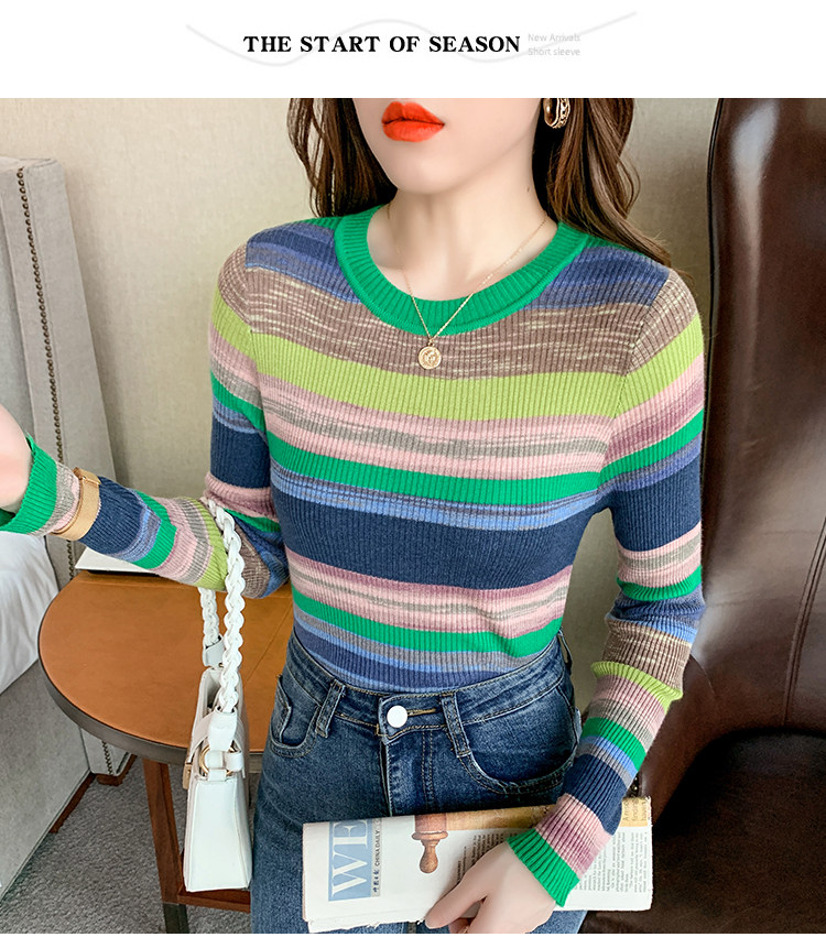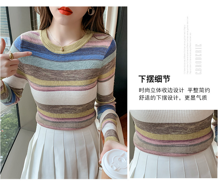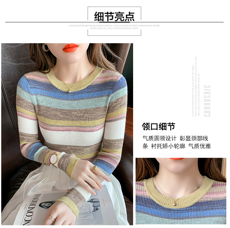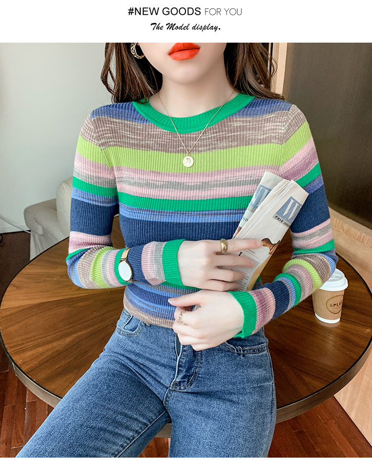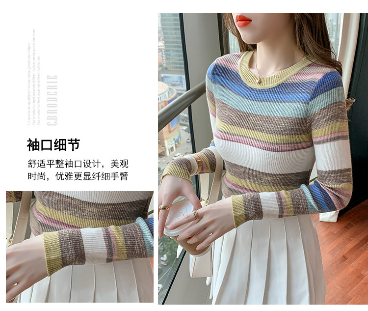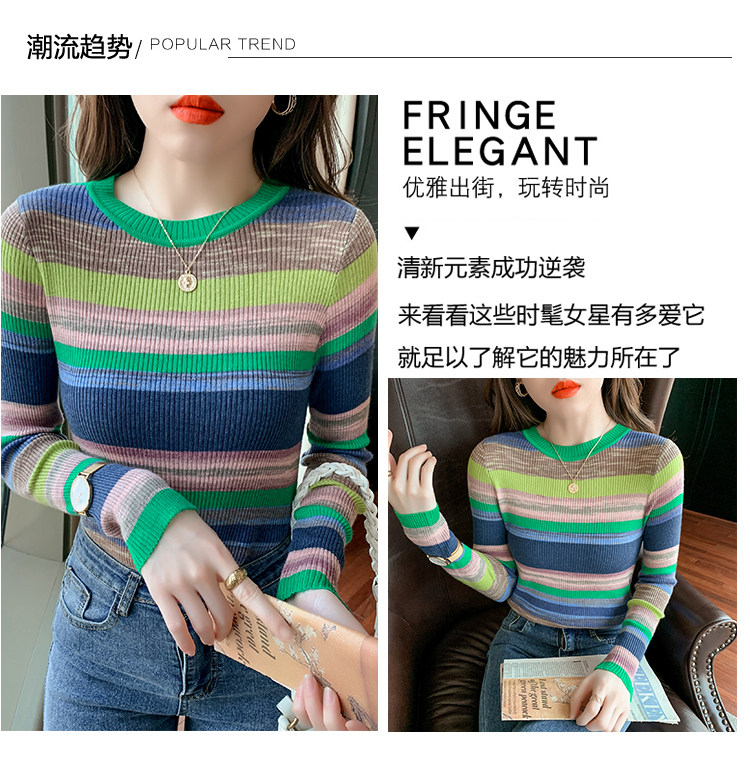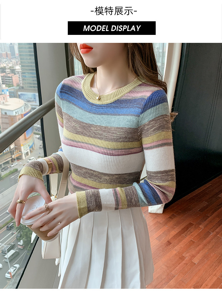RM28369#彩色条纹撞色长袖打底上衣2023新款休闲修身彩虹针织衫圆领女