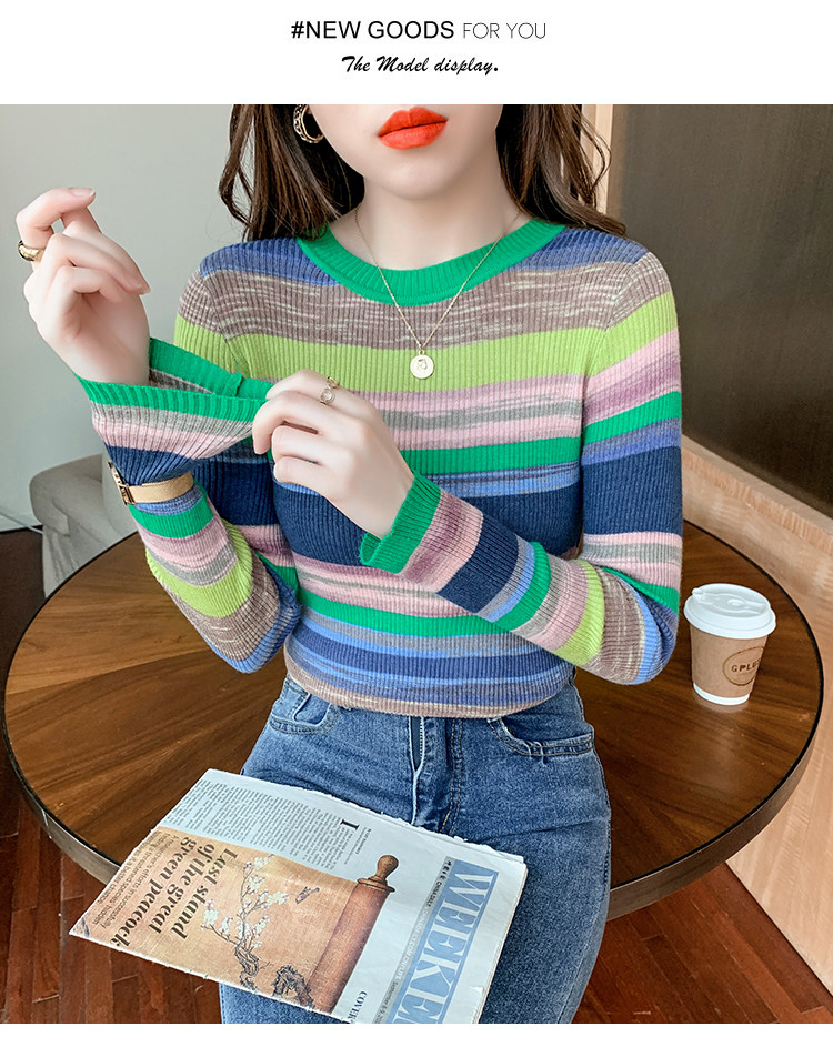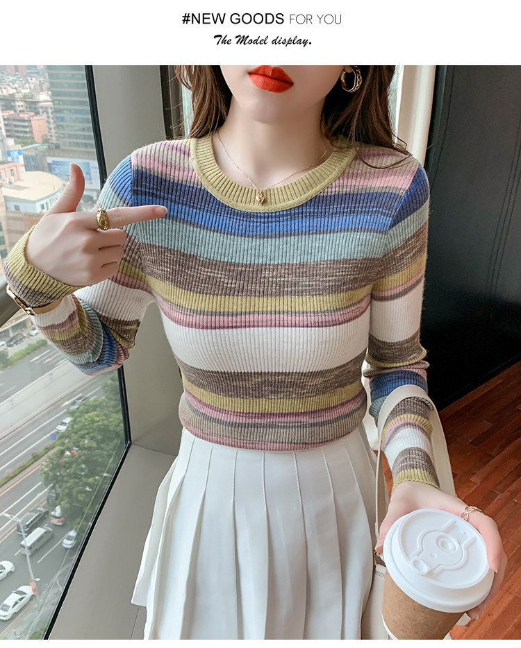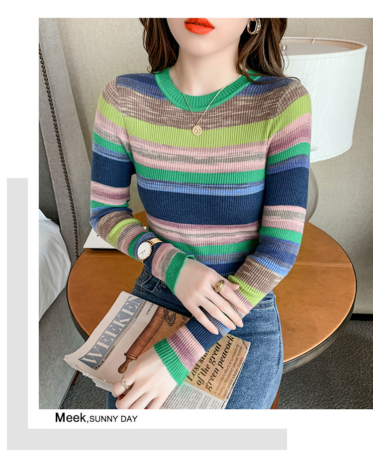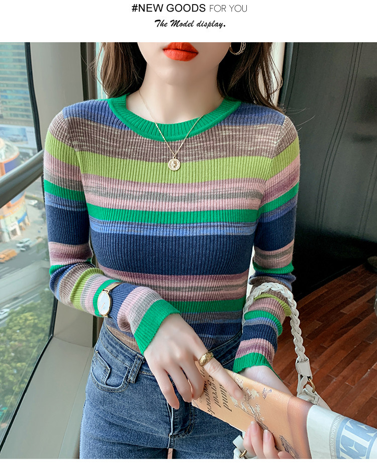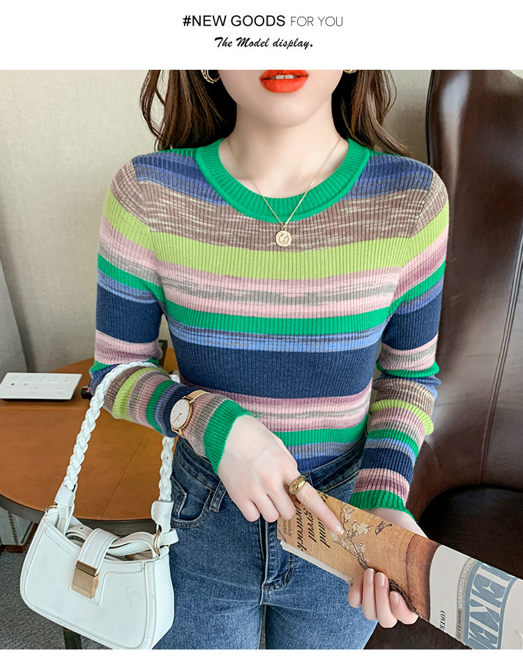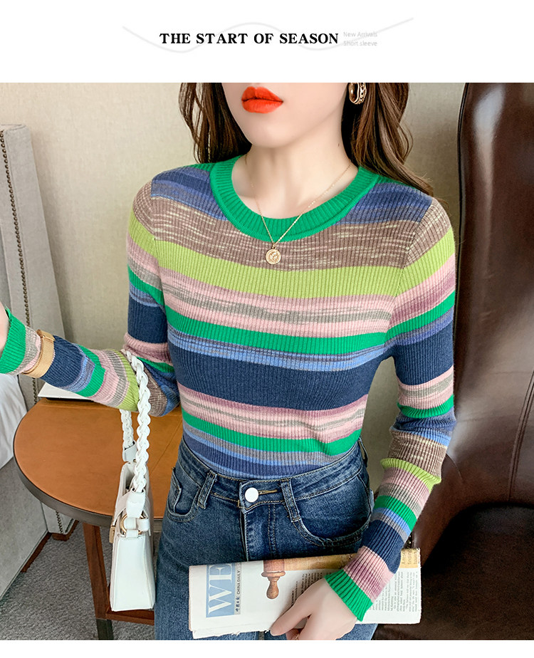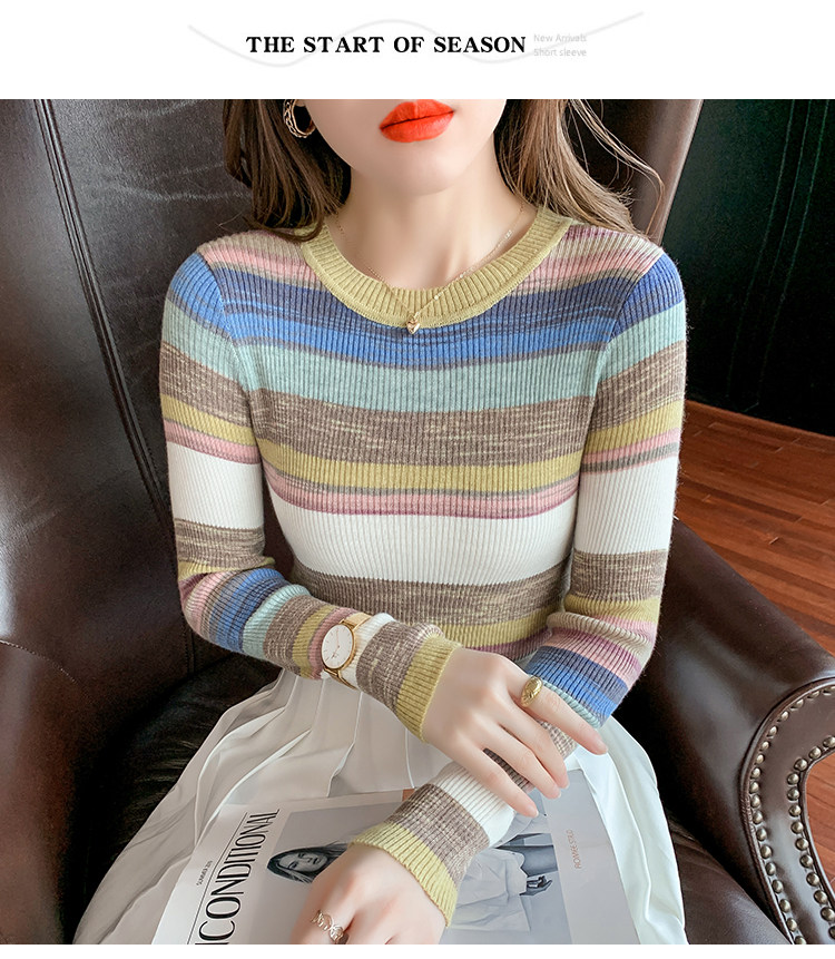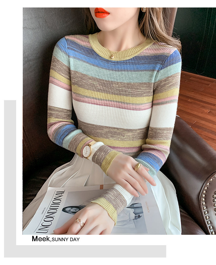 RM28369#彩色条纹撞色长袖打底上衣2023新款休闲修身彩虹针织衫圆领女